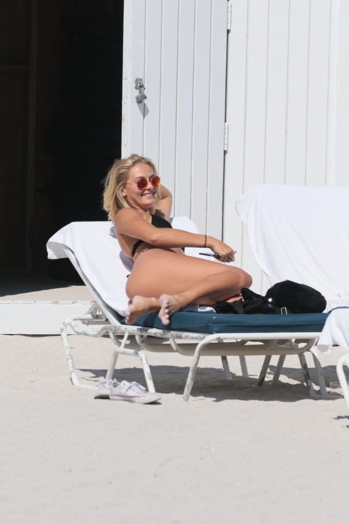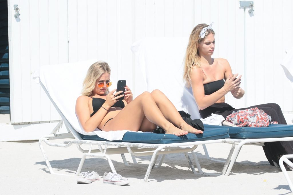 A modelo americana Selena Weber aproveita um dia com um biquíni fio dental preto na praia em Miami Beach, 07/03/2018.