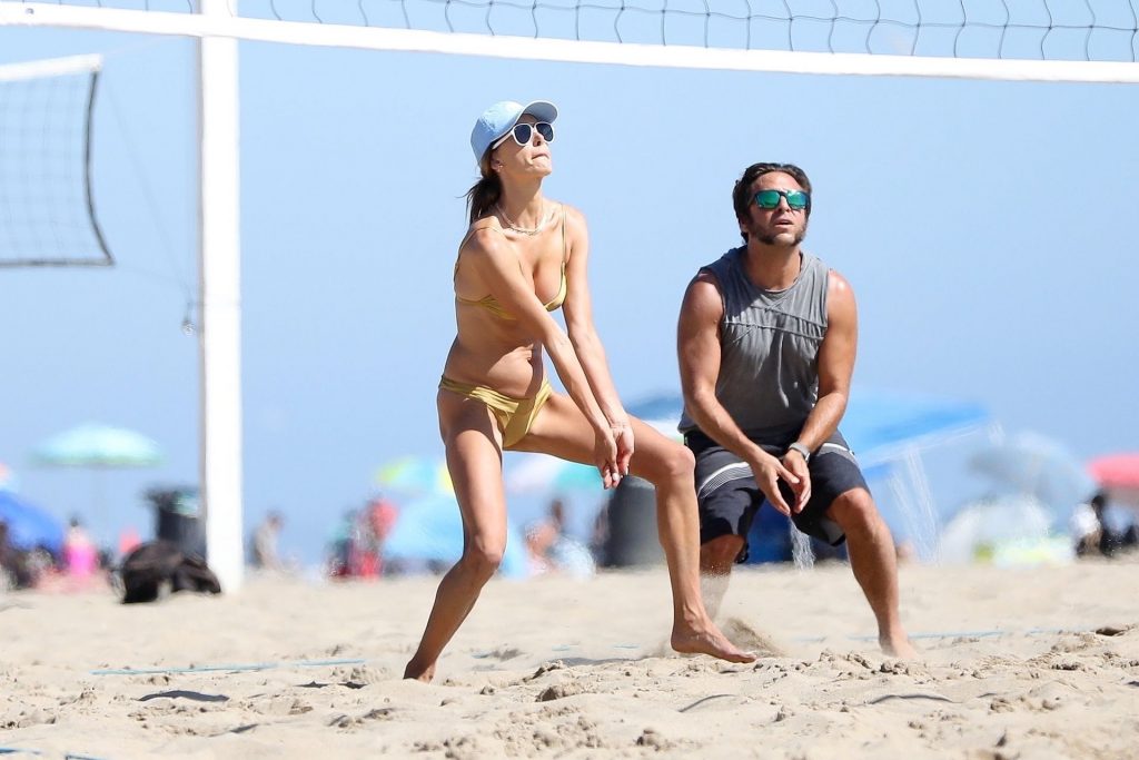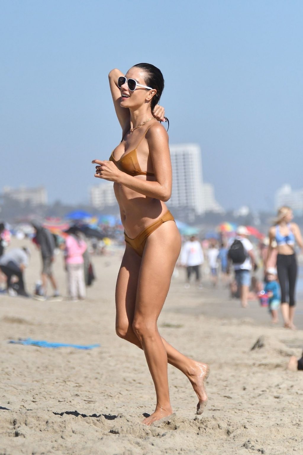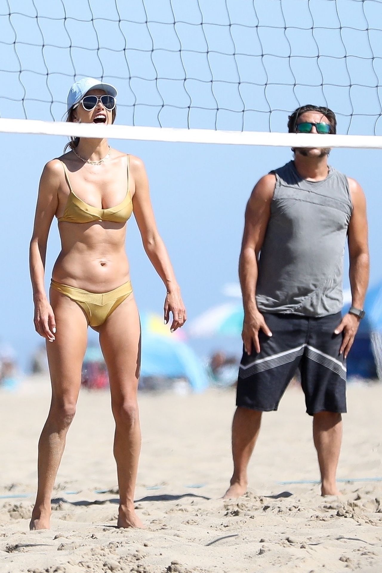 Alessandra Ambrosio exibe sua figura esguia em um biquíni dourado enquanto joga vôlei na praia com seus amigos – Malibu, CA, 01/08/2020.