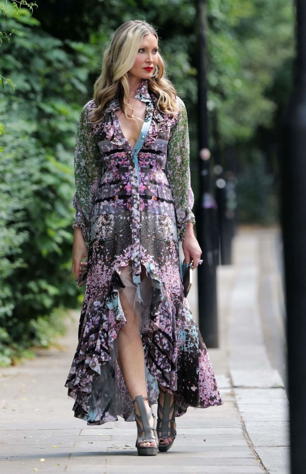 A modelo americana Caprice atende a uma ligação enquanto vai para uma reunião em West London usando um vestido floral decotado e saltos altos incríveis, 17/07/2020.