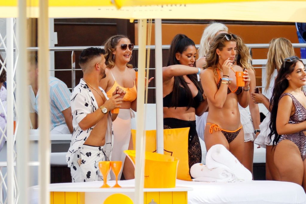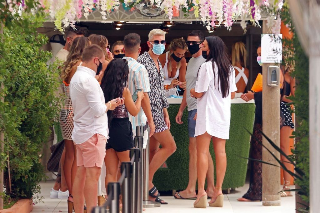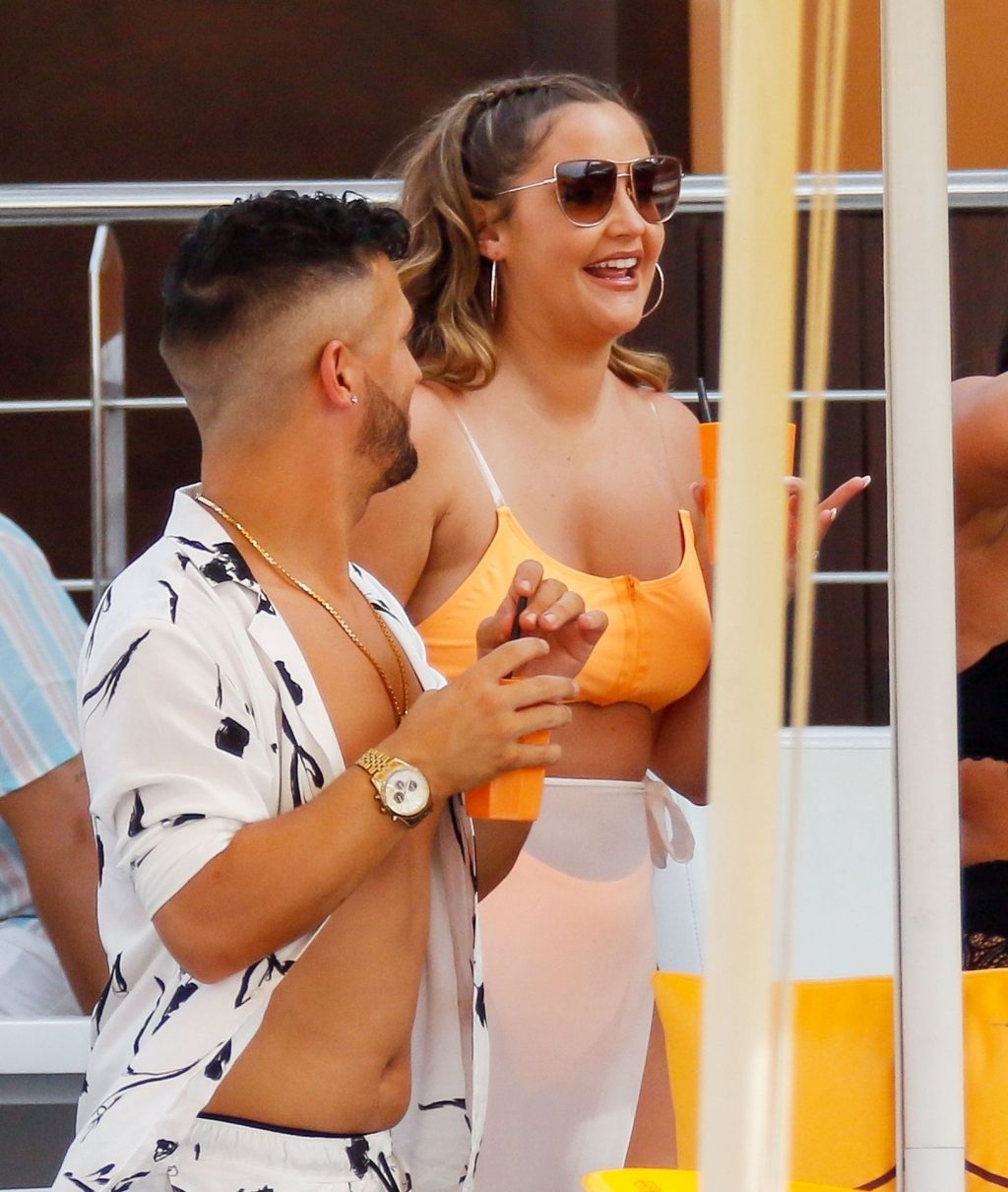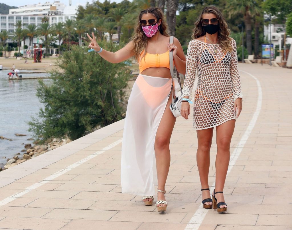 A ex-atriz de “Eastenders” e vencedora de “I’m a Celebrity Get Me Out Here” Jacqueline Jossa foi fotografada usando uma máscara facial protetora e aproveitando bebidas com amigos enquanto festejava no O Beach em Ibiza, 14/07/2020.