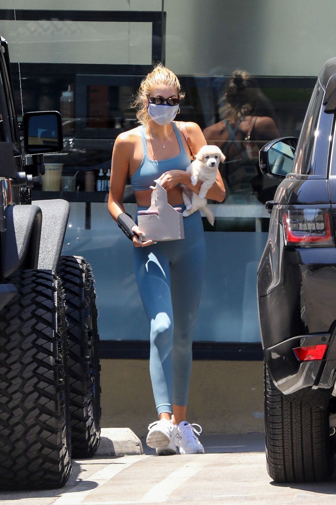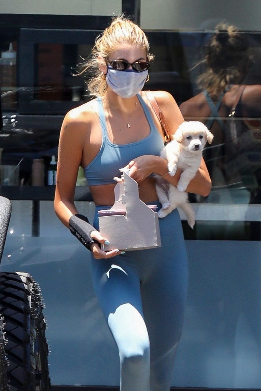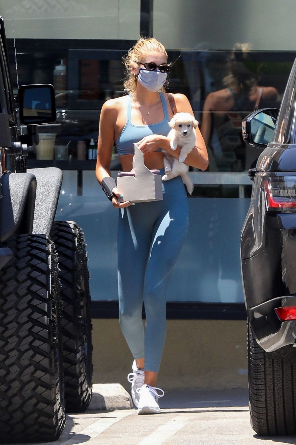 Kaia Gerber leva seu cachorrinho para tomar um suco após um treino na academia para cães, 07/07/2020. Kaia Gerber tem cuidado de cachorrinhos em sua residência em Malibu enquanto se autoisolava durante a pandemia do coronavírus.