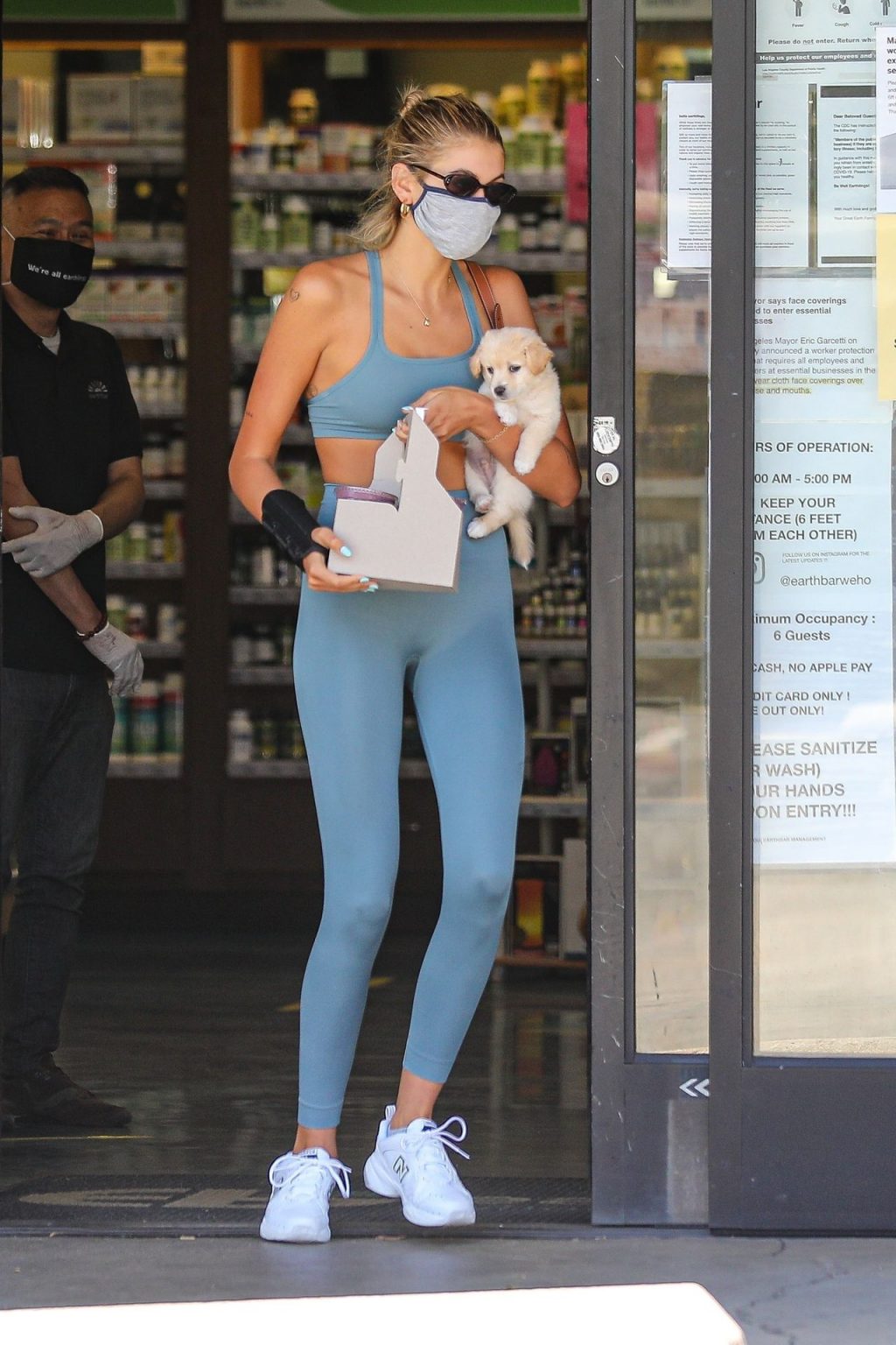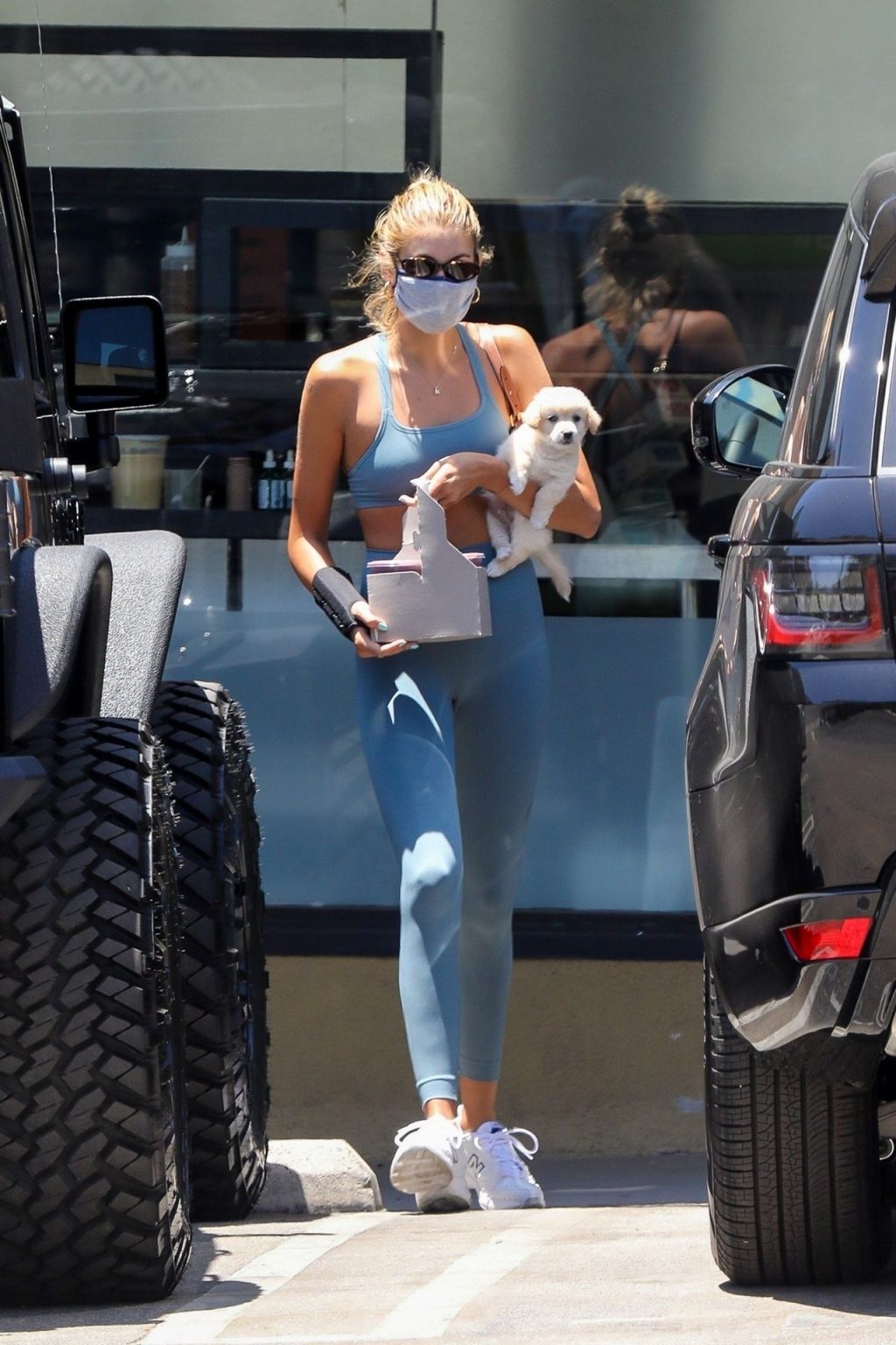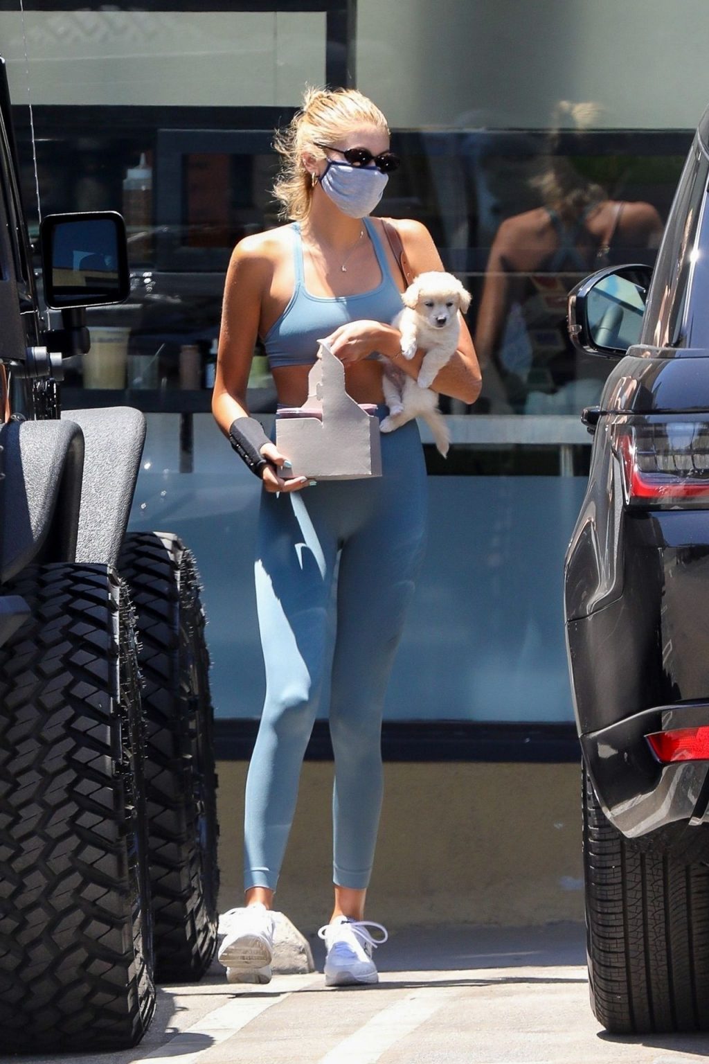 Kaia Gerber leva seu cachorrinho para tomar um suco após um treino na academia para cães, 07/07/2020. Kaia Gerber tem cuidado de cachorrinhos em sua residência em Malibu enquanto se autoisolava durante a pandemia do coronavírus.