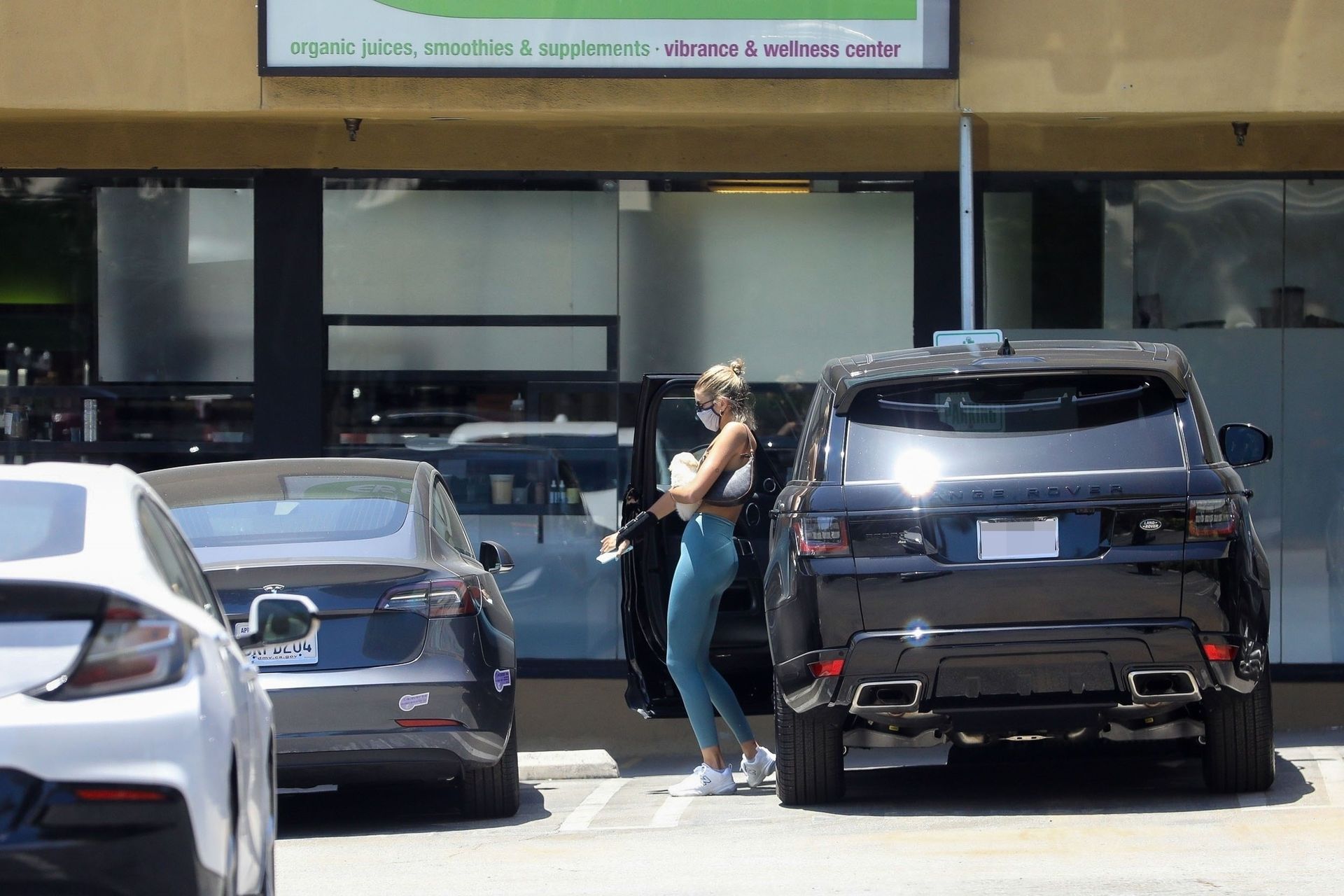 A supermodelo usava uma munhequeira e carregava o adorável filhote com ela, colocando seu telefone na legging esportiva e segurando o suporte de copo na outra mão.