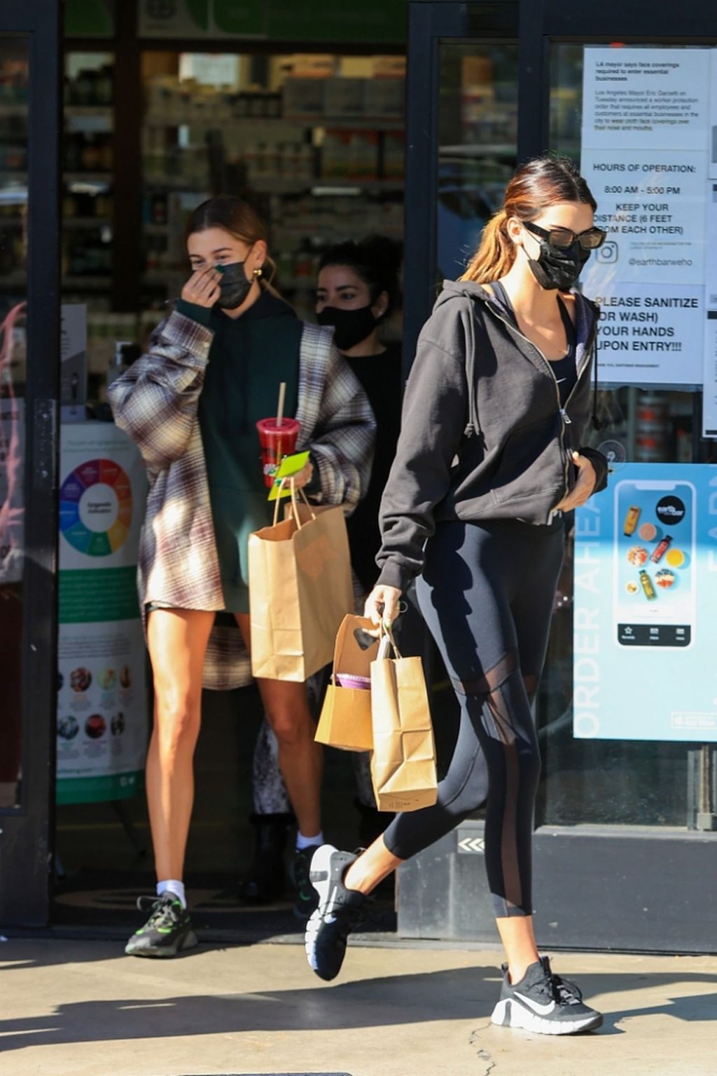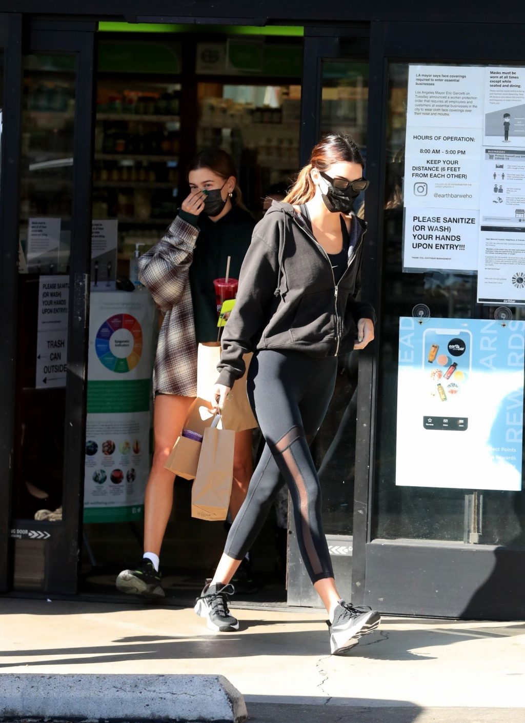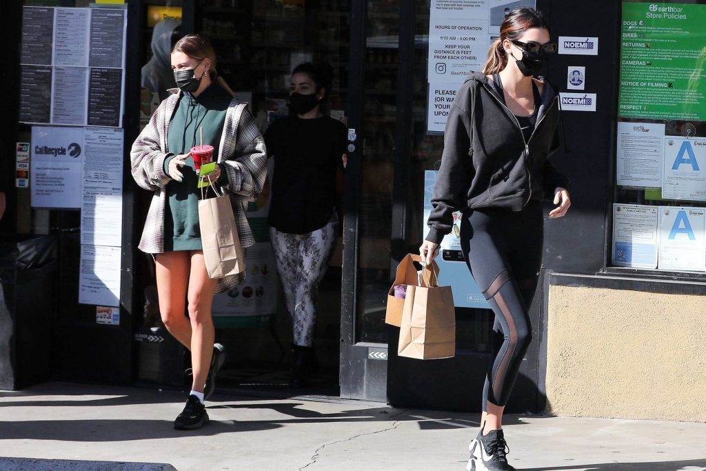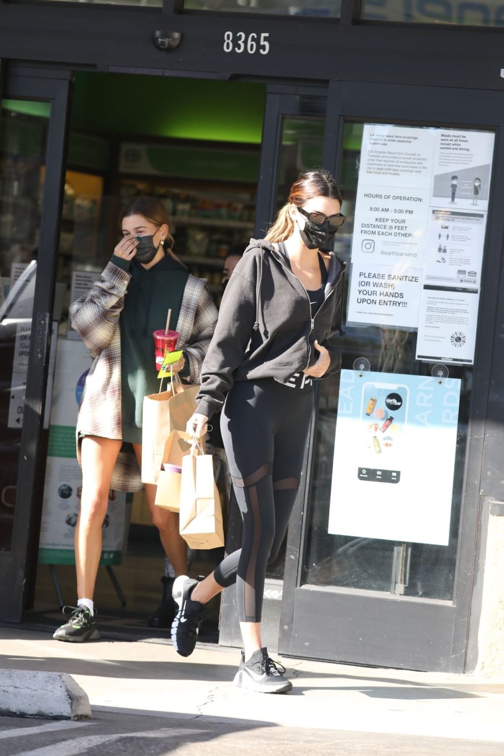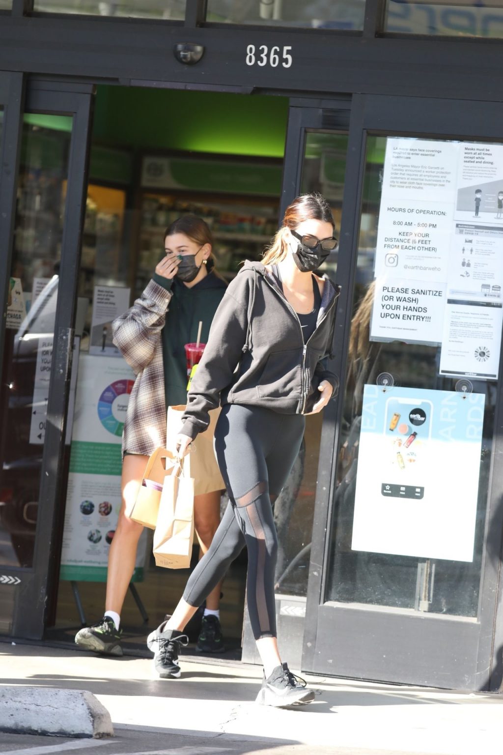 Kendall Jenner exibe seu abdômen definido e cameltoe enquanto ela e a amiga Hailey Bieber foram vistas tomando smoothies após o treino em West Hollywood, 27/10/2020.