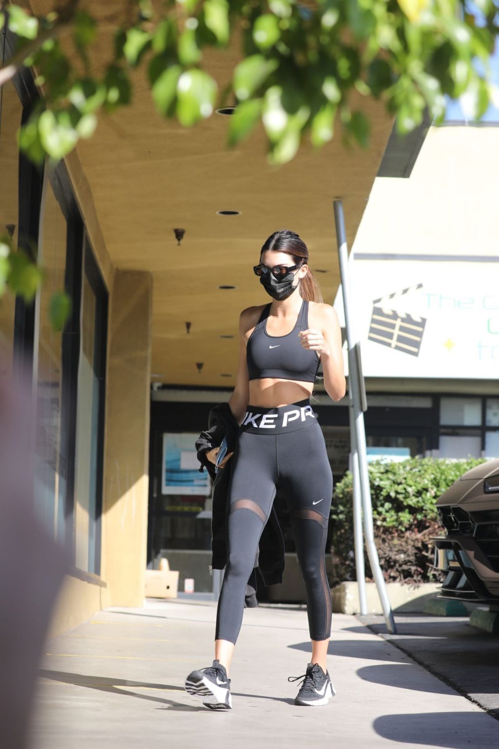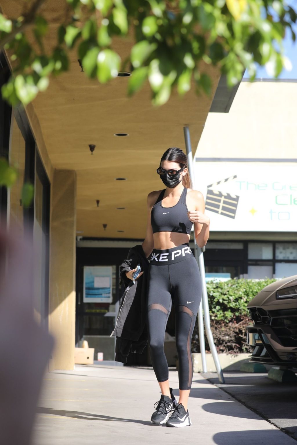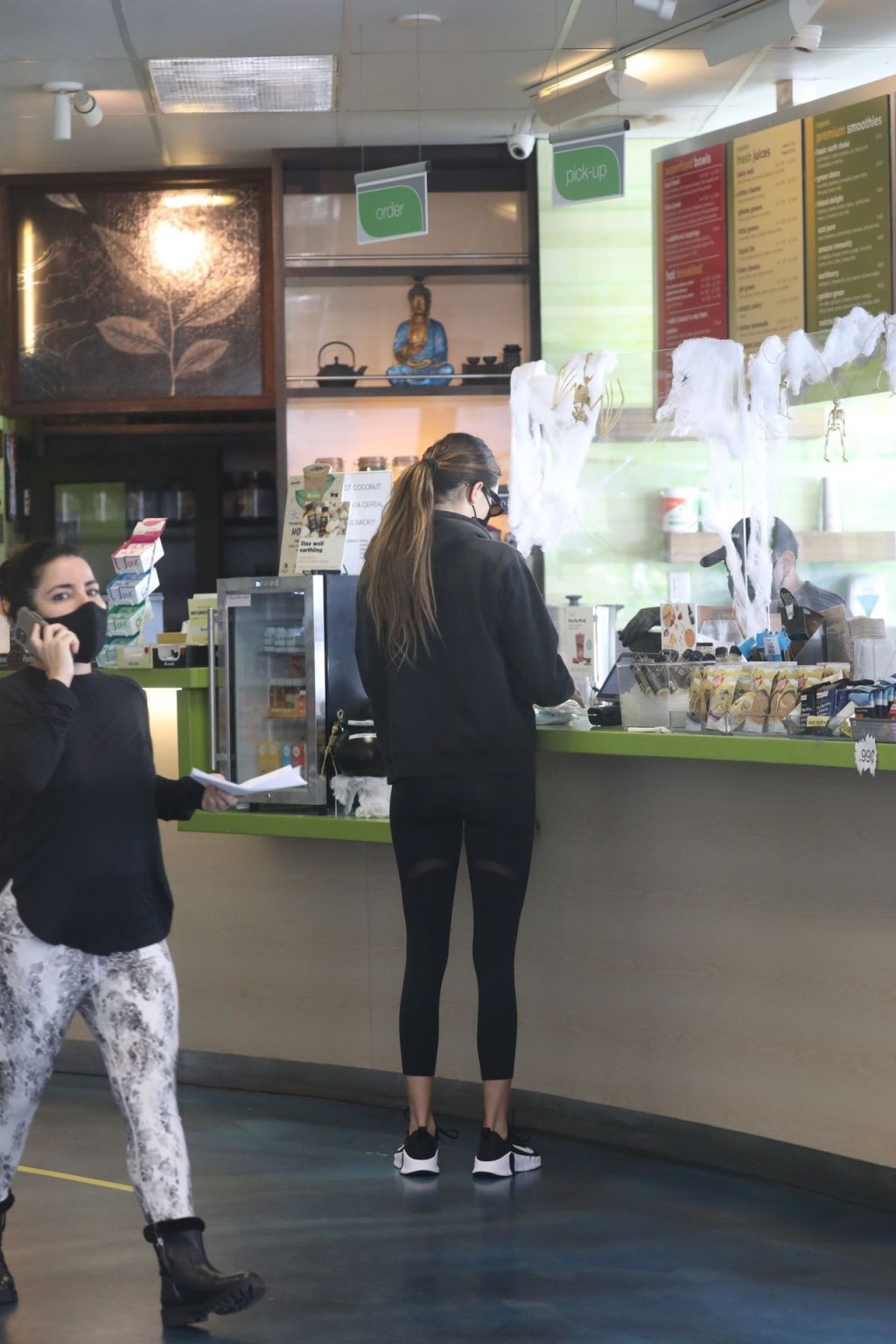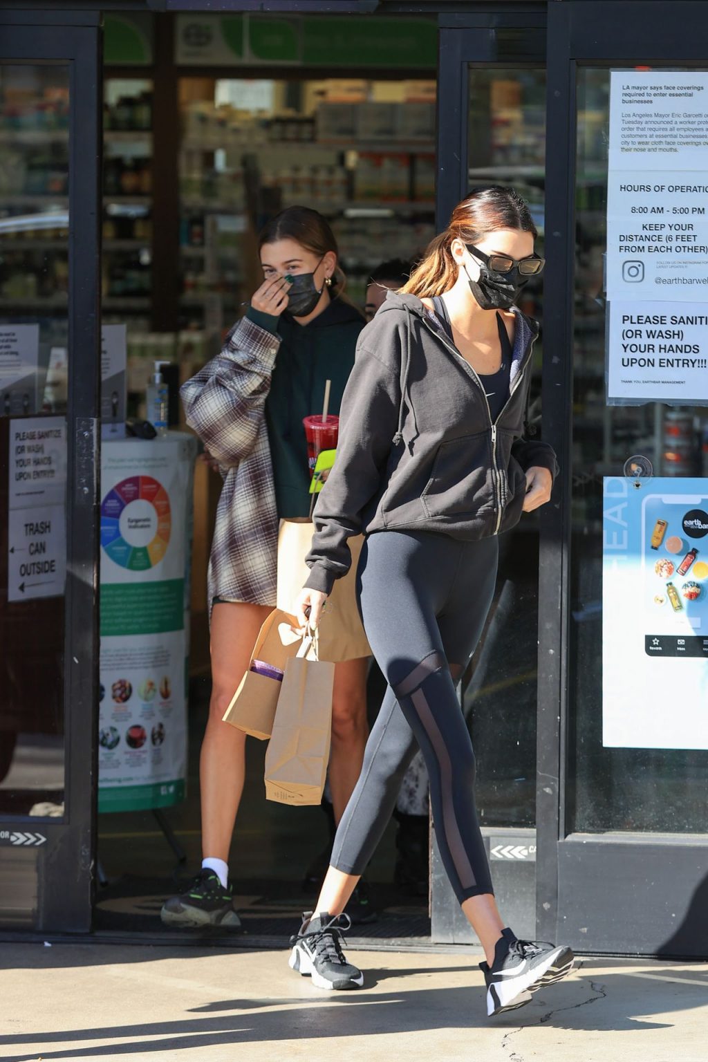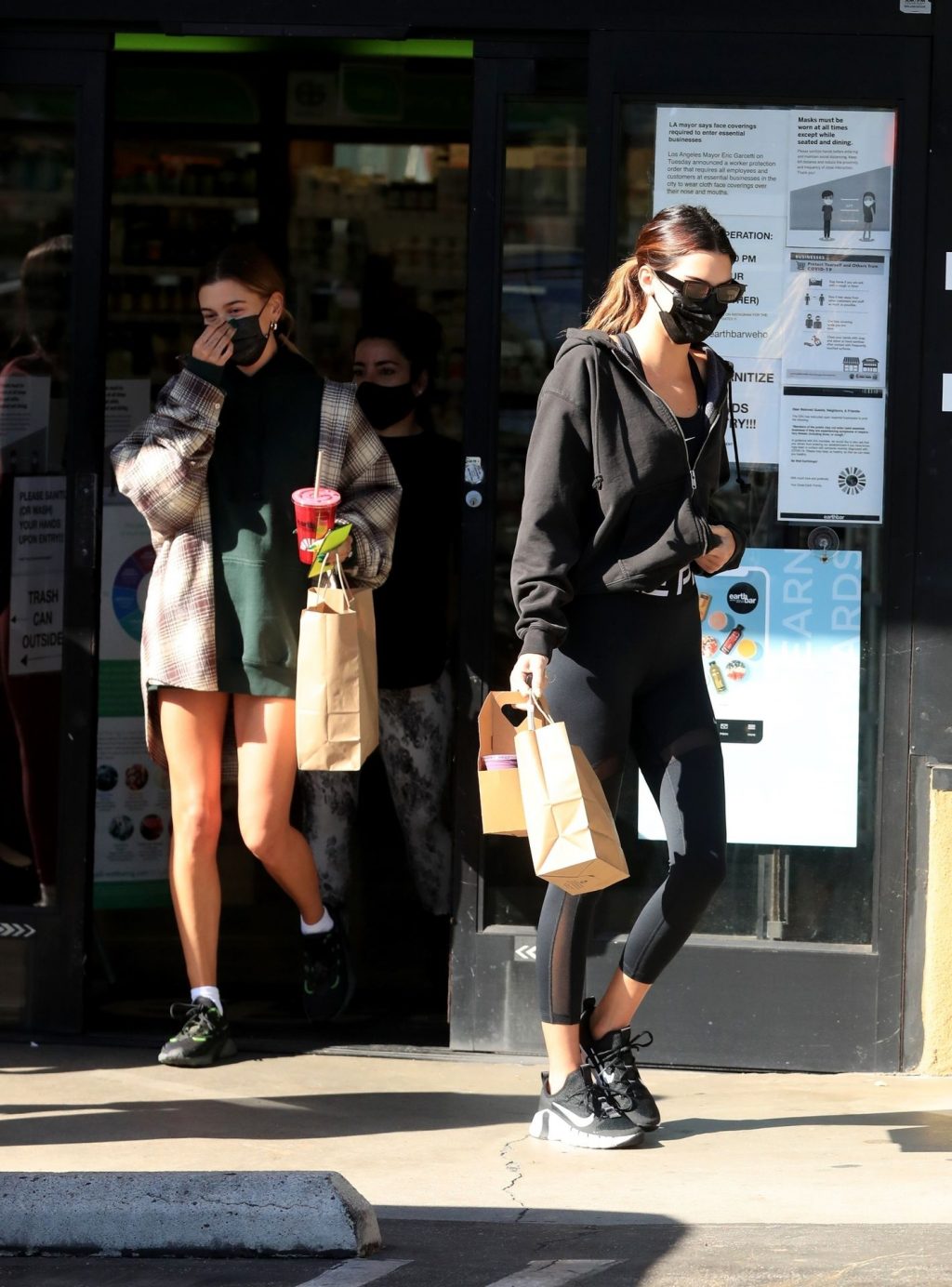 Kendall Jenner exibe seu abdômen definido e cameltoe enquanto ela e a amiga Hailey Bieber foram vistas tomando smoothies após o treino em West Hollywood, 27/10/2020.