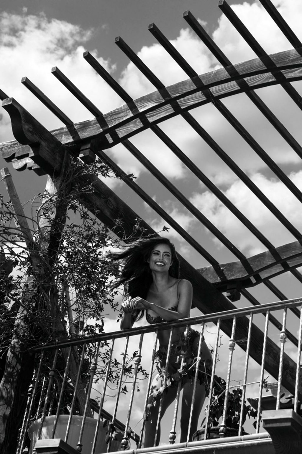Renee posa em locação nas colinas de Malibu. Inspirados em ensaios de moda dos anos 1980 e 1990, os designs incluem renda azul, acabamento em cetim e ferragens douradas.
