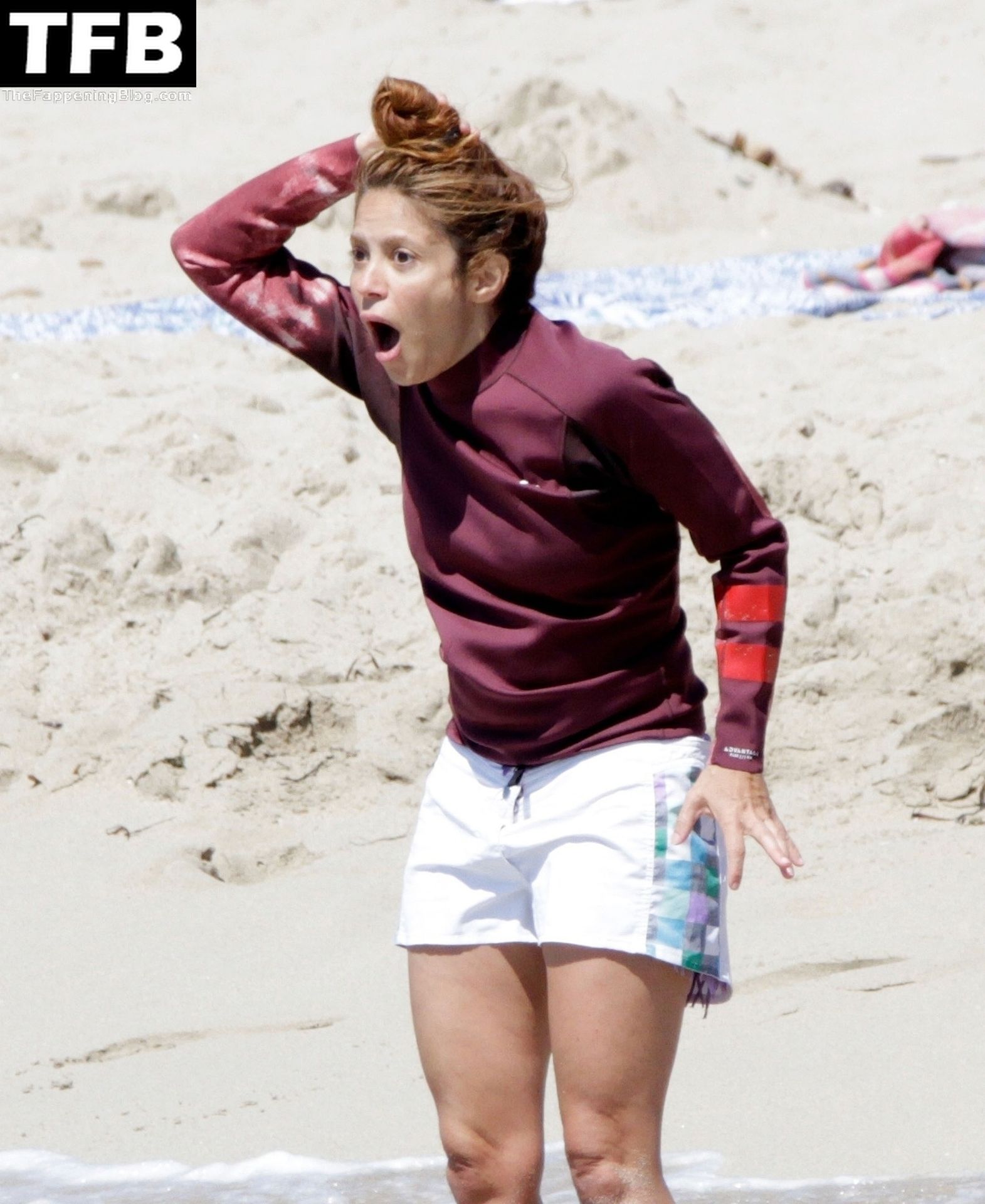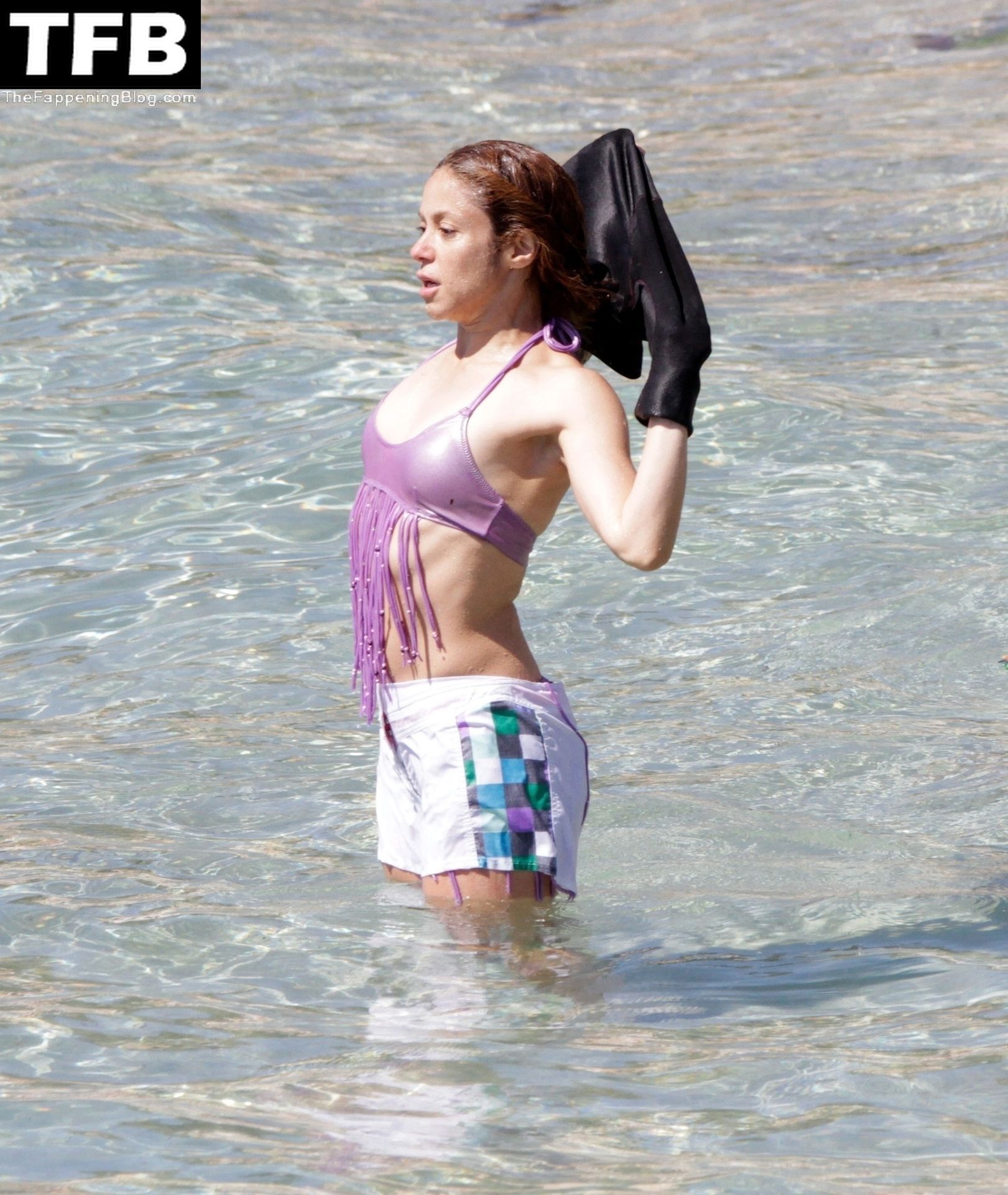 A superestrela colombiana Shakira exibe seu corpo tonificado na praia com um biquíni roxo enquanto aproveita momentos divertidos na praia com seus filhos em Ibiza, 08/05/2022.