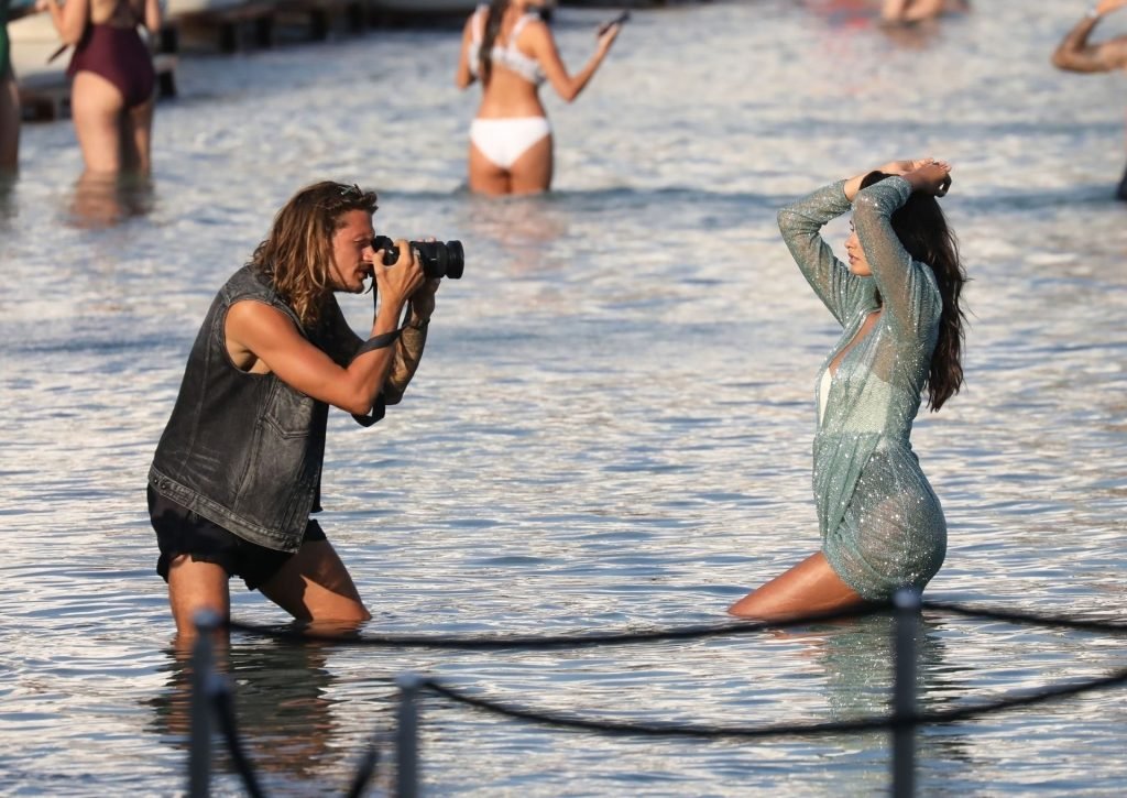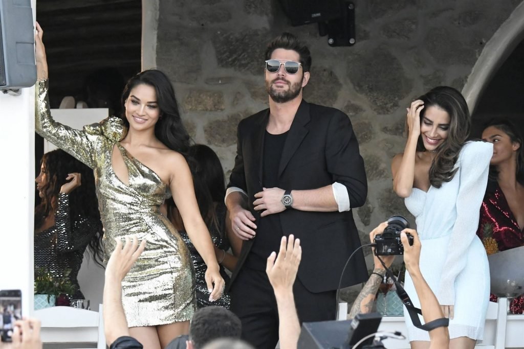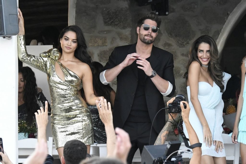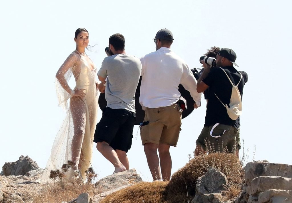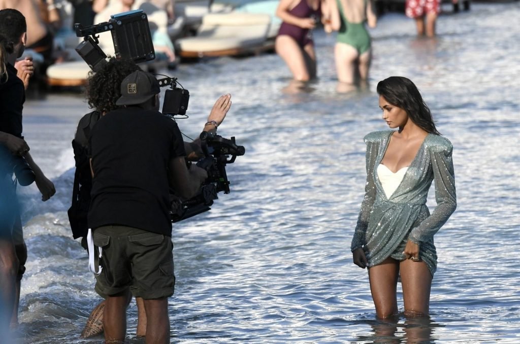Modelos de lingerie sexy Shanina Shaik, Gizele Oliveira e Jessica Kahawaty com o ator canadense Nick Bateman exibindo seu estilo enquanto filmam em vários locais com diferentes roupas sensuais durante a gravação de um vídeo comercial na praia de Psarou, Nammos em Mykonos, 09/05/2019.