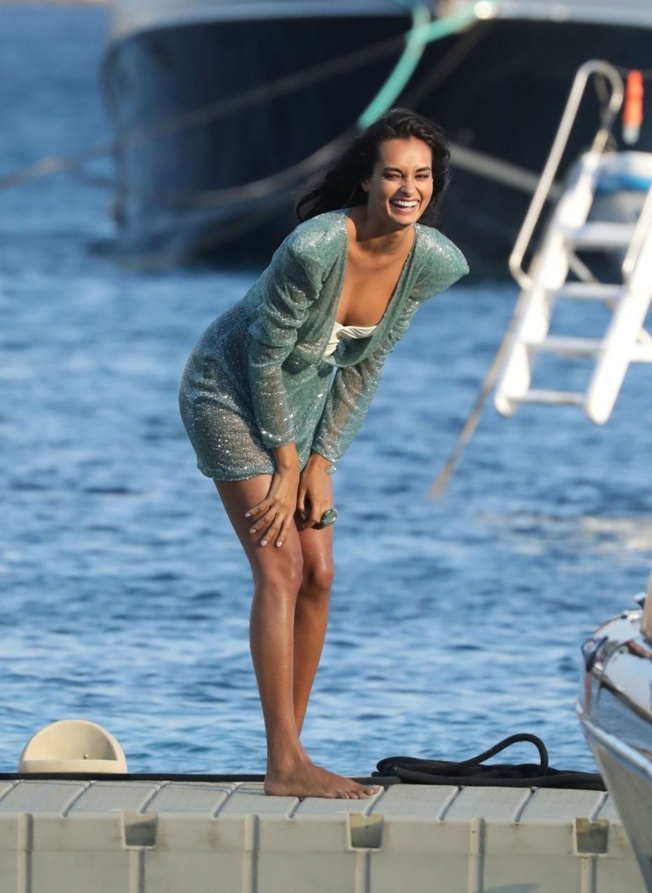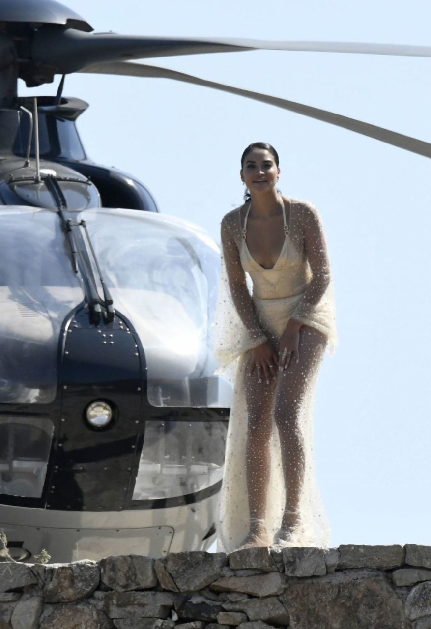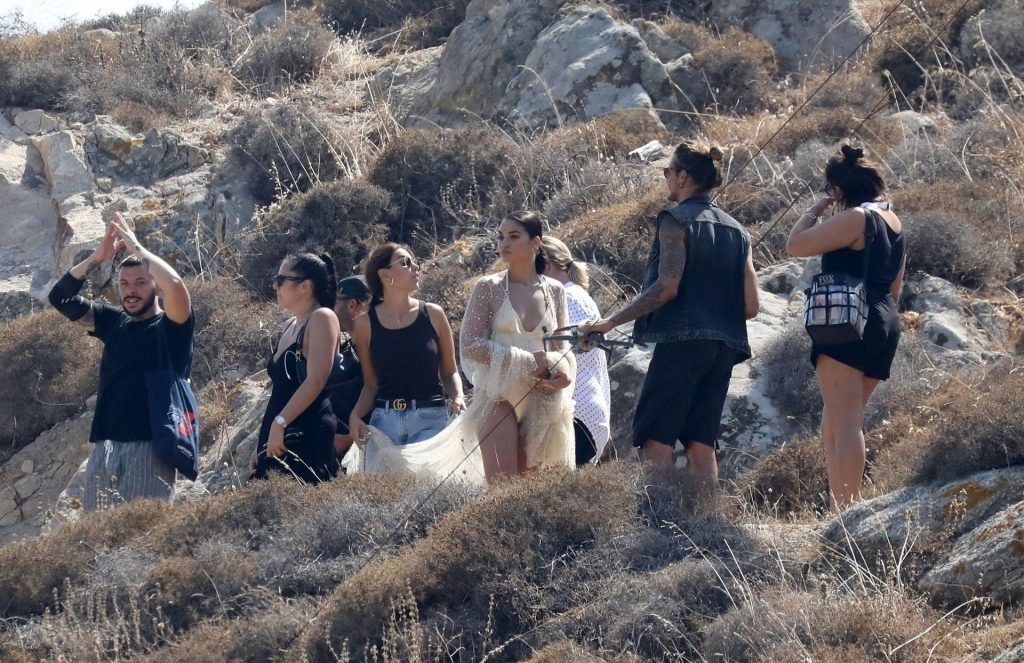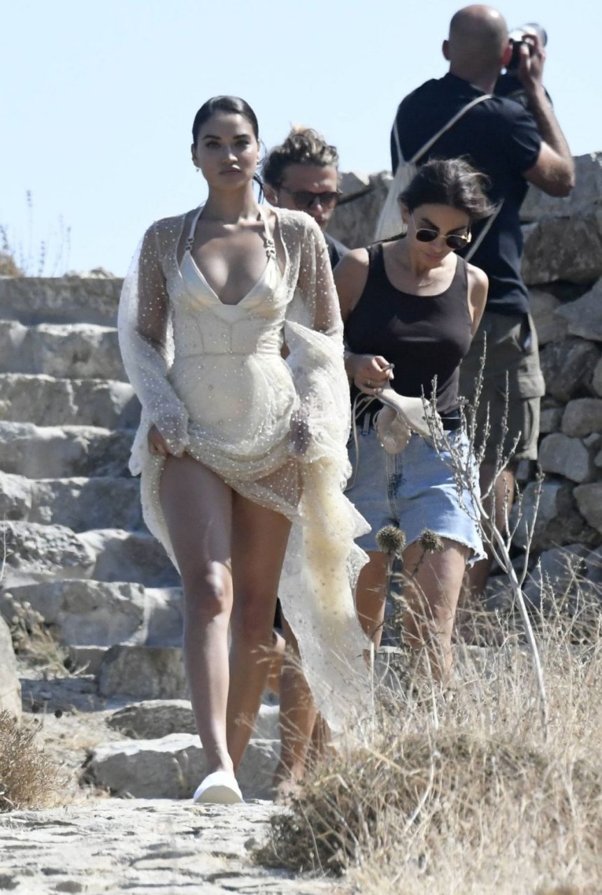 Modelos de lingerie sexy Shanina Shaik, Gizele Oliveira e Jessica Kahawaty com o ator canadense Nick Bateman exibindo seu estilo enquanto filmam em vários locais com diferentes roupas sensuais durante a gravação de um vídeo comercial na praia de Psarou, Nammos em Mykonos, 09/05/2019.