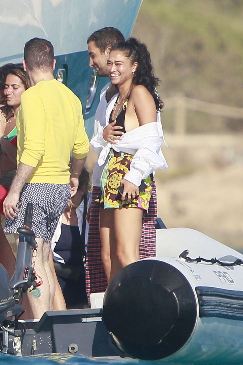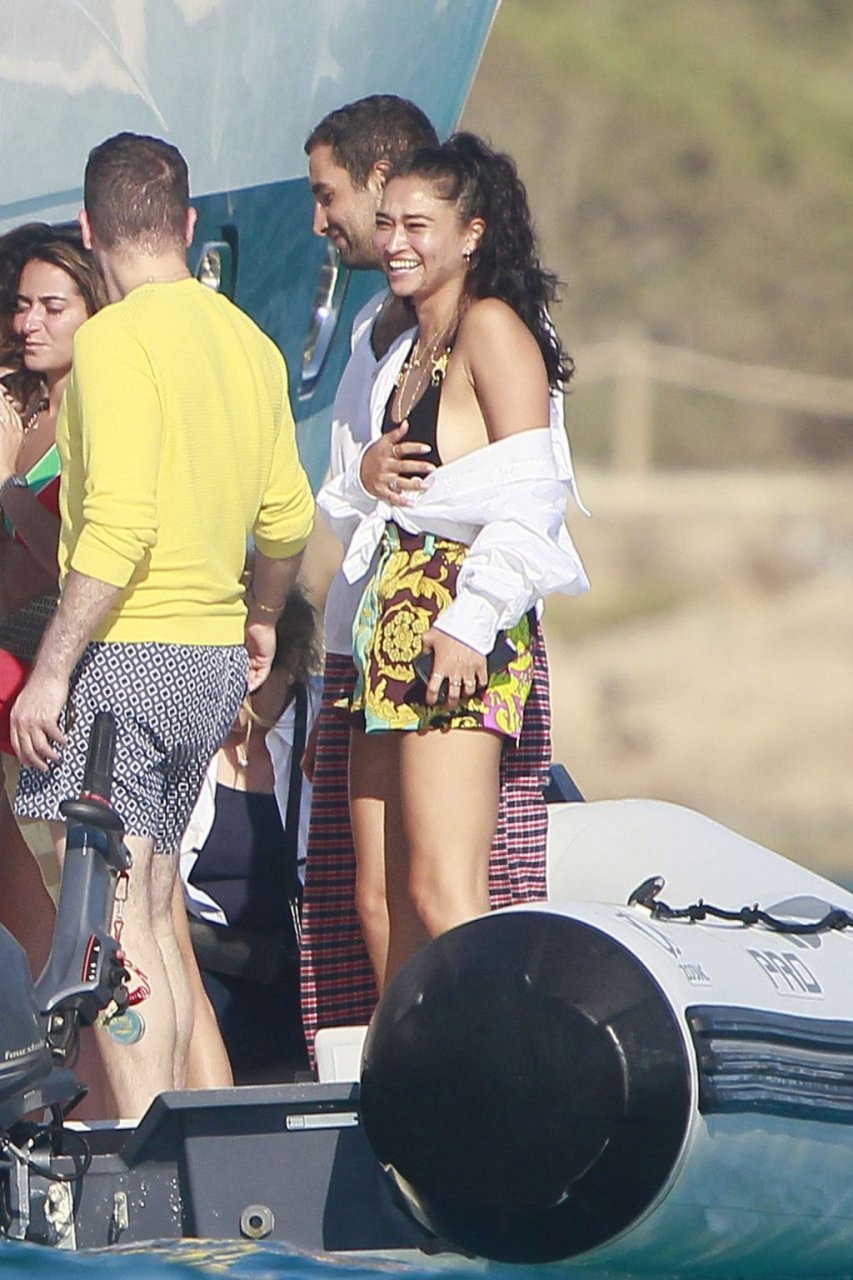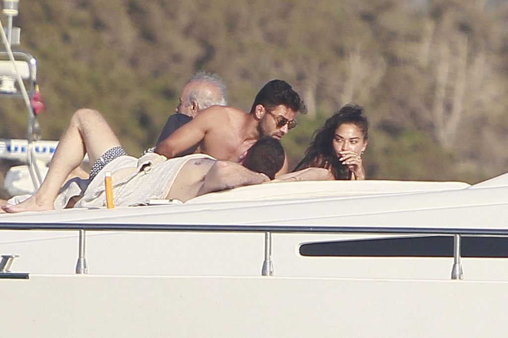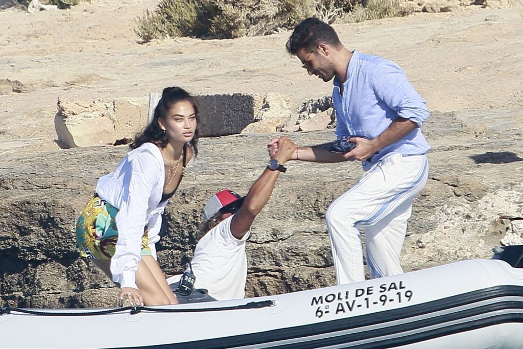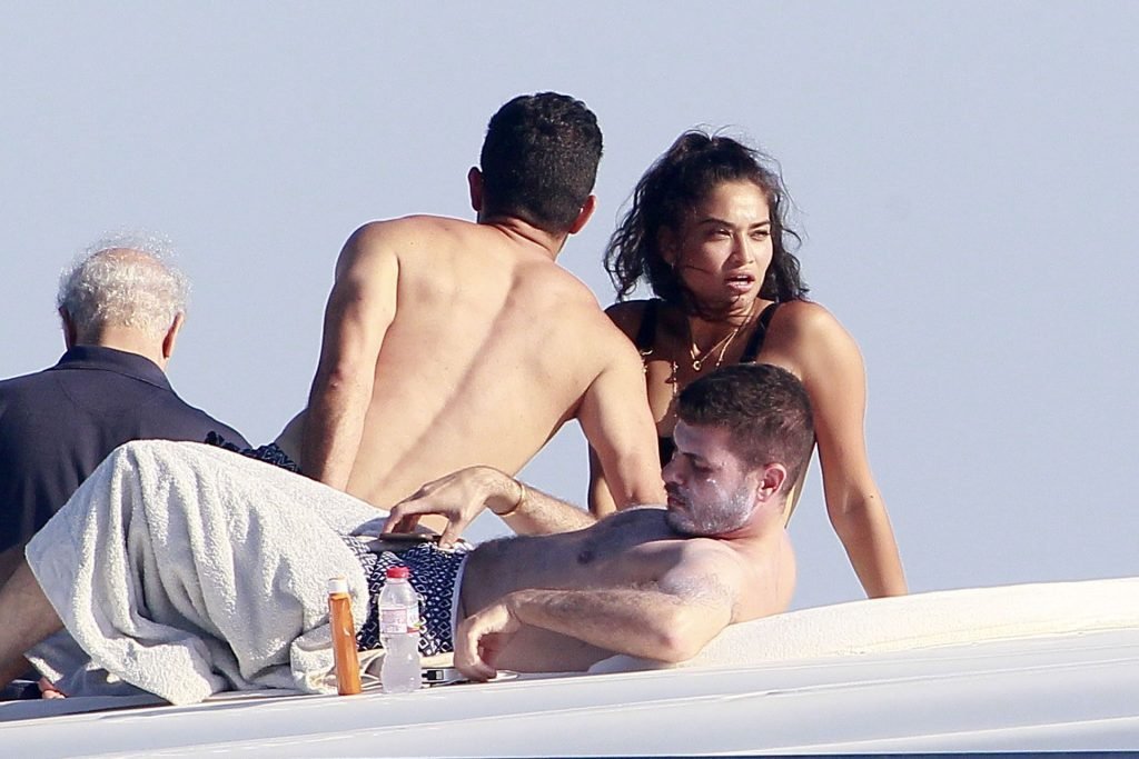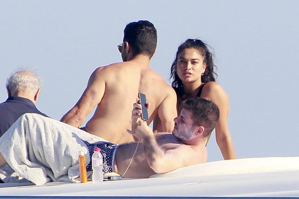 Model Shanina Shaik aproveita mais um dia a bordo de um iate com amigos e um homem desconhecido em Formentera, Espanha, 16/08/2019.