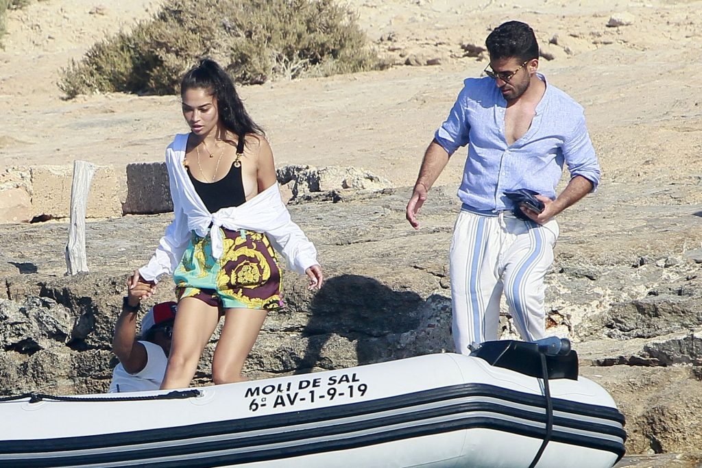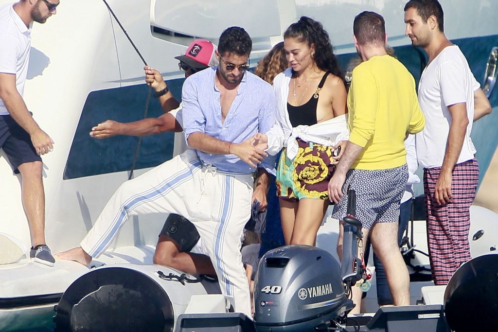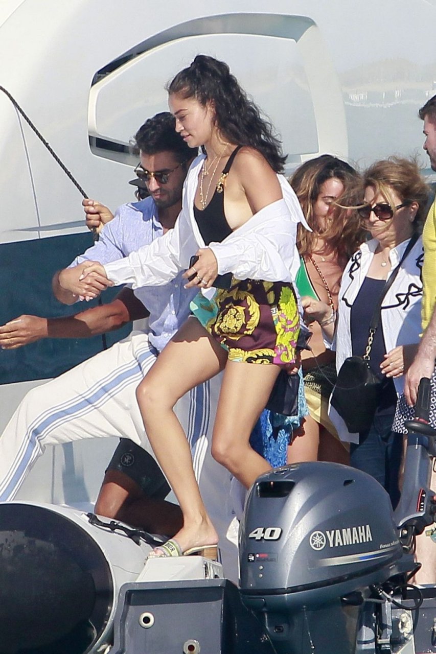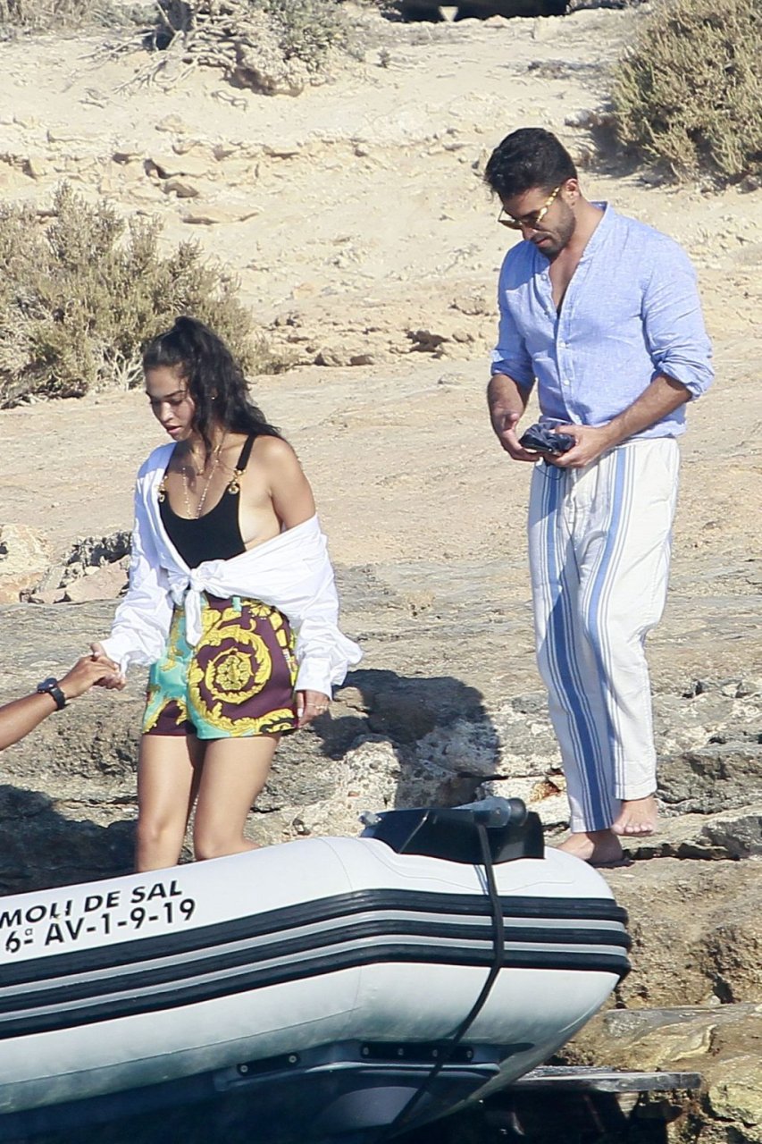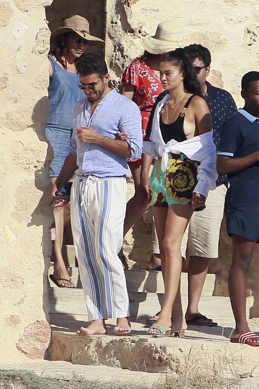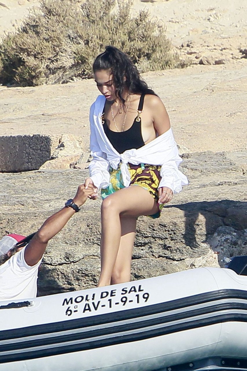Model Shanina Shaik aproveita mais um dia a bordo de um iate com amigos e um homem desconhecido em Formentera, Espanha, 16/08/2019.