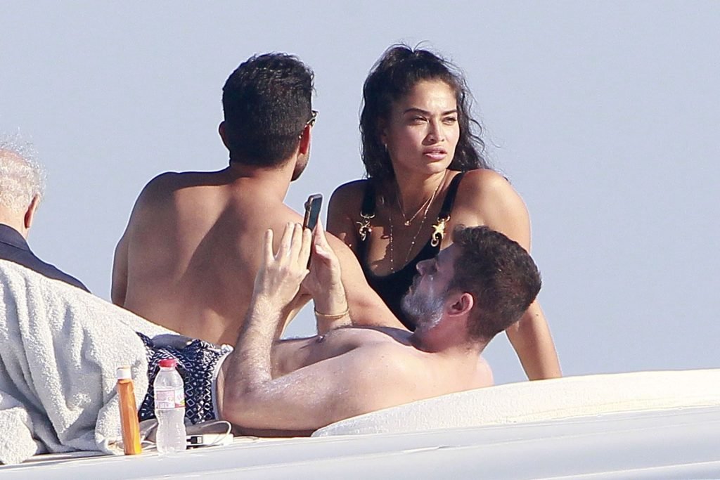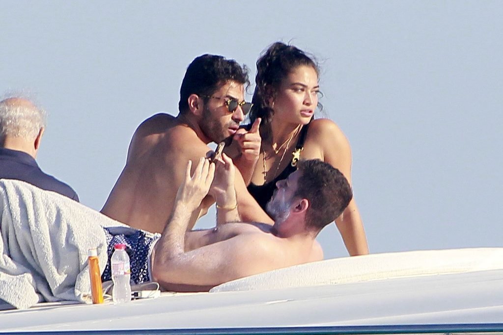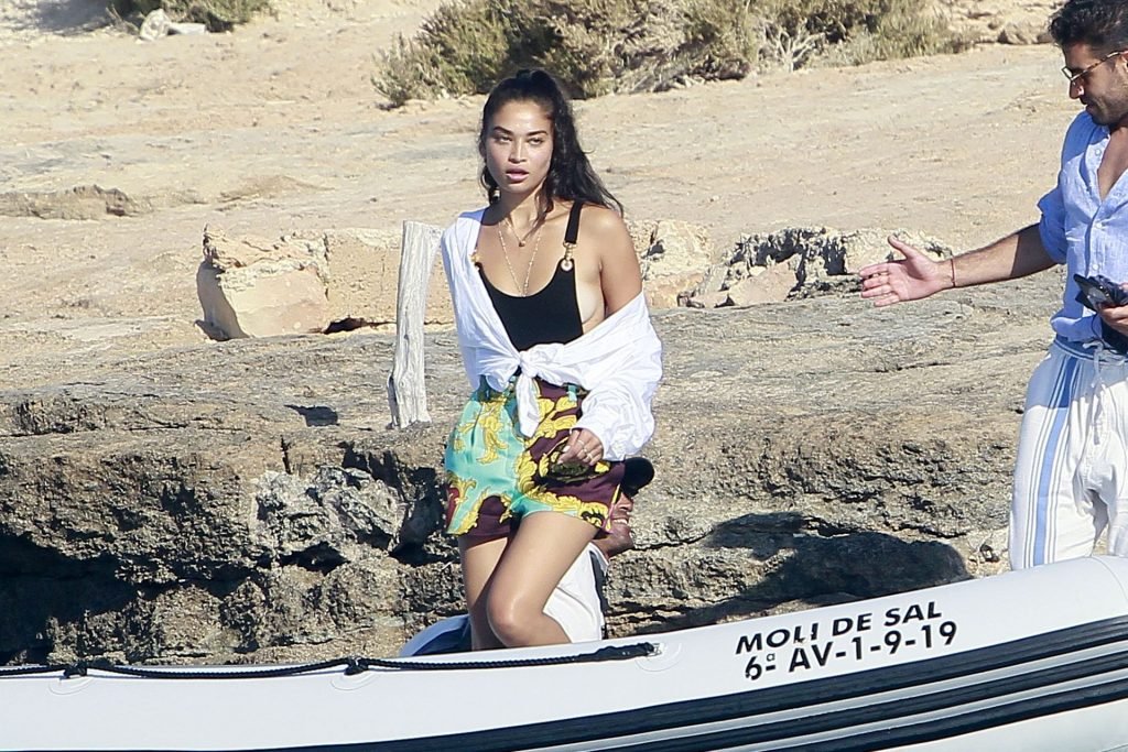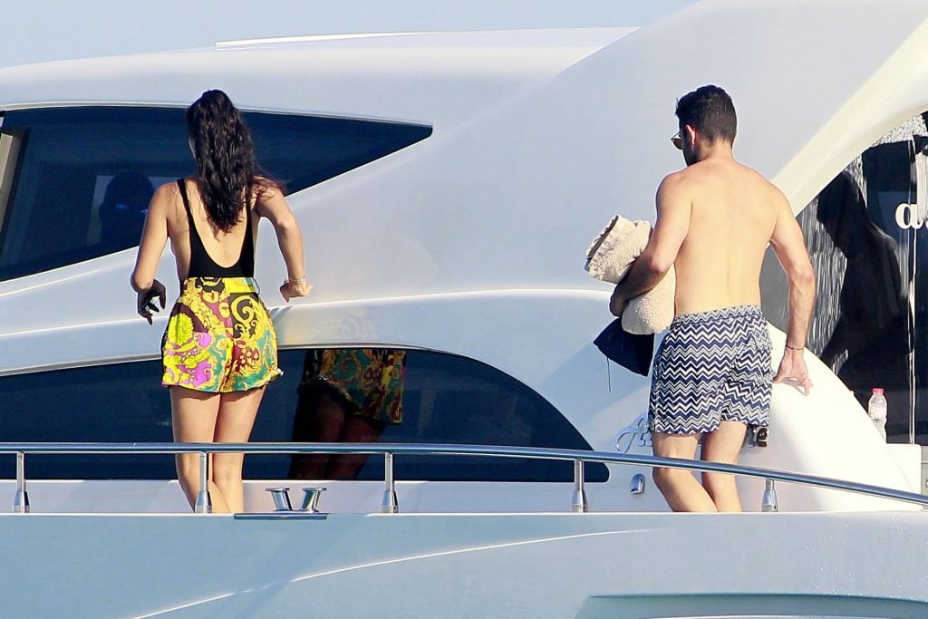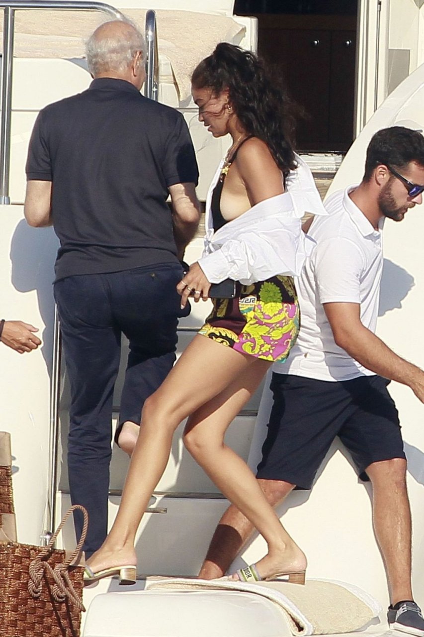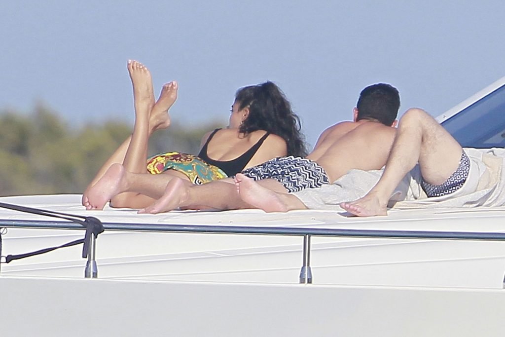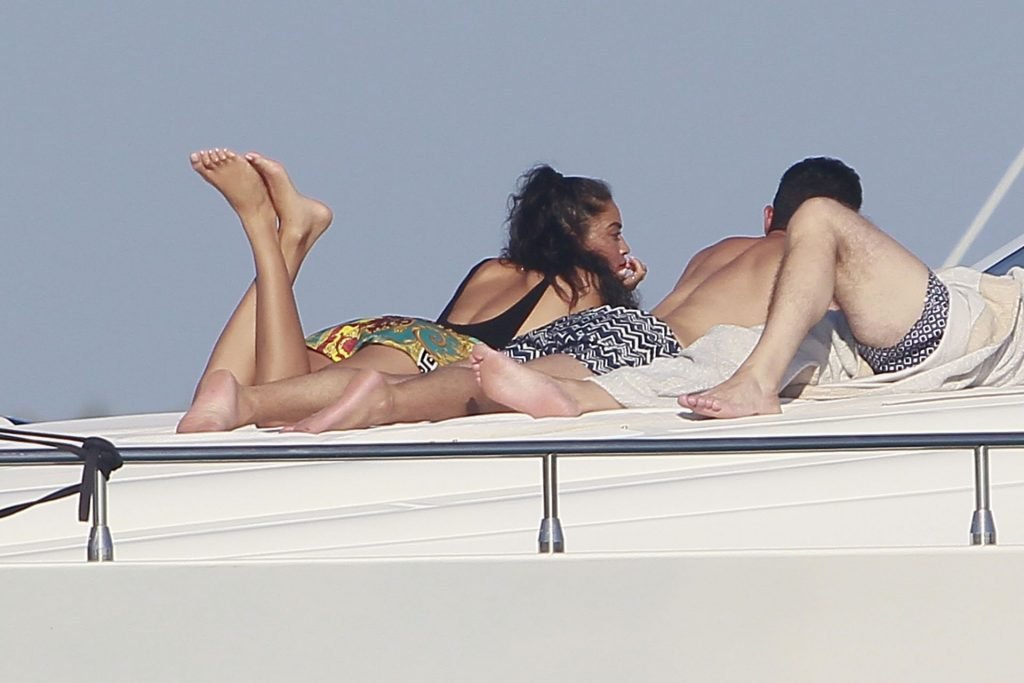 Model Shanina Shaik aproveita mais um dia a bordo de um iate com amigos e um homem desconhecido em Formentera, Espanha, 16/08/2019.