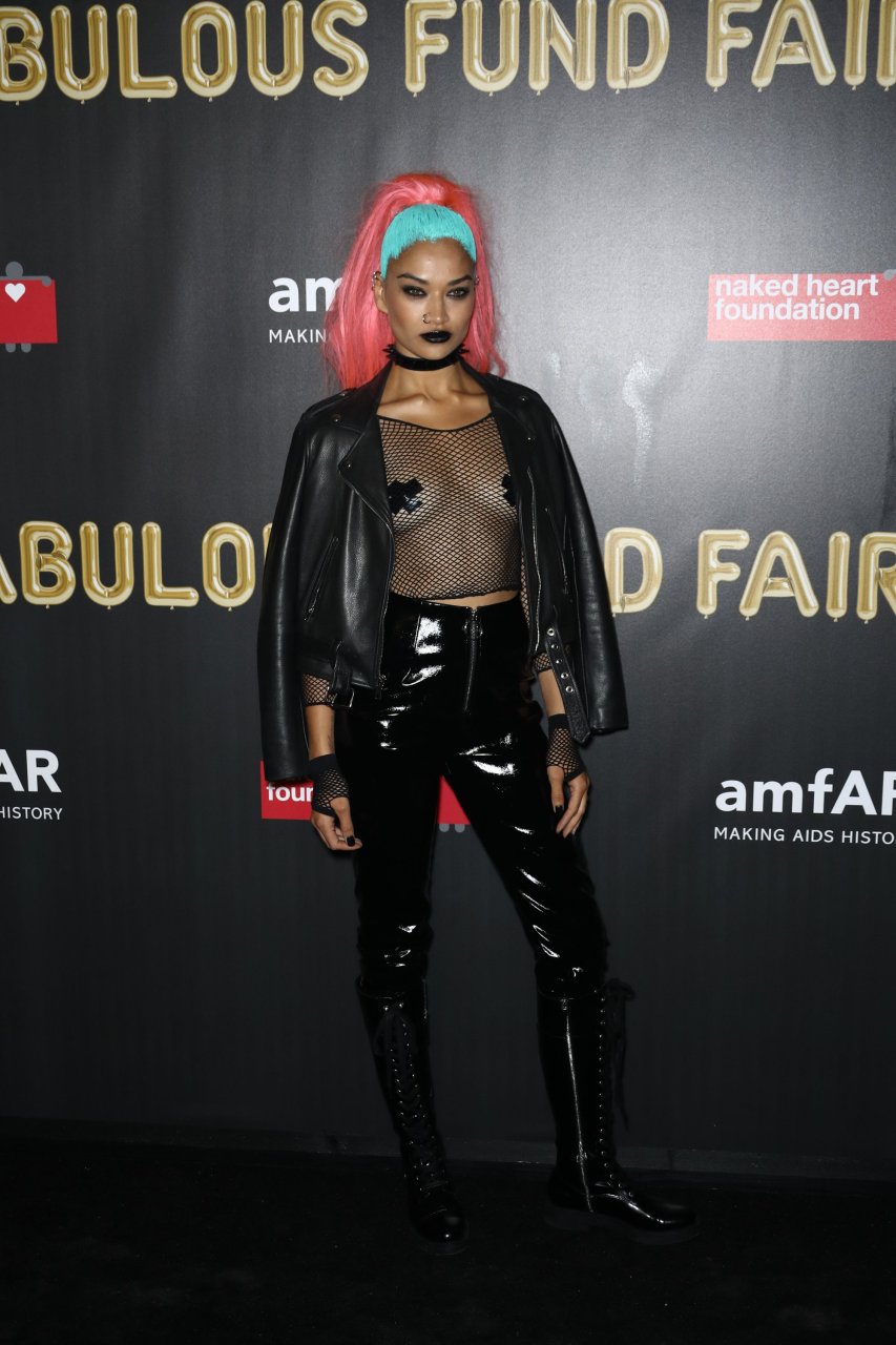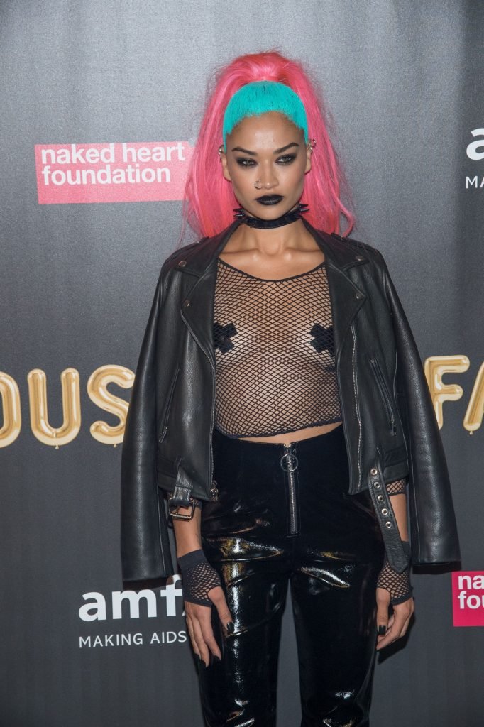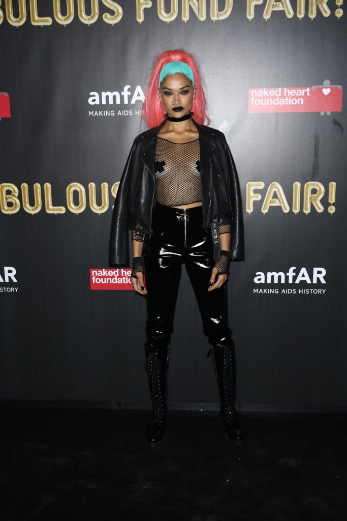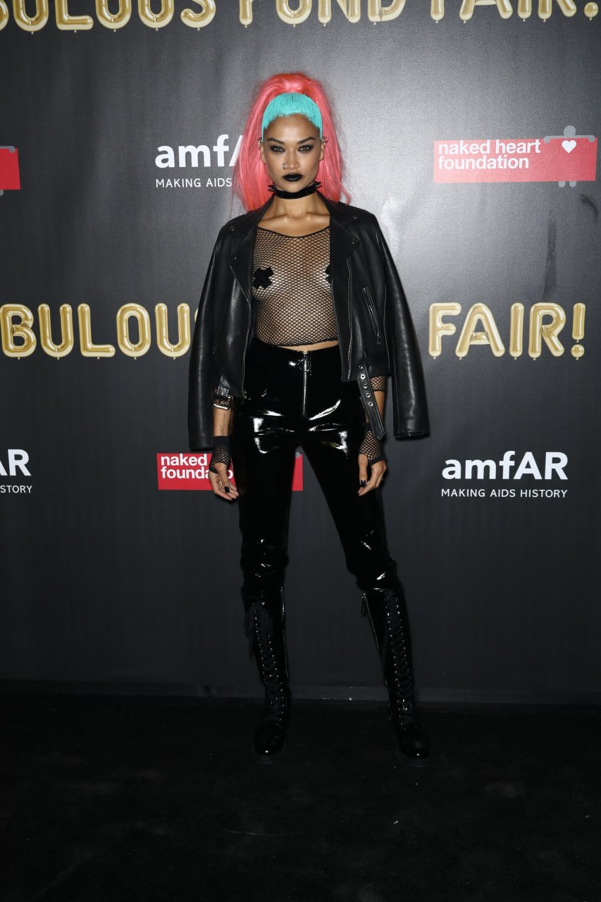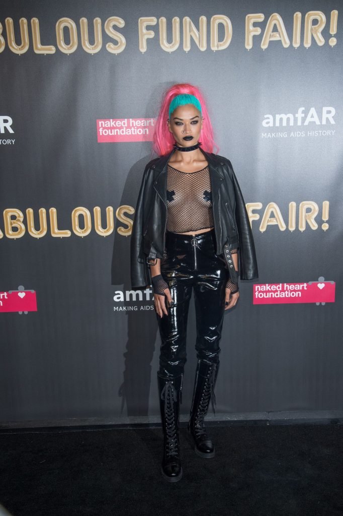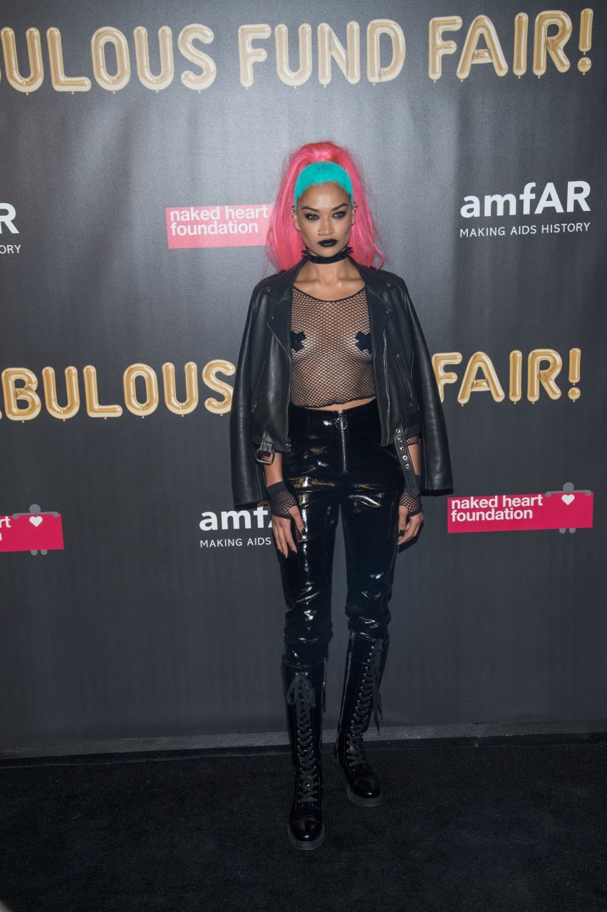 Shanina Shaik usa uma blusa de malha com pasties no amfAR Fabulous Fund Fair de 2017 em NYC, 28/10/2017. Shanina Shaik é uma top model australiana de moda. Idade: 26 anos (nascida em 11 de fevereiro de 1991)