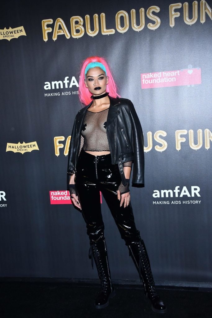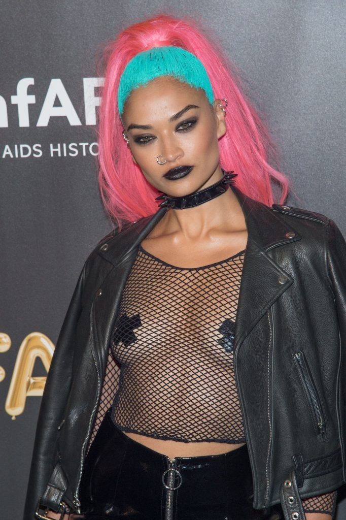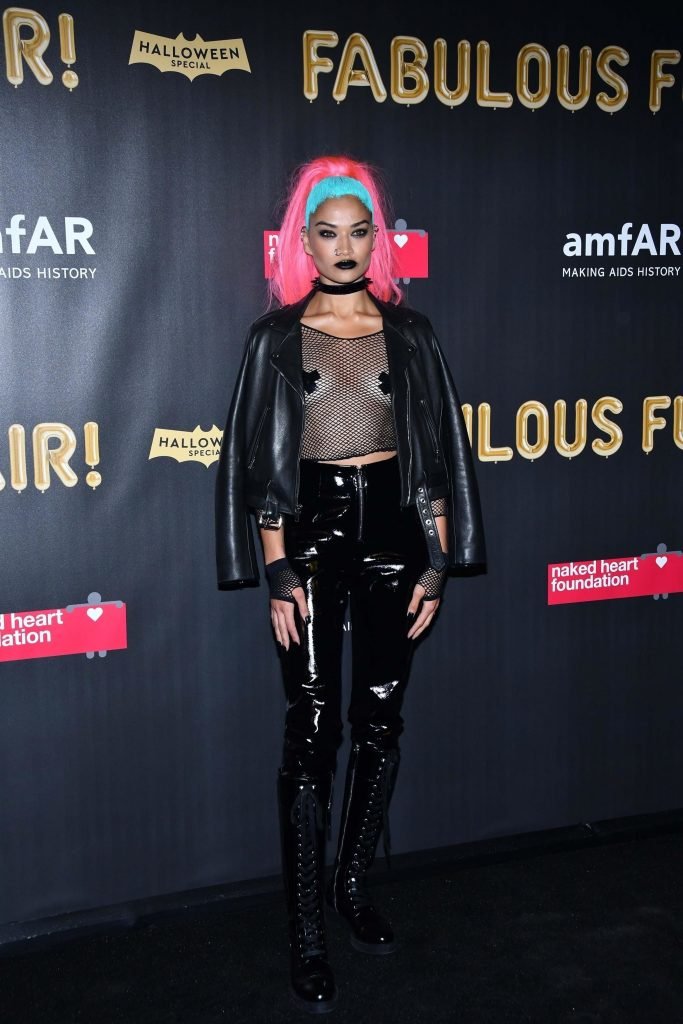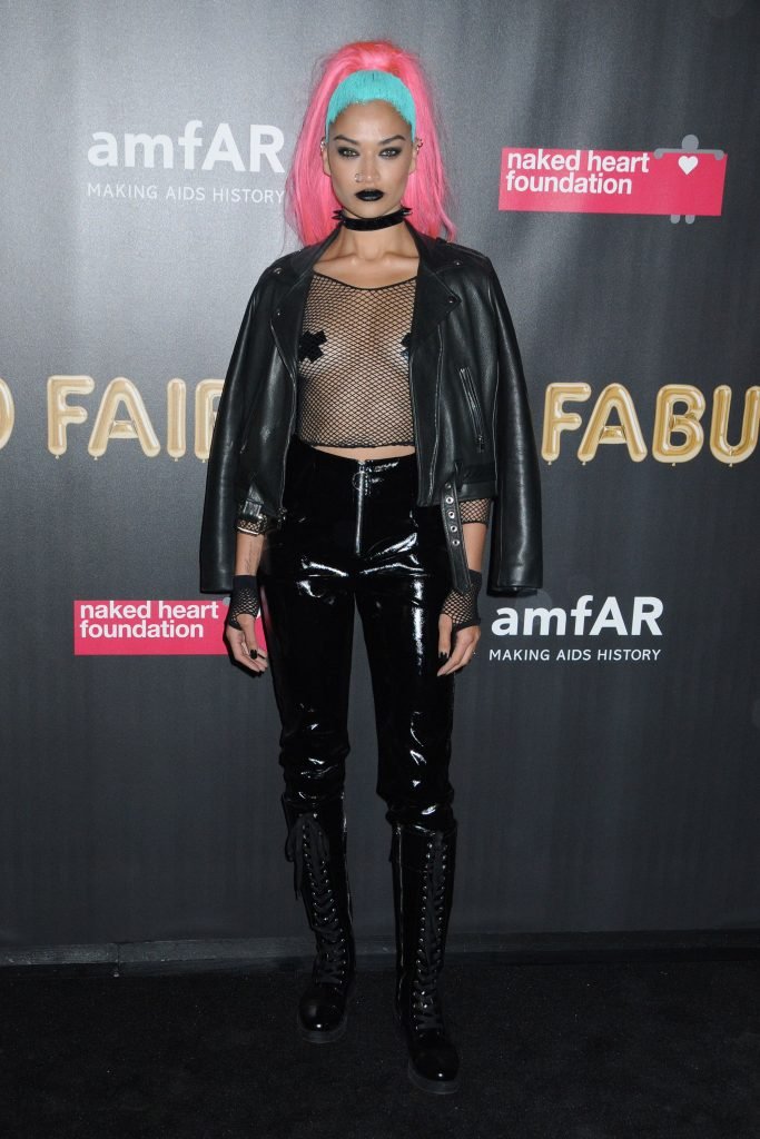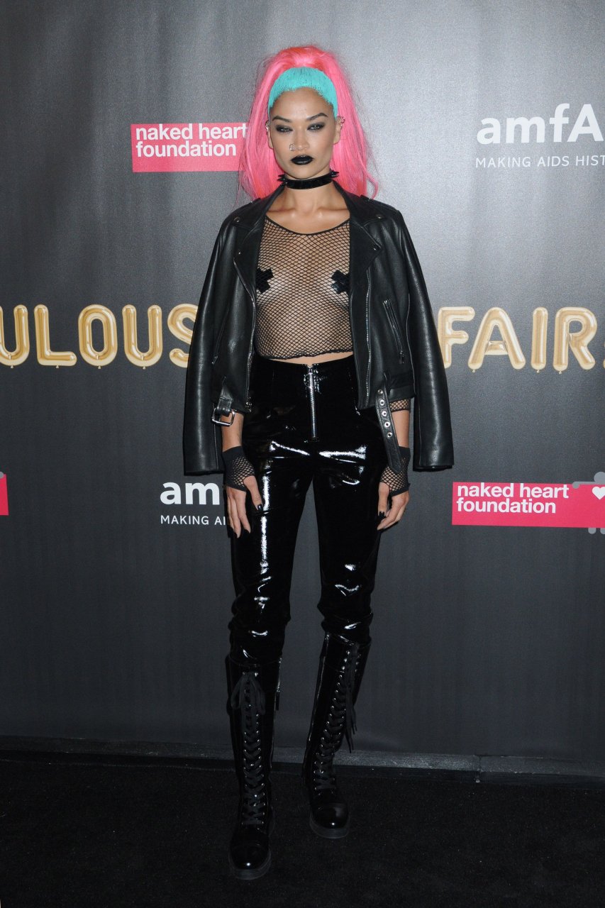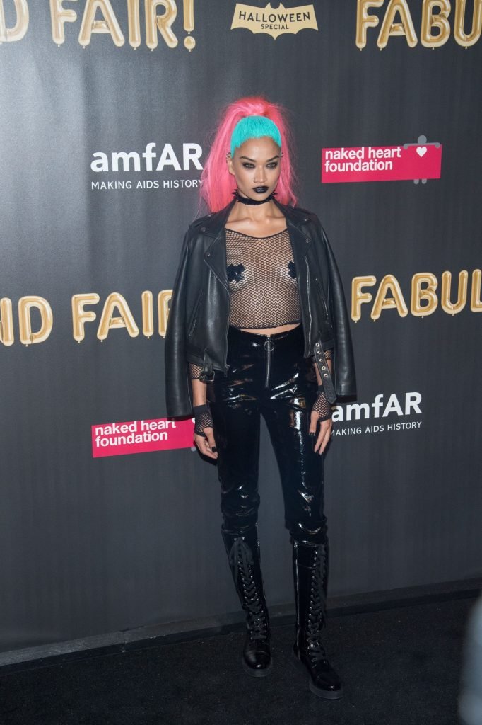Shanina Shaik usa uma blusa de malha com pasties no amfAR Fabulous Fund Fair de 2017 em NYC, 28/10/2017. Shanina Shaik é uma top model australiana de moda. Idade: 26 anos (nascida em 11 de fevereiro de 1991)