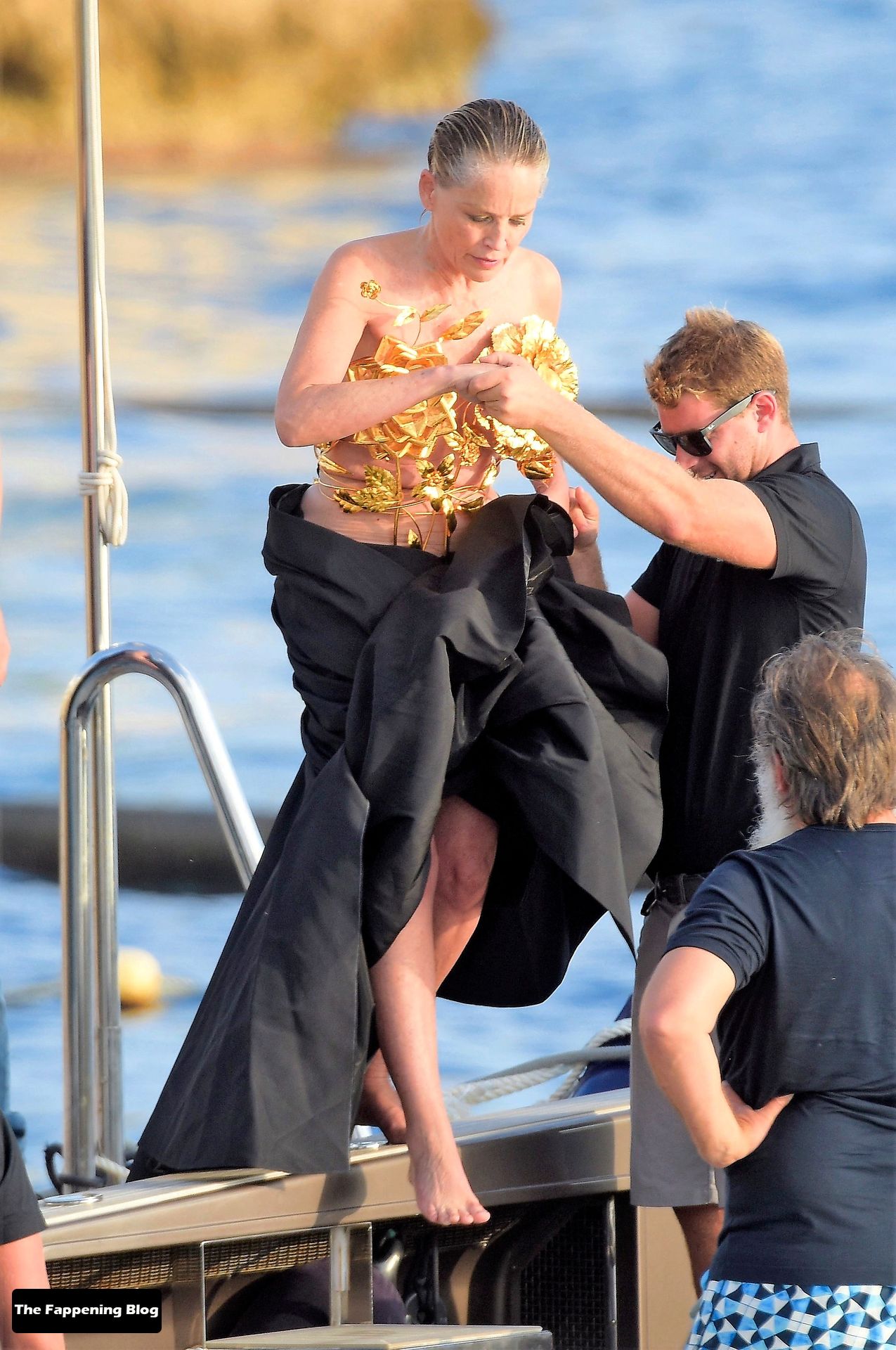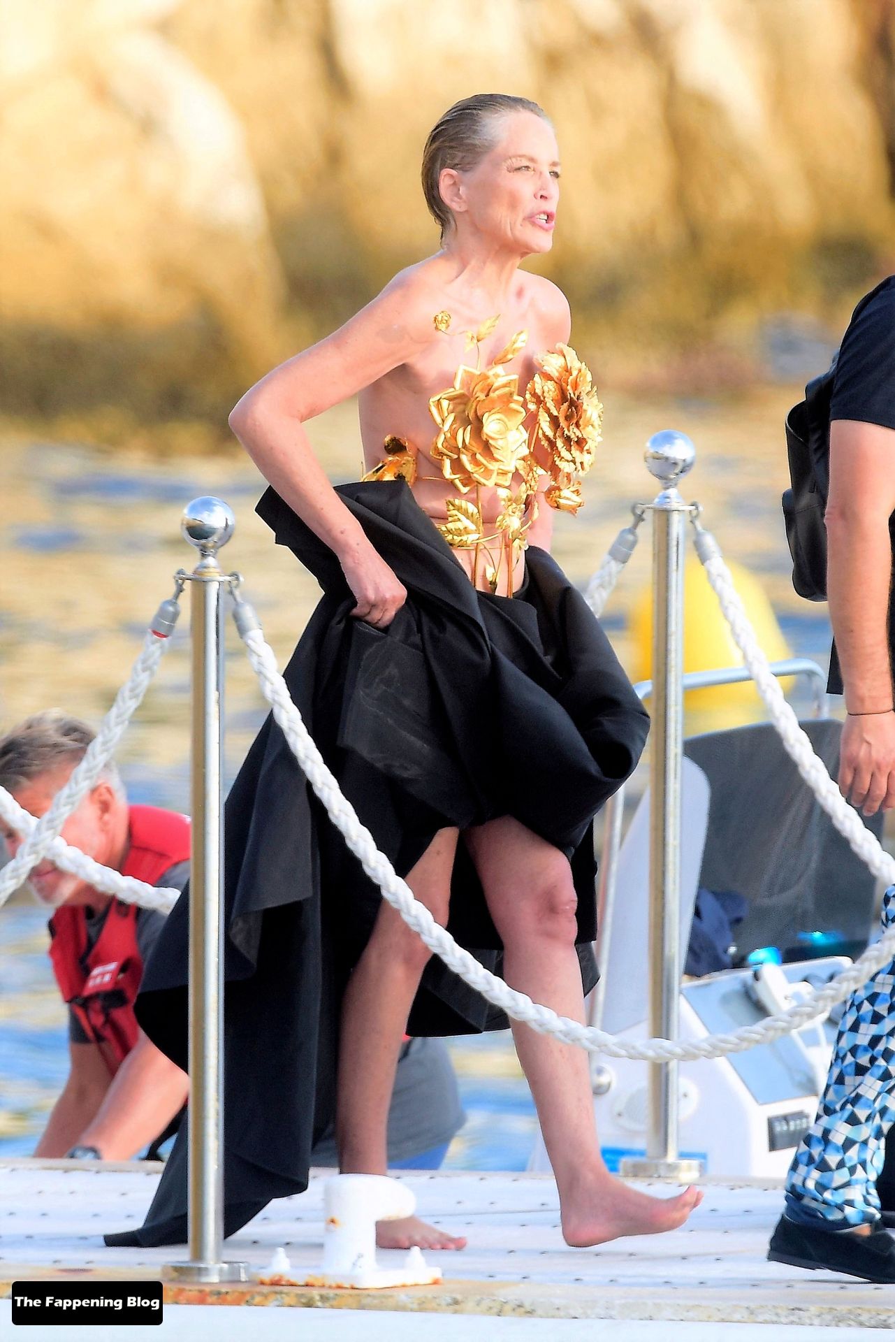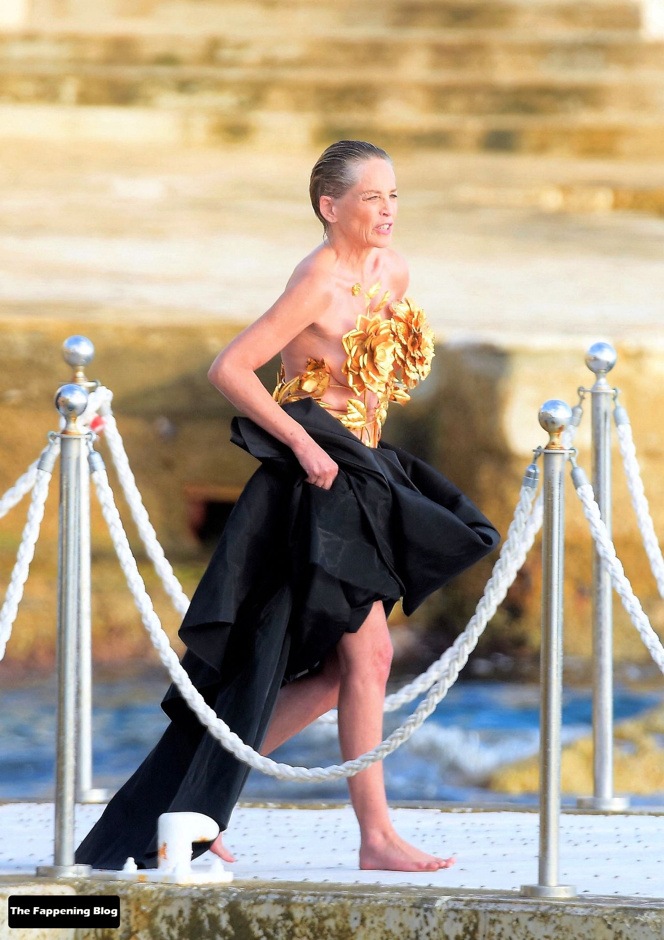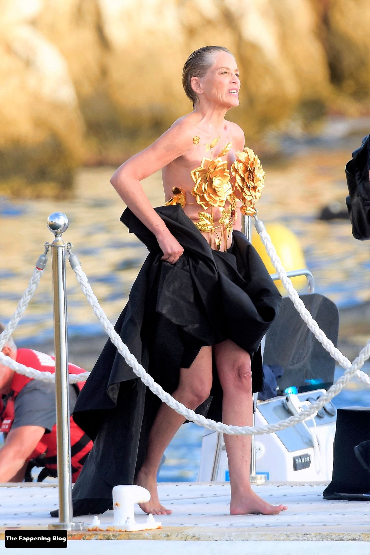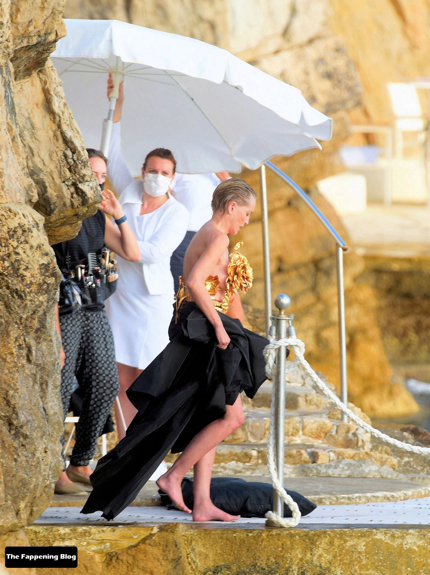 Sharon Stone exibe seu físico incrível durante um ensaio de moda na praia no sul da França, 02/10/2021.