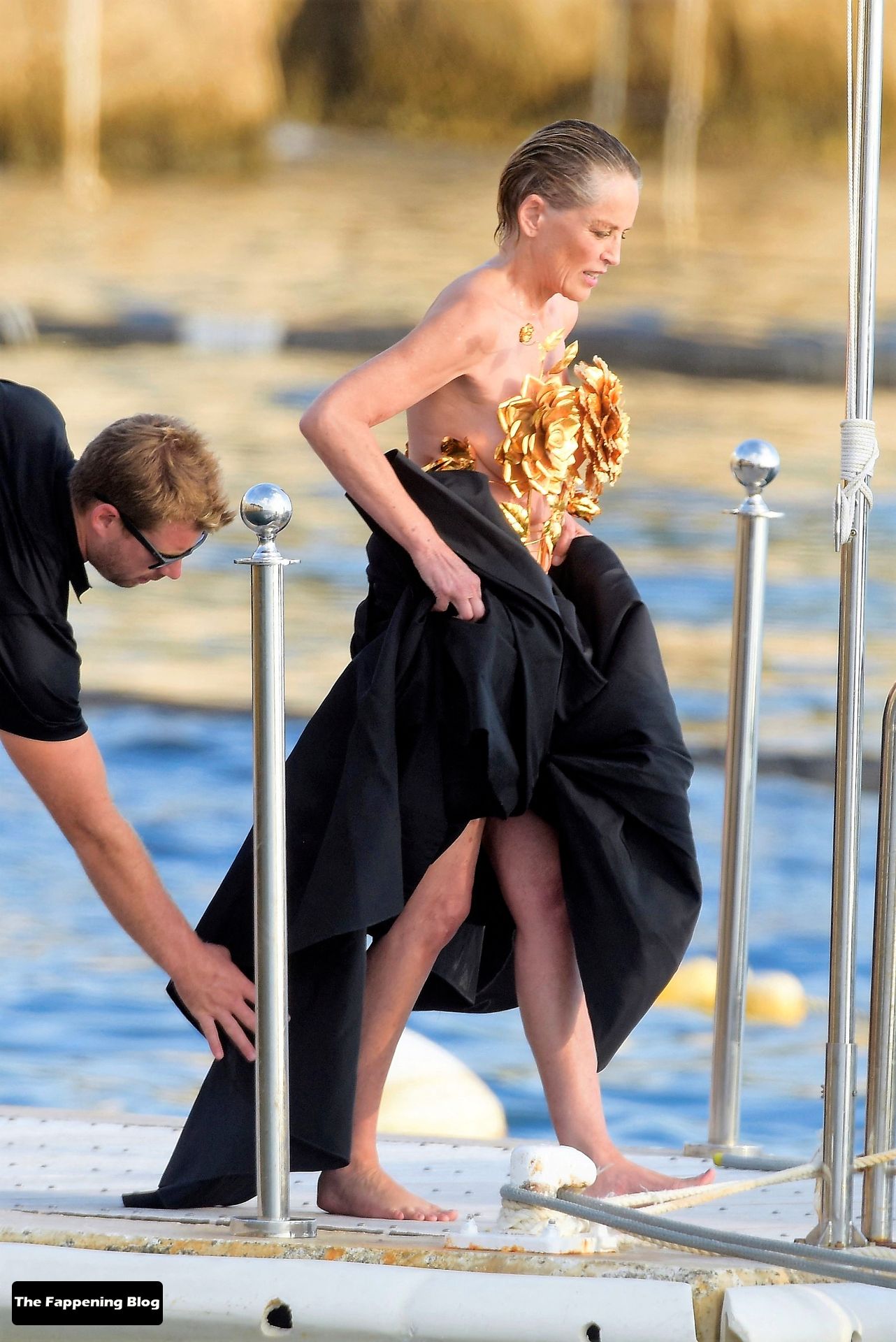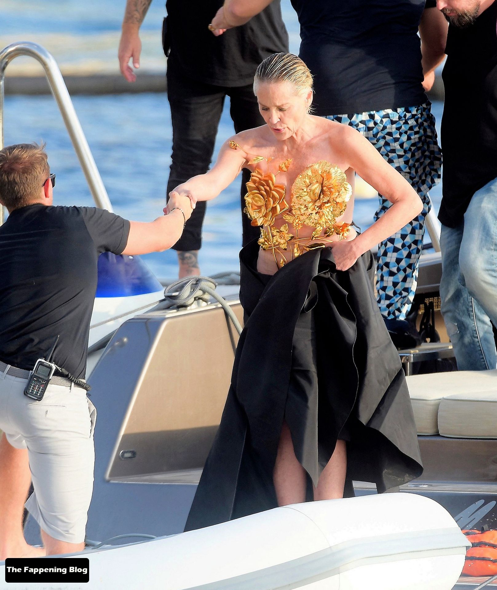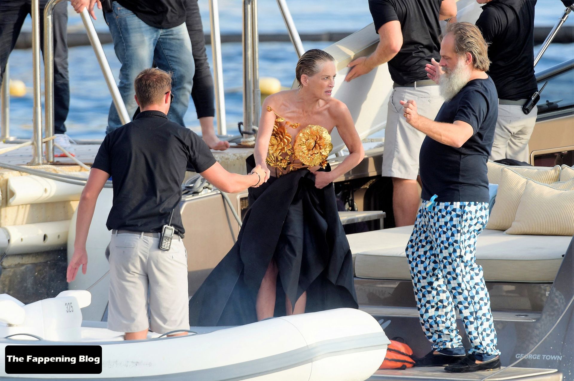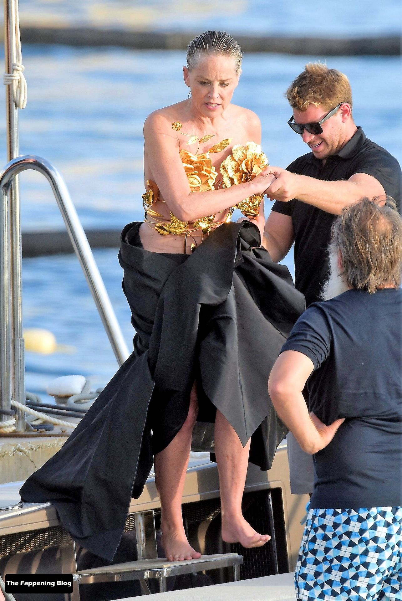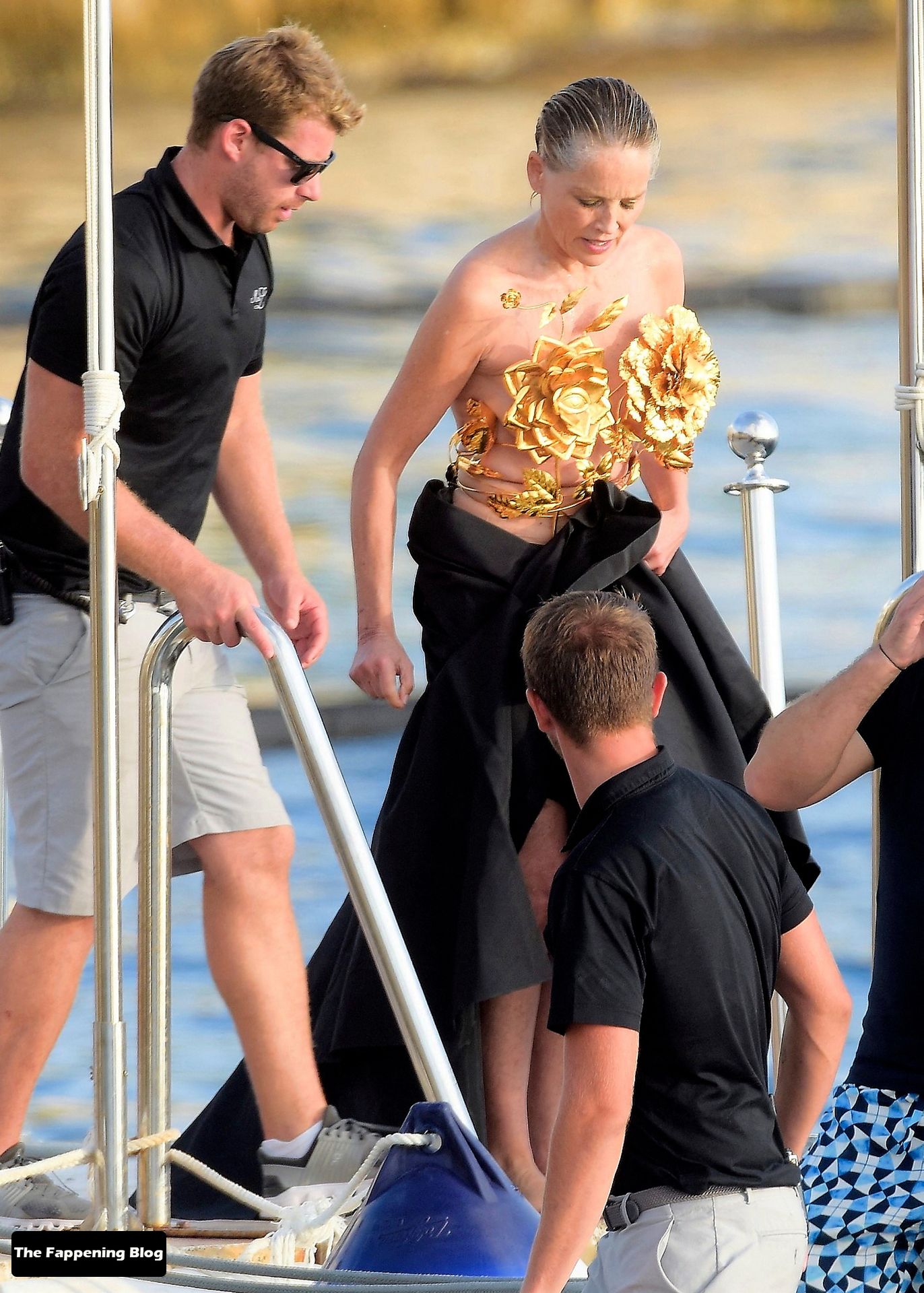 Sharon Stone exibe seu físico incrível durante um ensaio de moda na praia no sul da França, 02/10/2021.