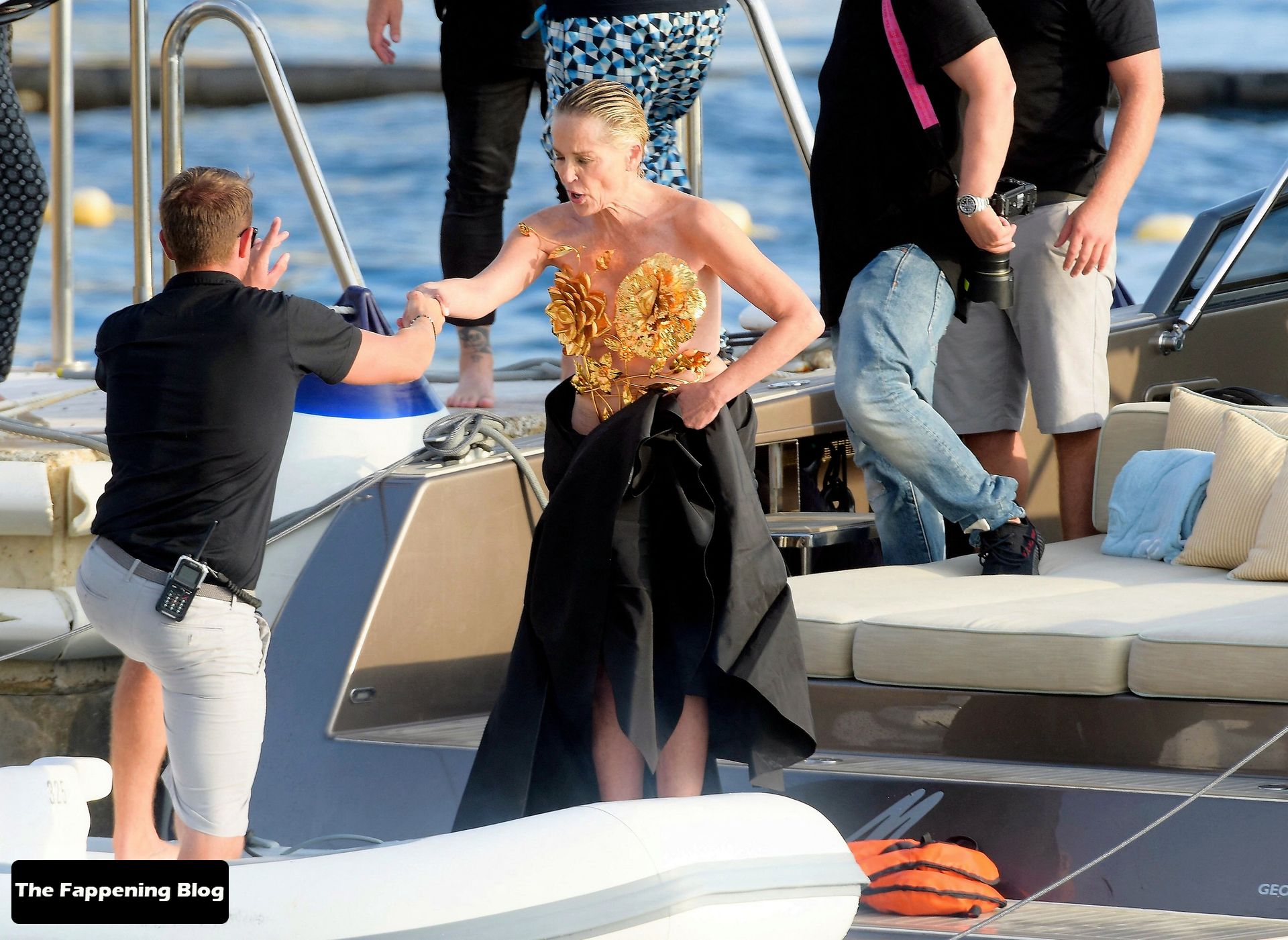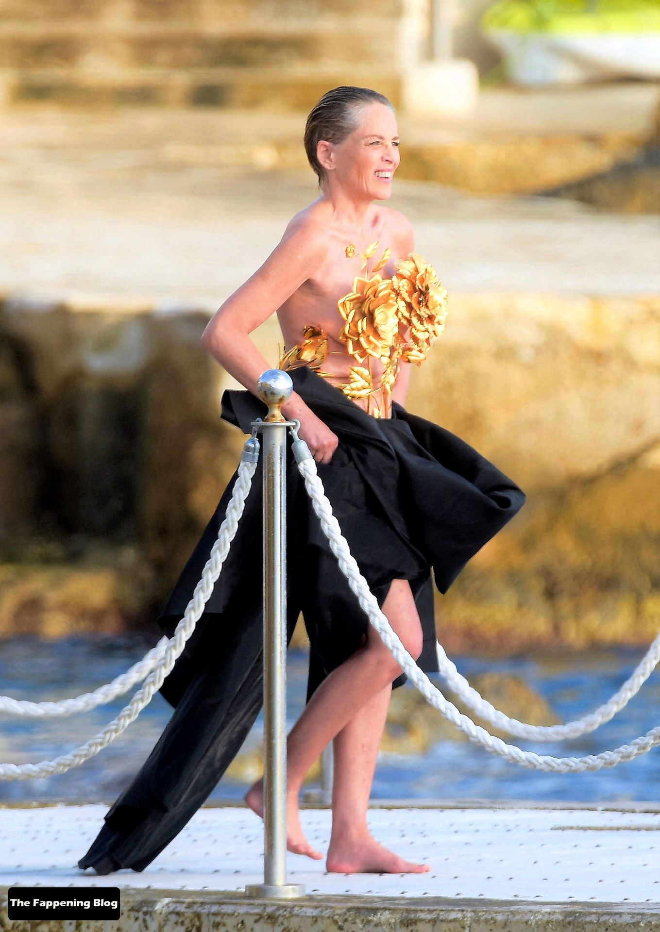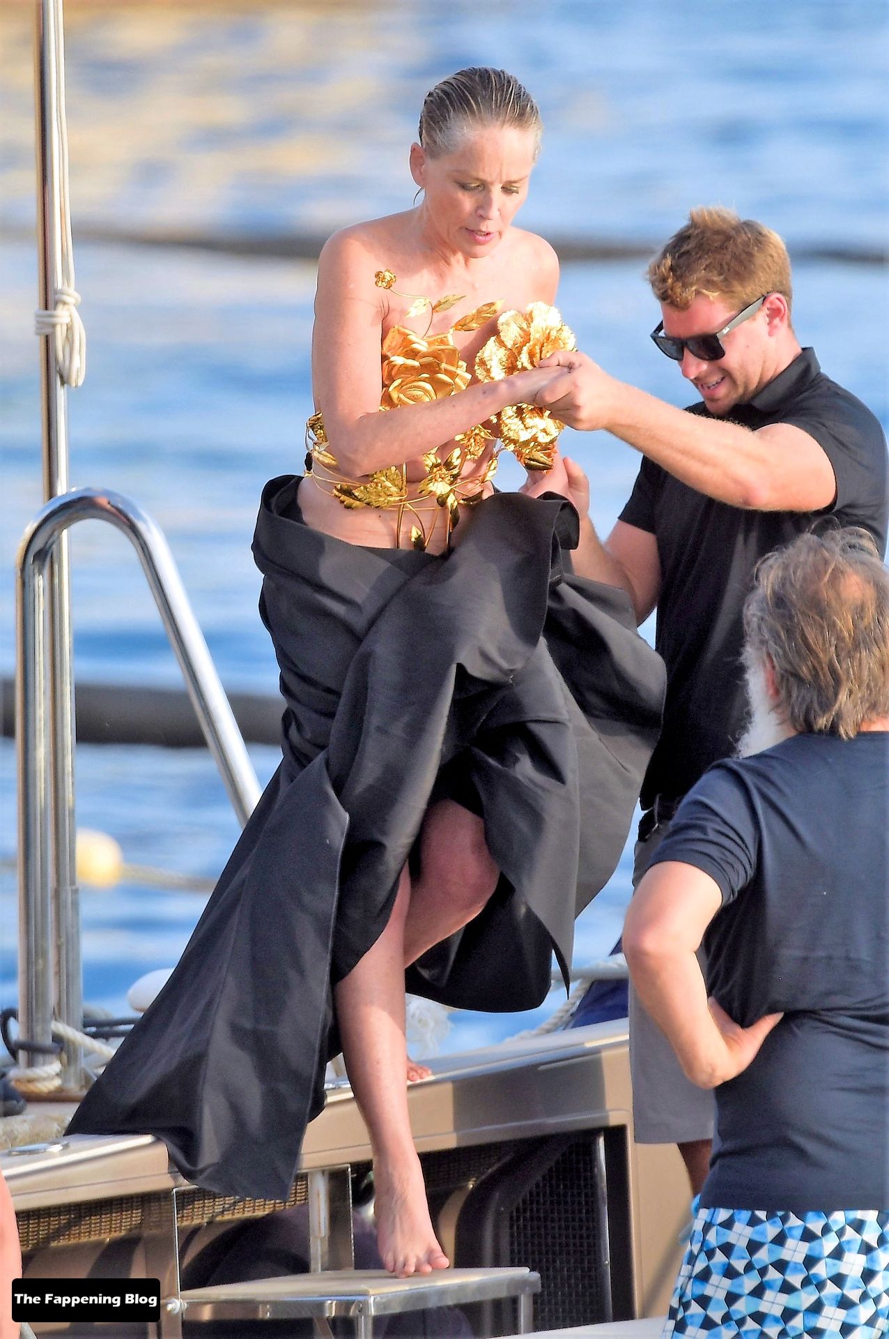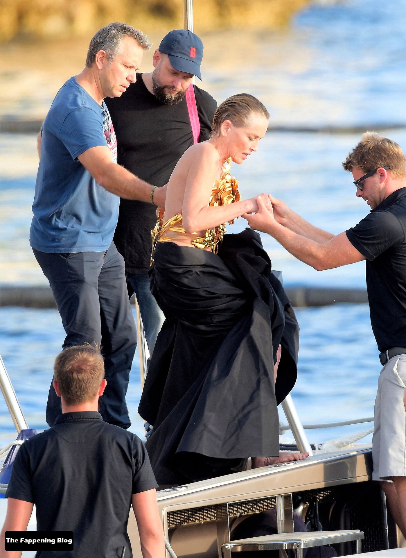 Sharon Stone exibe seu físico incrível durante um ensaio de moda na praia no sul da França, 02/10/2021.