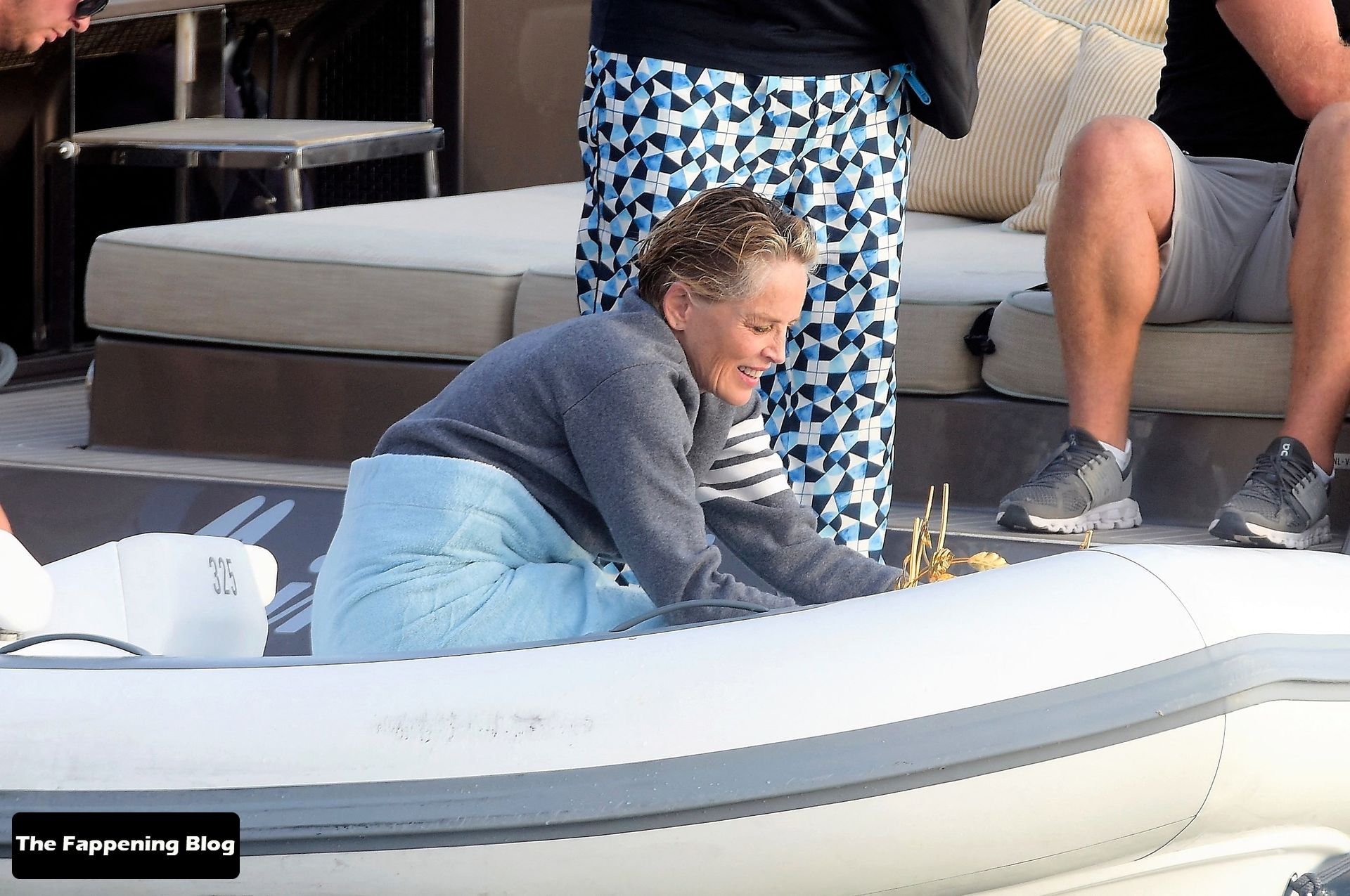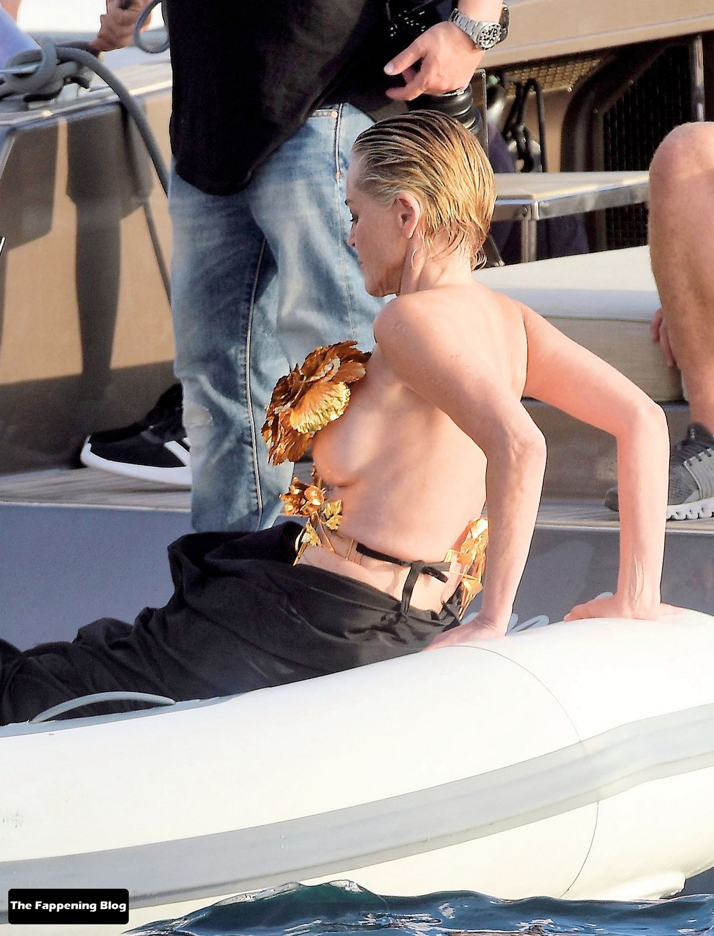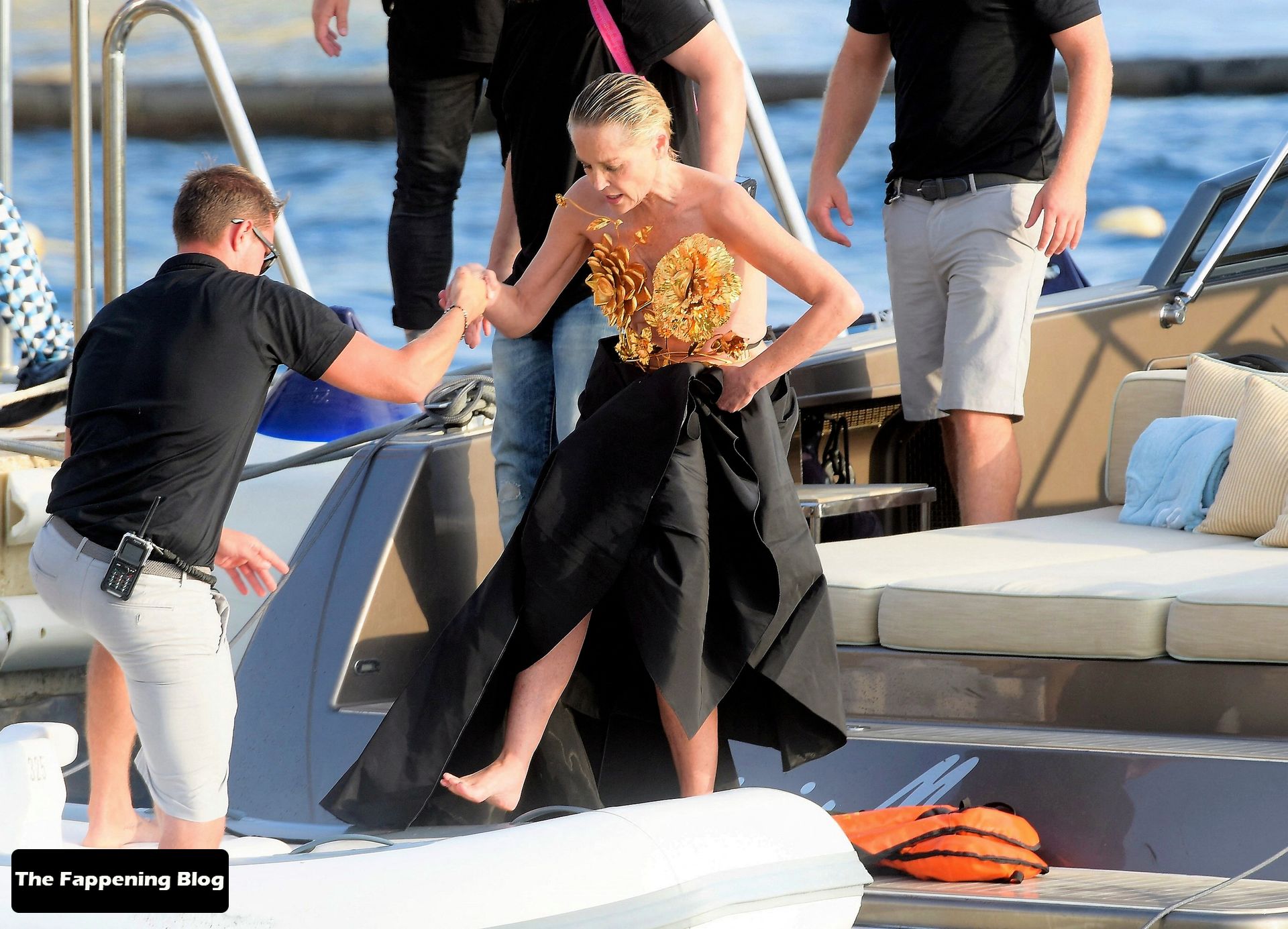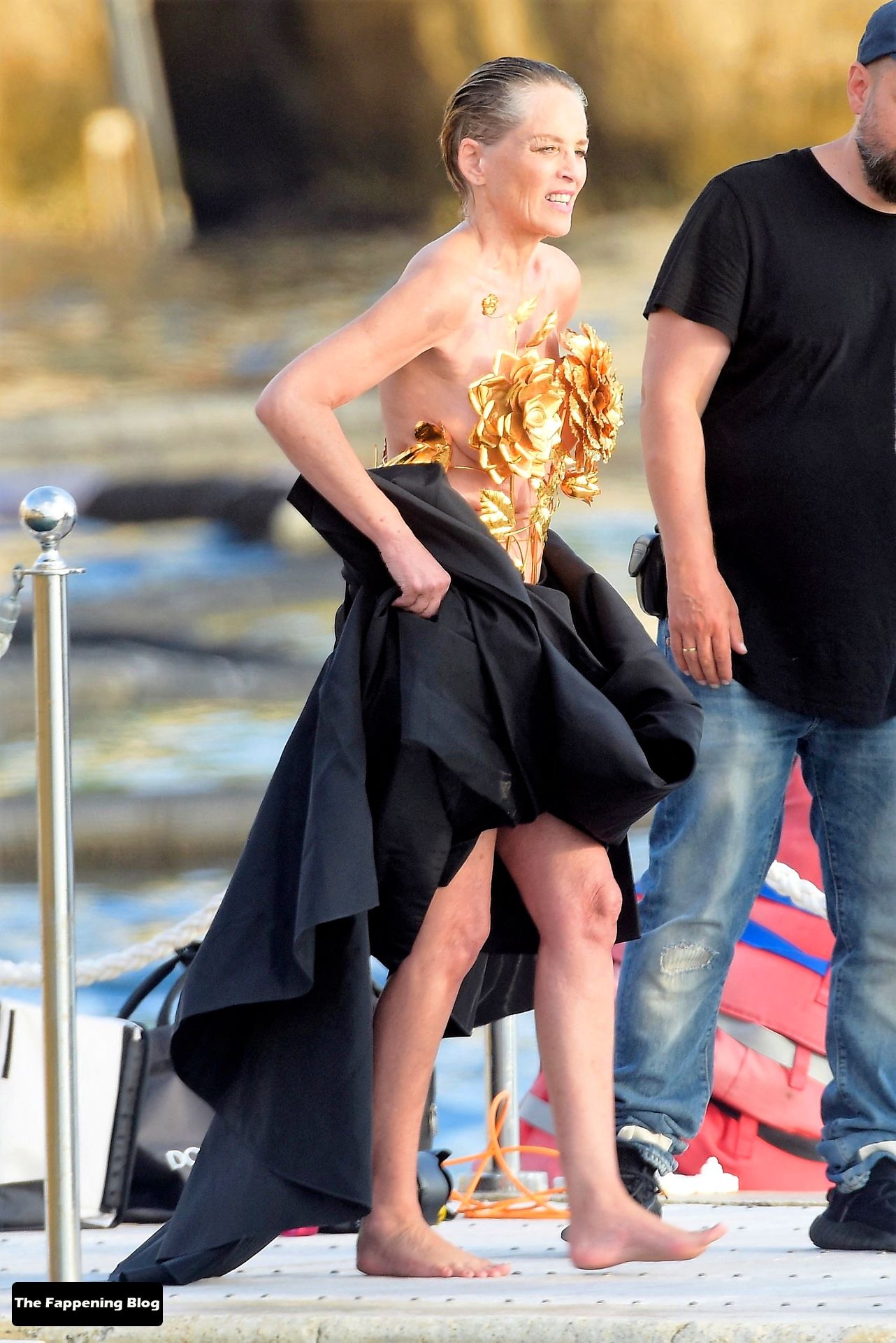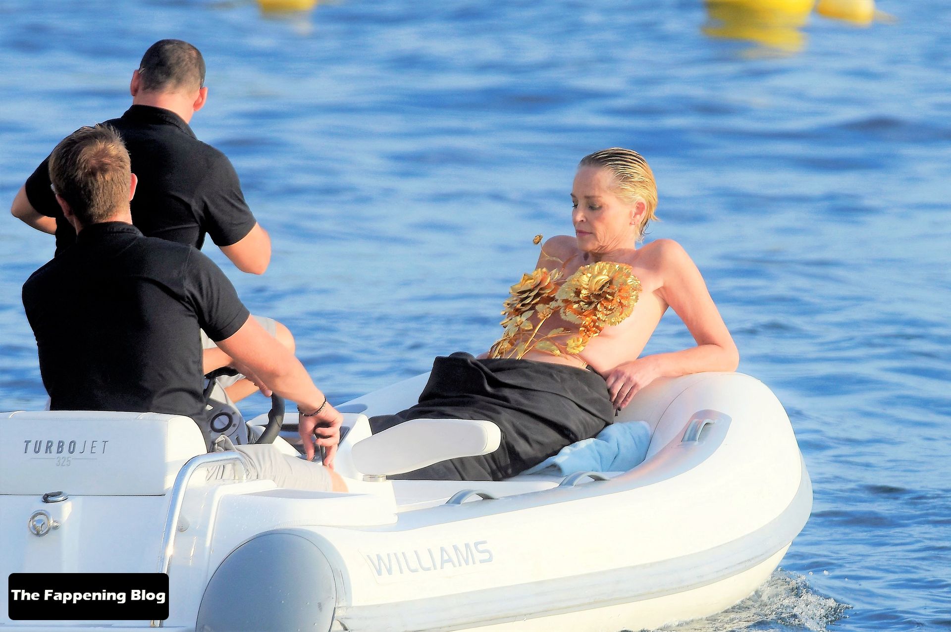 Sharon Stone exibe seu físico incrível durante um ensaio de moda na praia no sul da França, 02/10/2021.