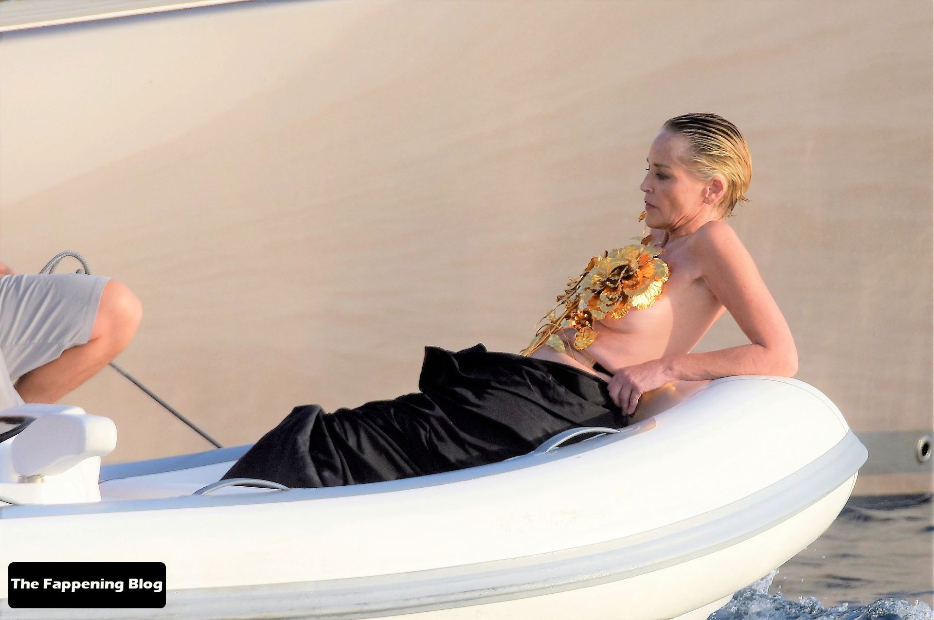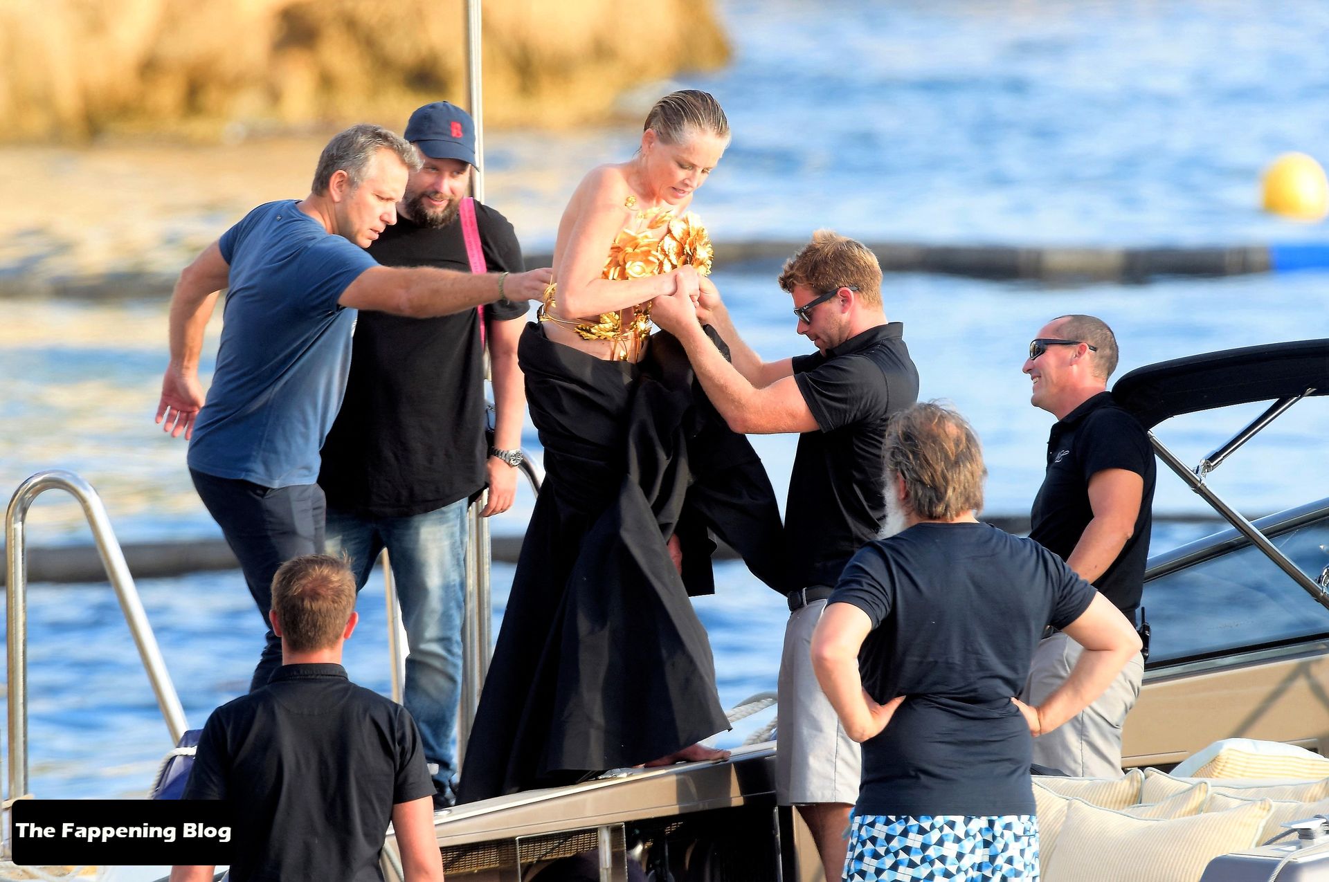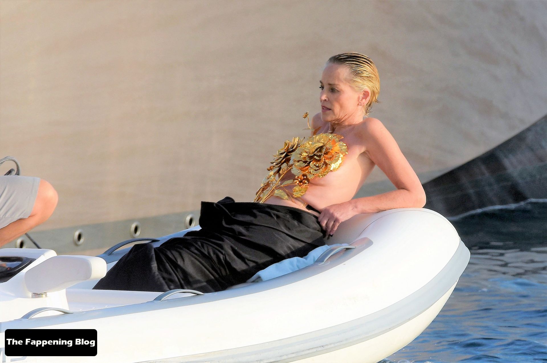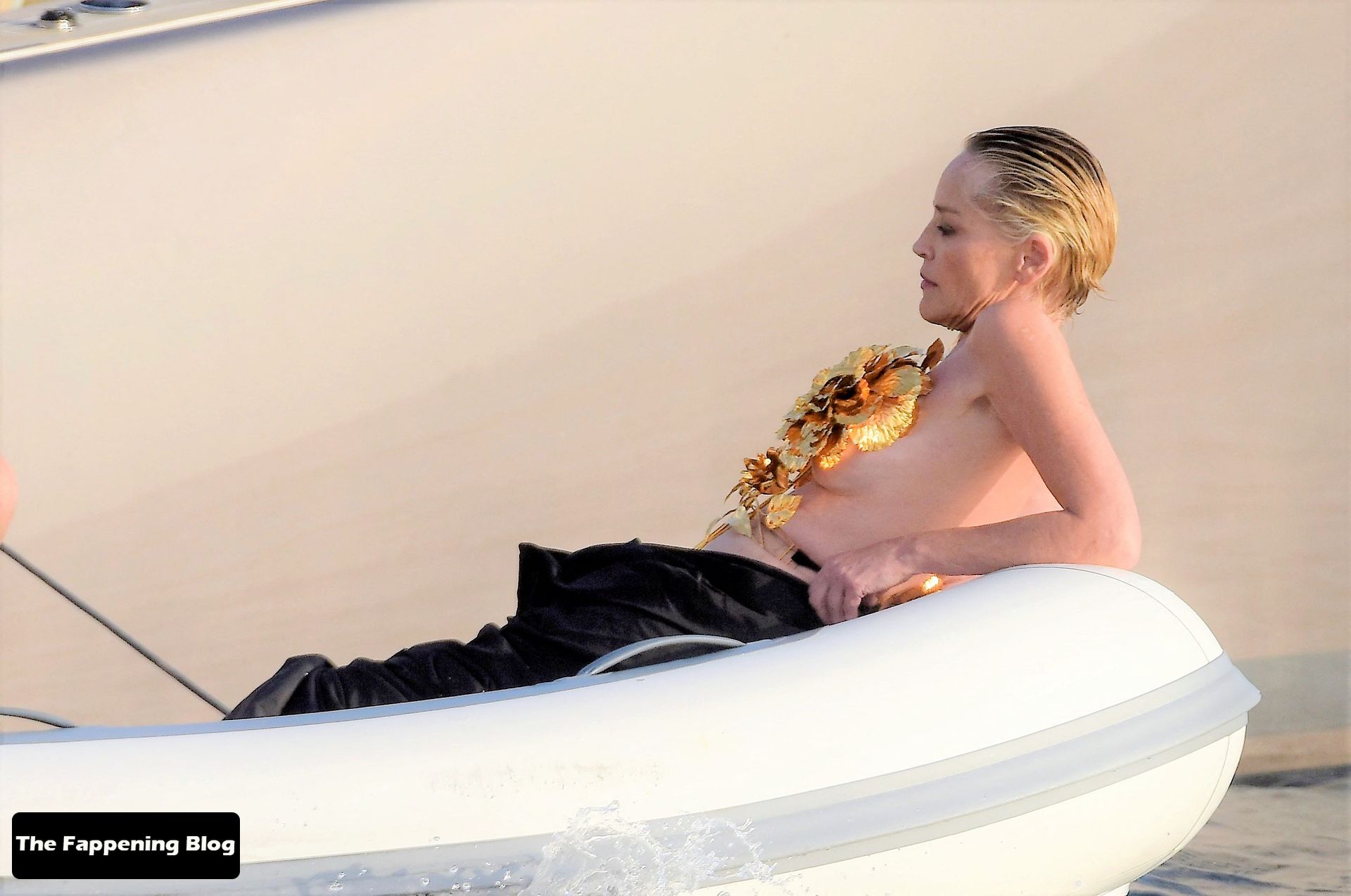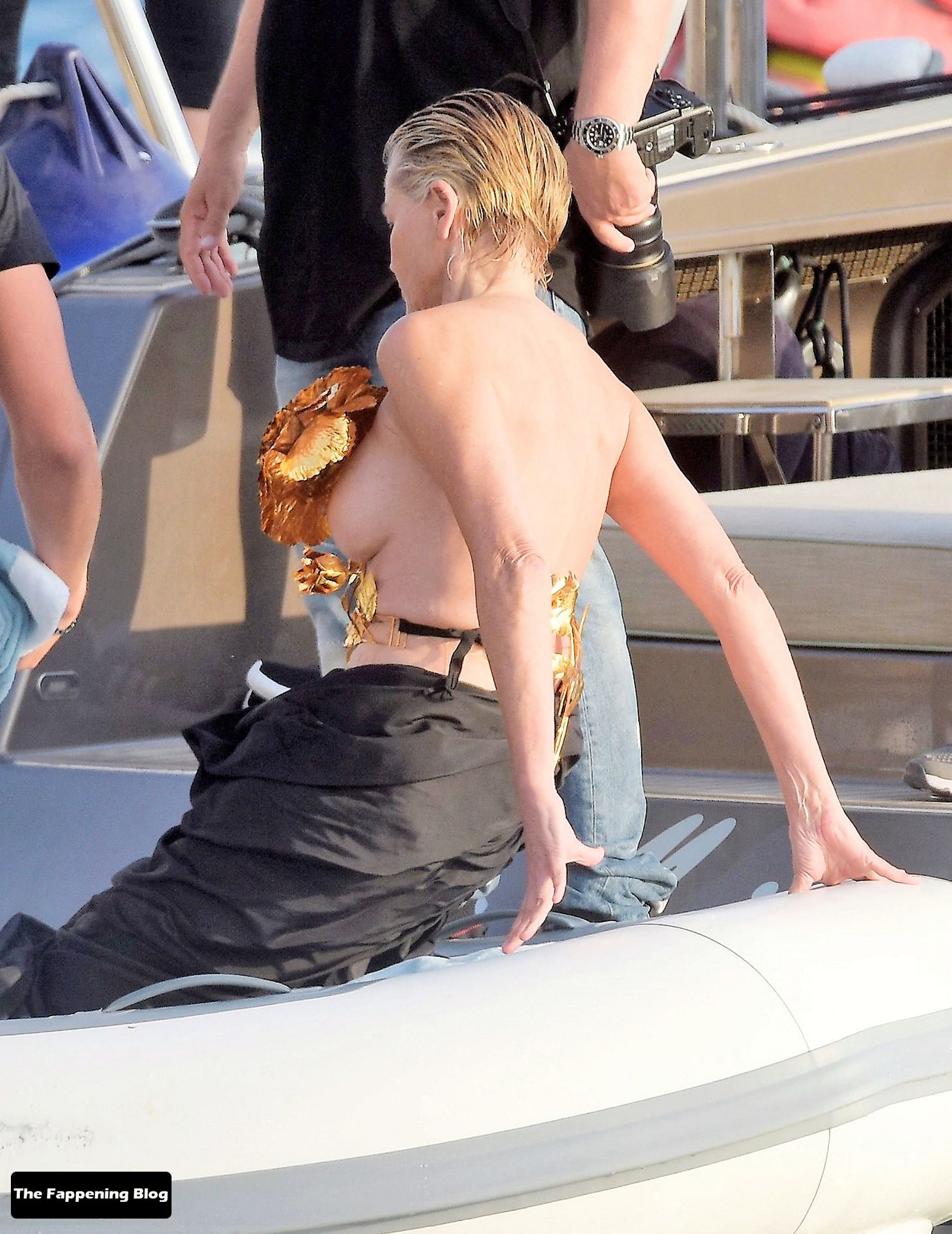 Sharon Stone exibe seu físico incrível durante um ensaio de moda na praia no sul da França, 02/10/2021.