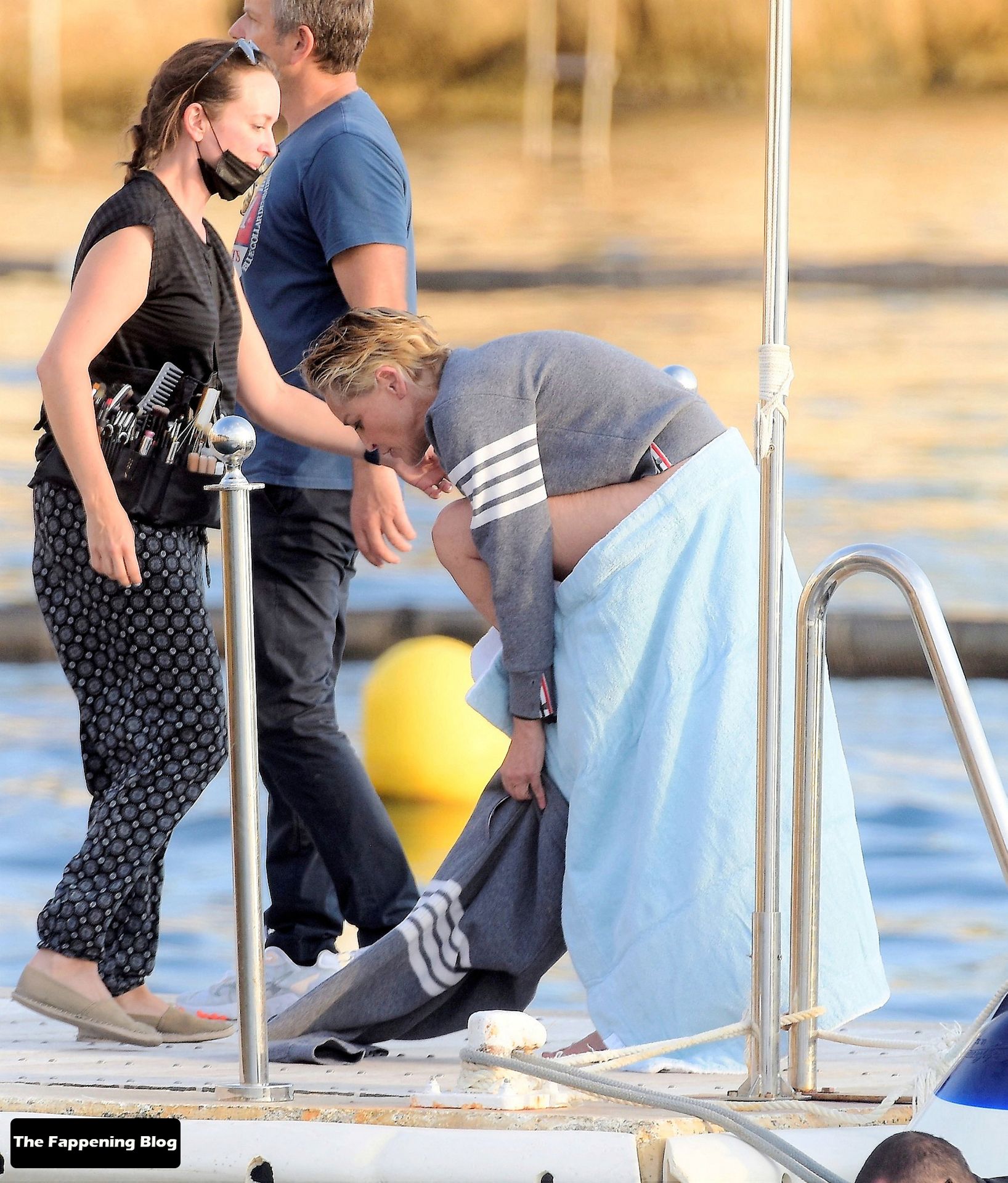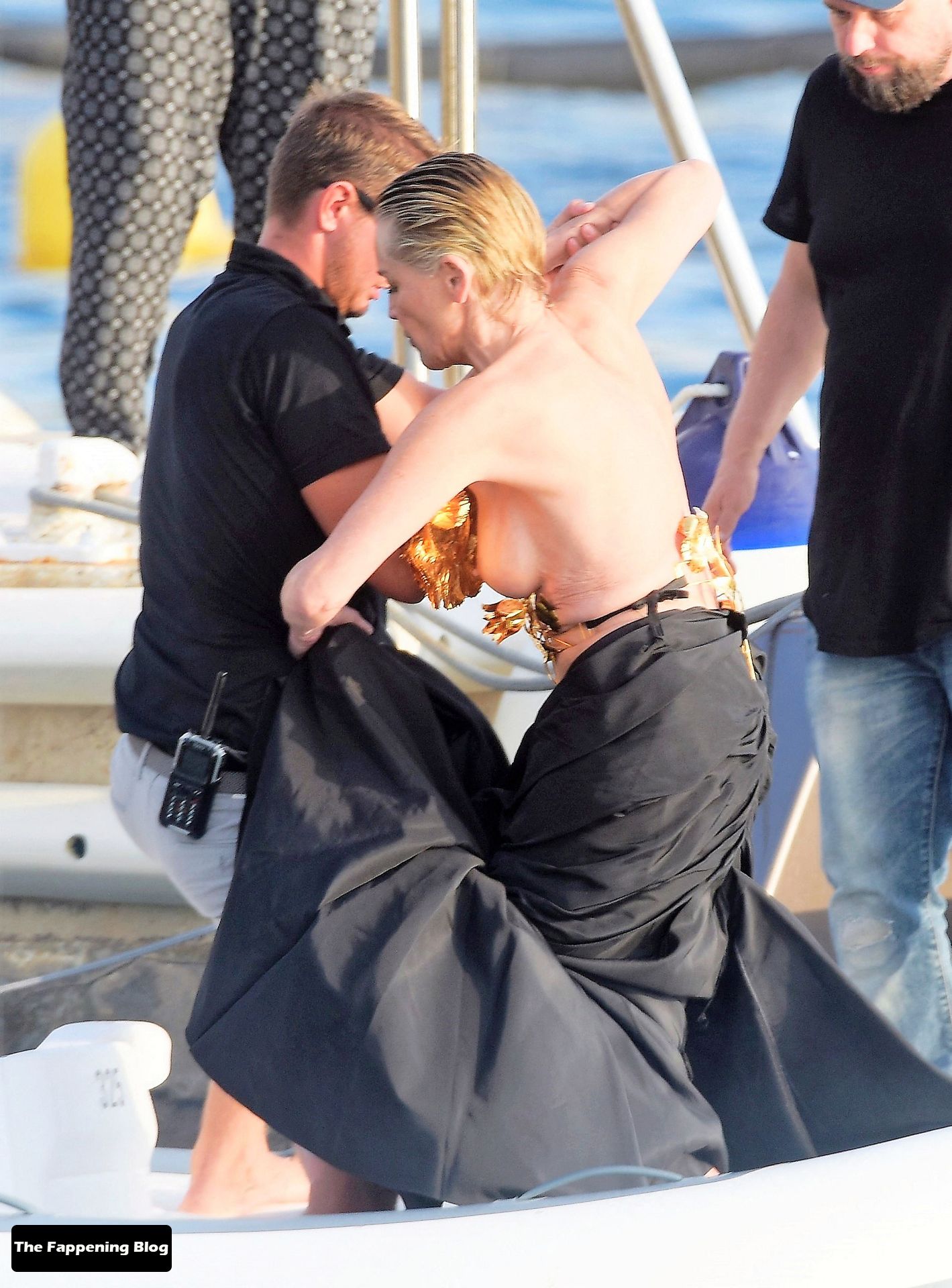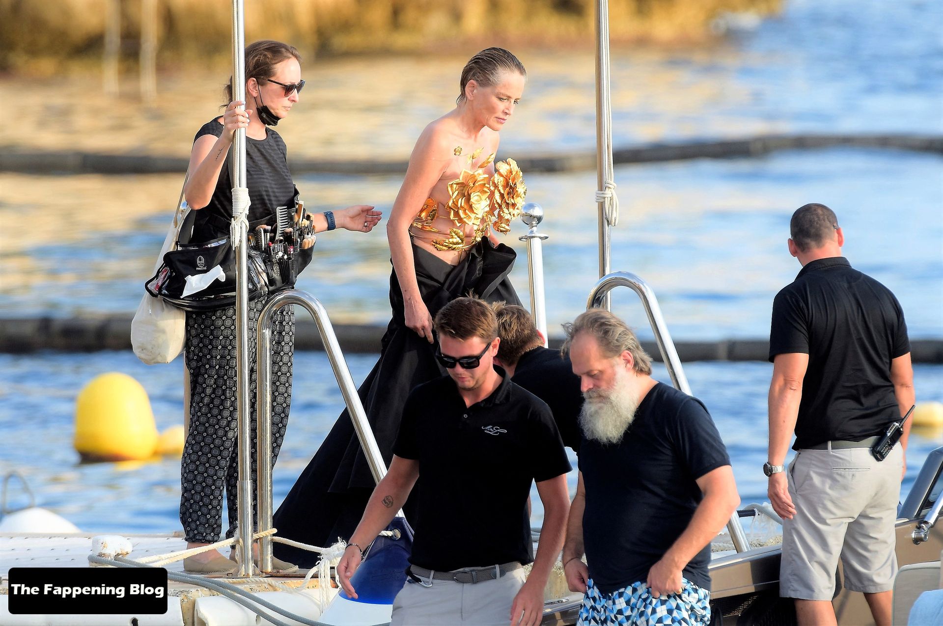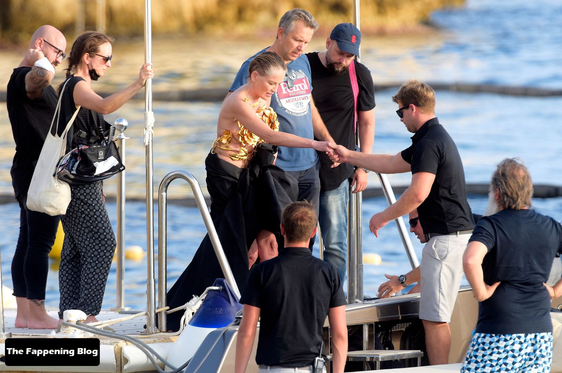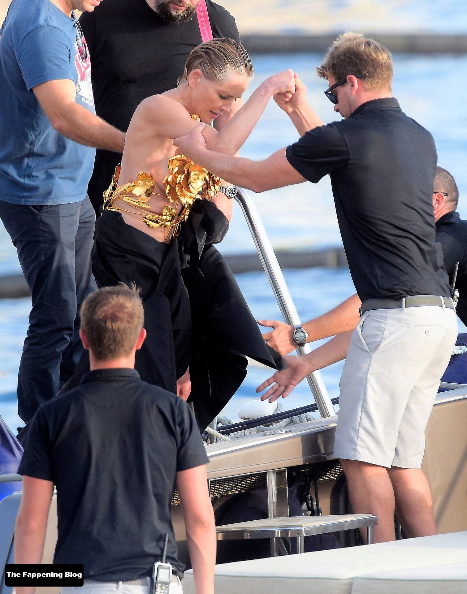 Sharon Stone exibe seu físico incrível durante um ensaio de moda na praia no sul da França, 02/10/2021.