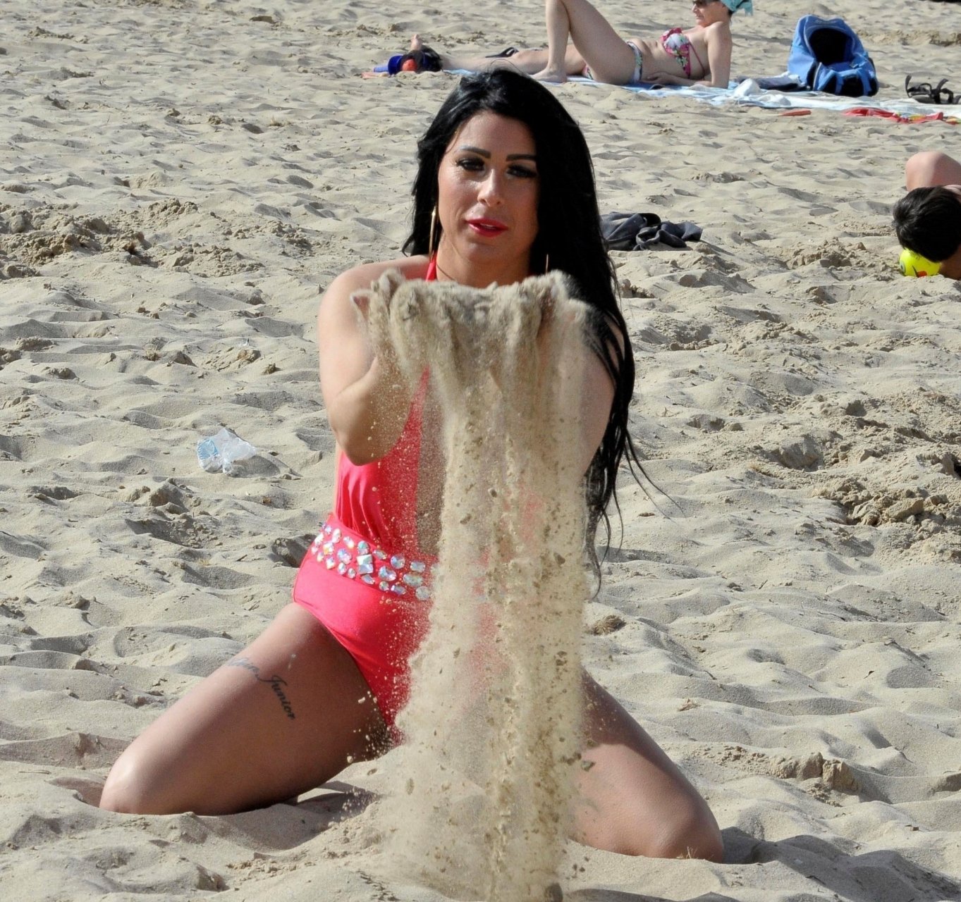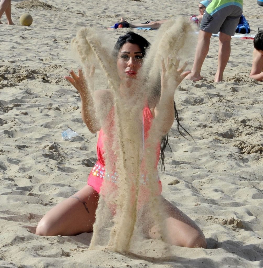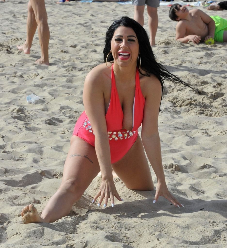 Busty Big Brother’s Simone Reed (28, biquíni rosa) e a melhor amiga britânica de Paris Hilton, Chrissie Wunna (37, biquíni de estampa de leopardo), fotografadas brincando e lutando na praia na Espanha, 04/12/2018.