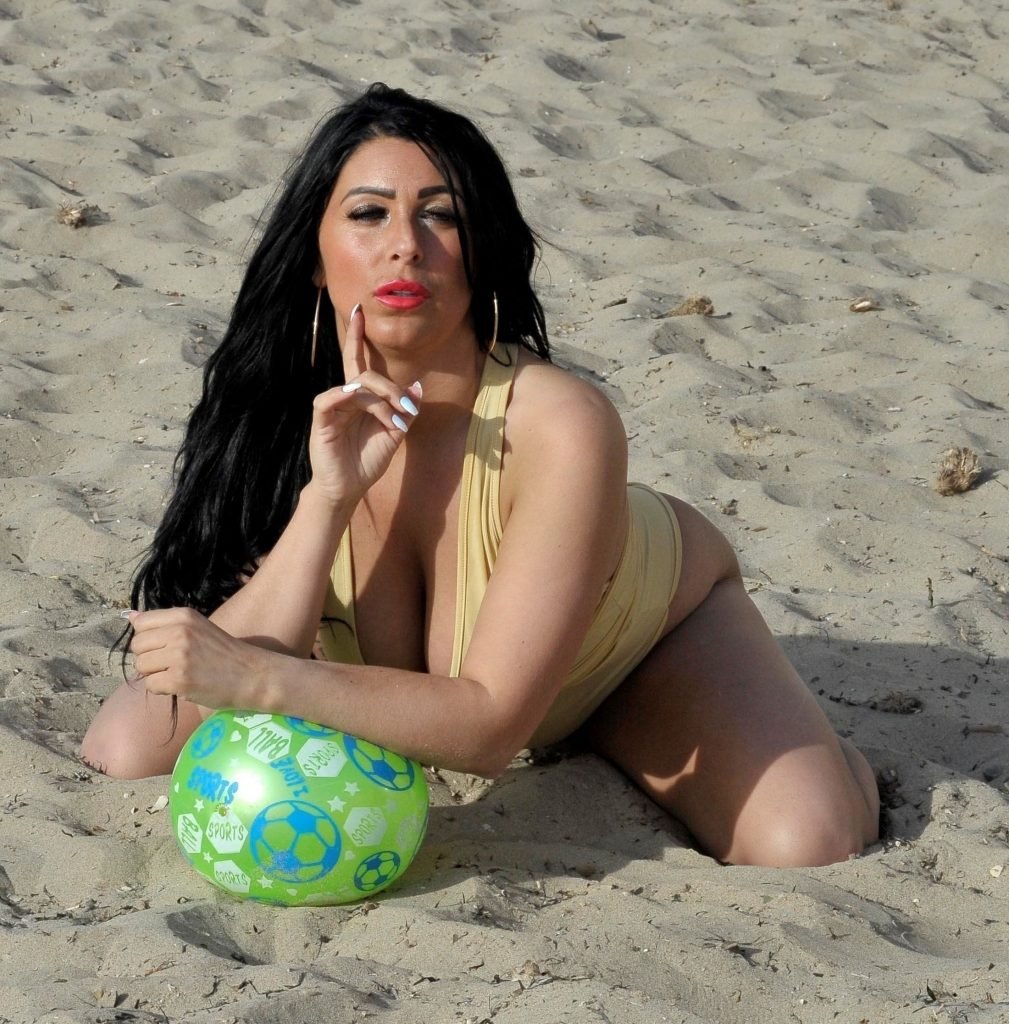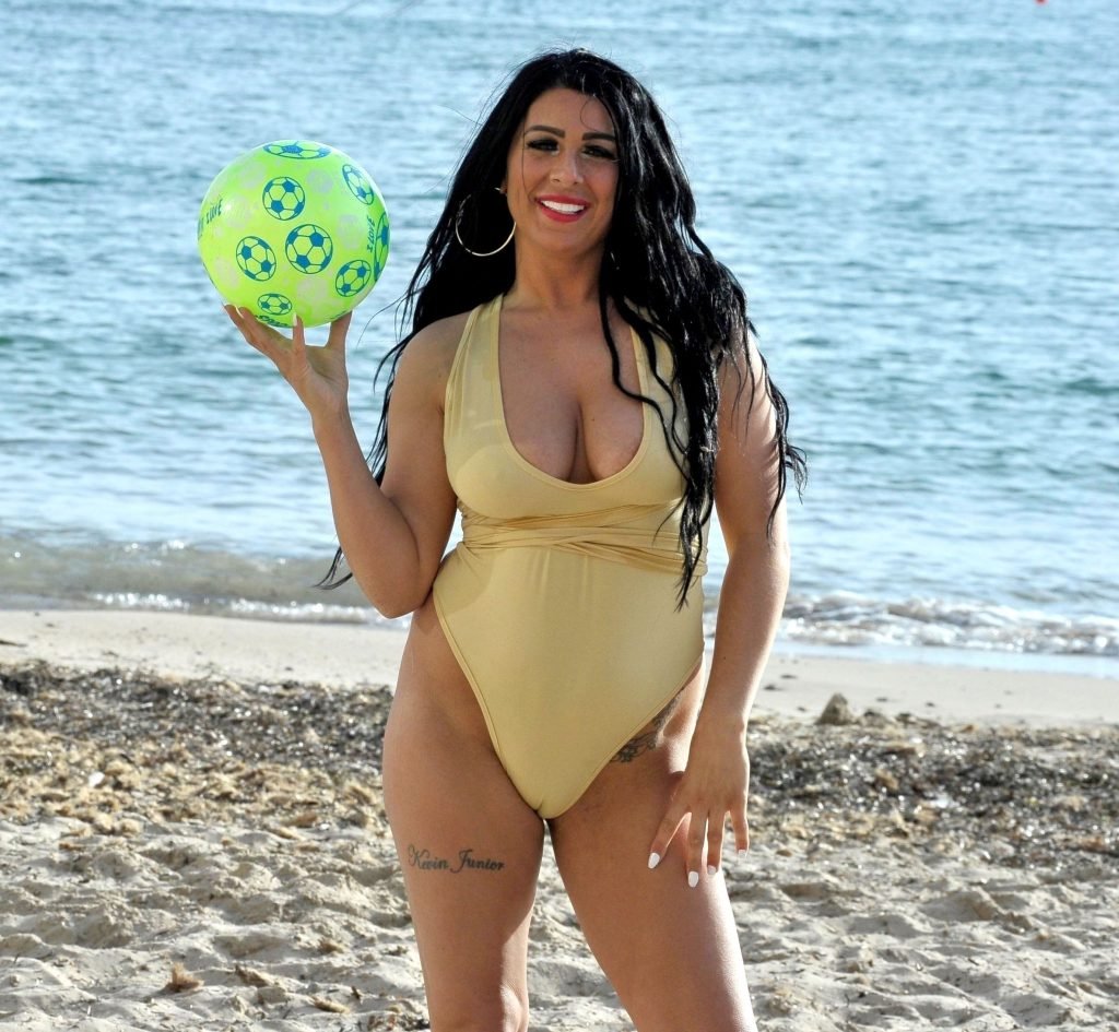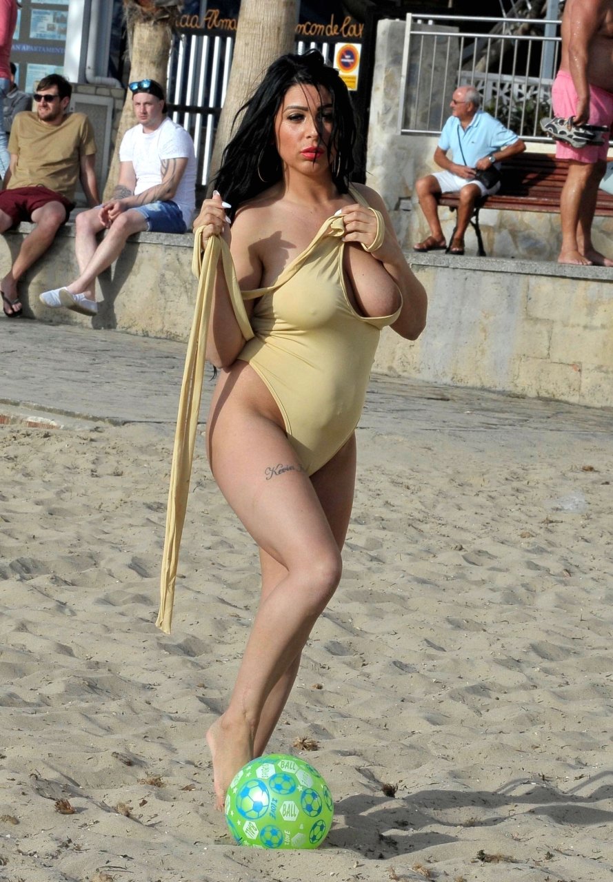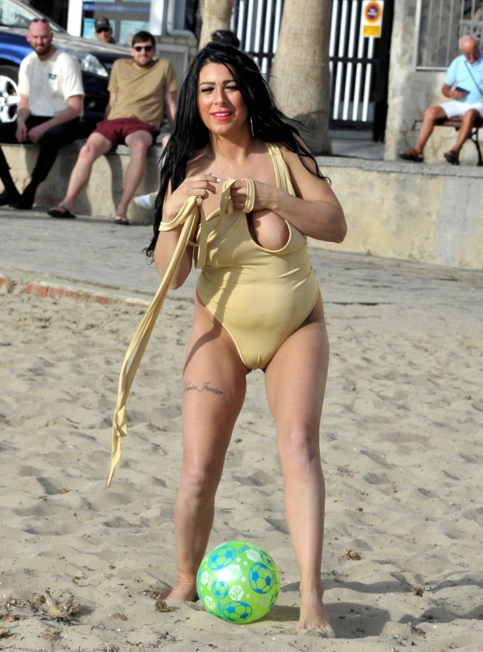 Big Brother estrela, a morena Simone Reed brinca com uma bola de futebol na praia exibindo um visual impressionante e voluptuoso durante uma escapada na Espanha, 17/05/2018.