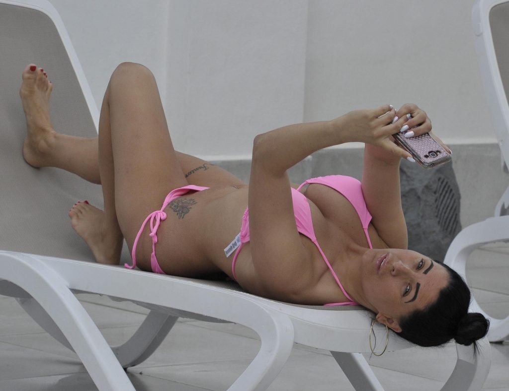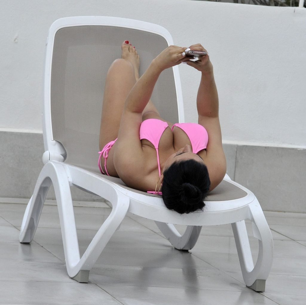 A estrela de reality Simone Reed (29) foi vista usando um biquíni rosa e teve alguma dificuldade em conter todos os seus atributos enquanto posava à beira da piscina na Espanha, 25/05/2018.