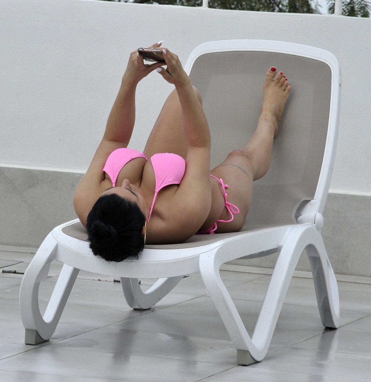 A estrela de reality Simone Reed (29) foi vista usando um biquíni rosa e teve alguma dificuldade em conter todos os seus atributos enquanto posava à beira da piscina na Espanha, 25/05/2018.