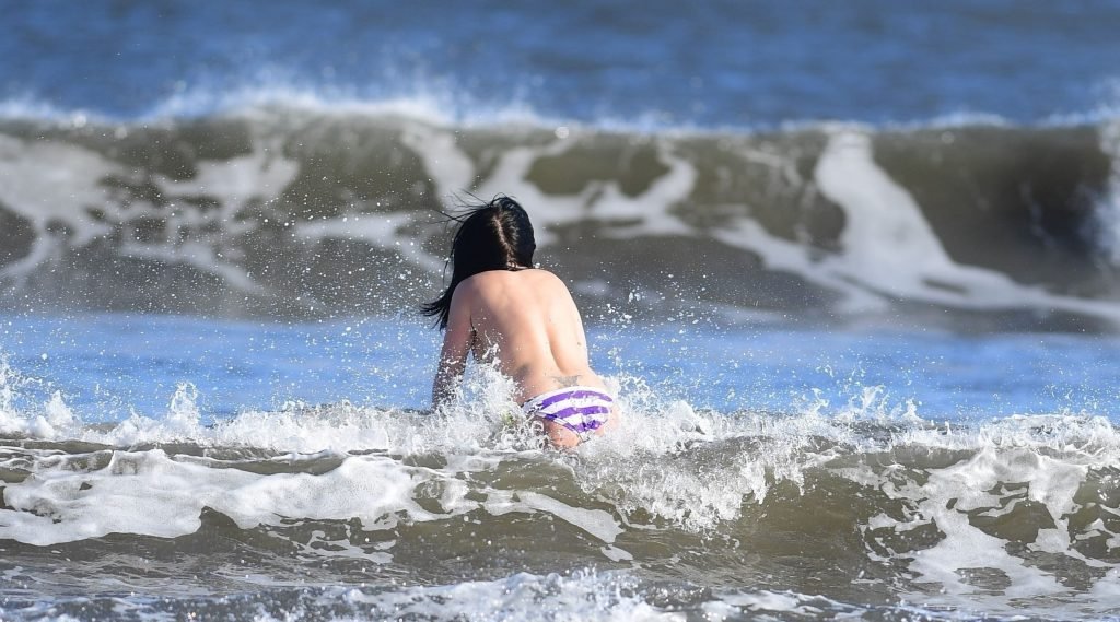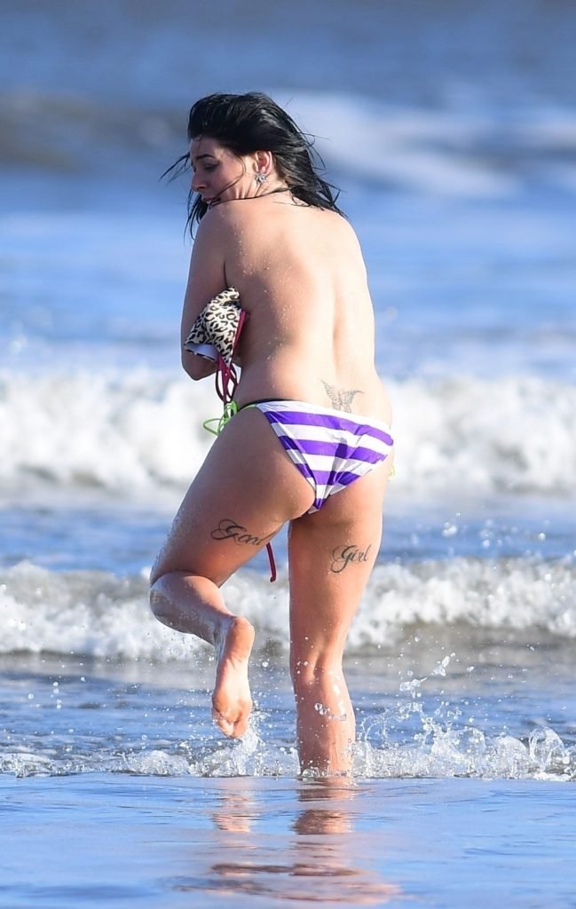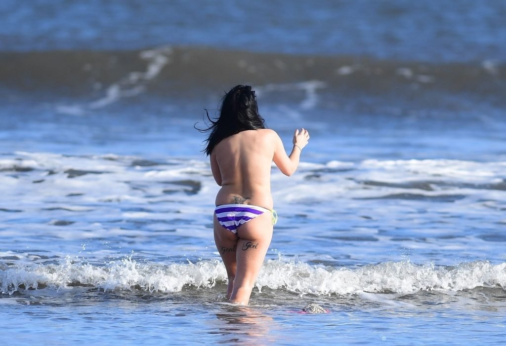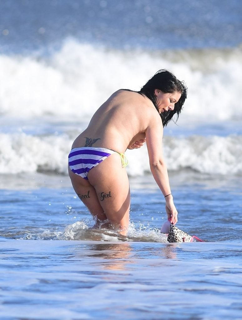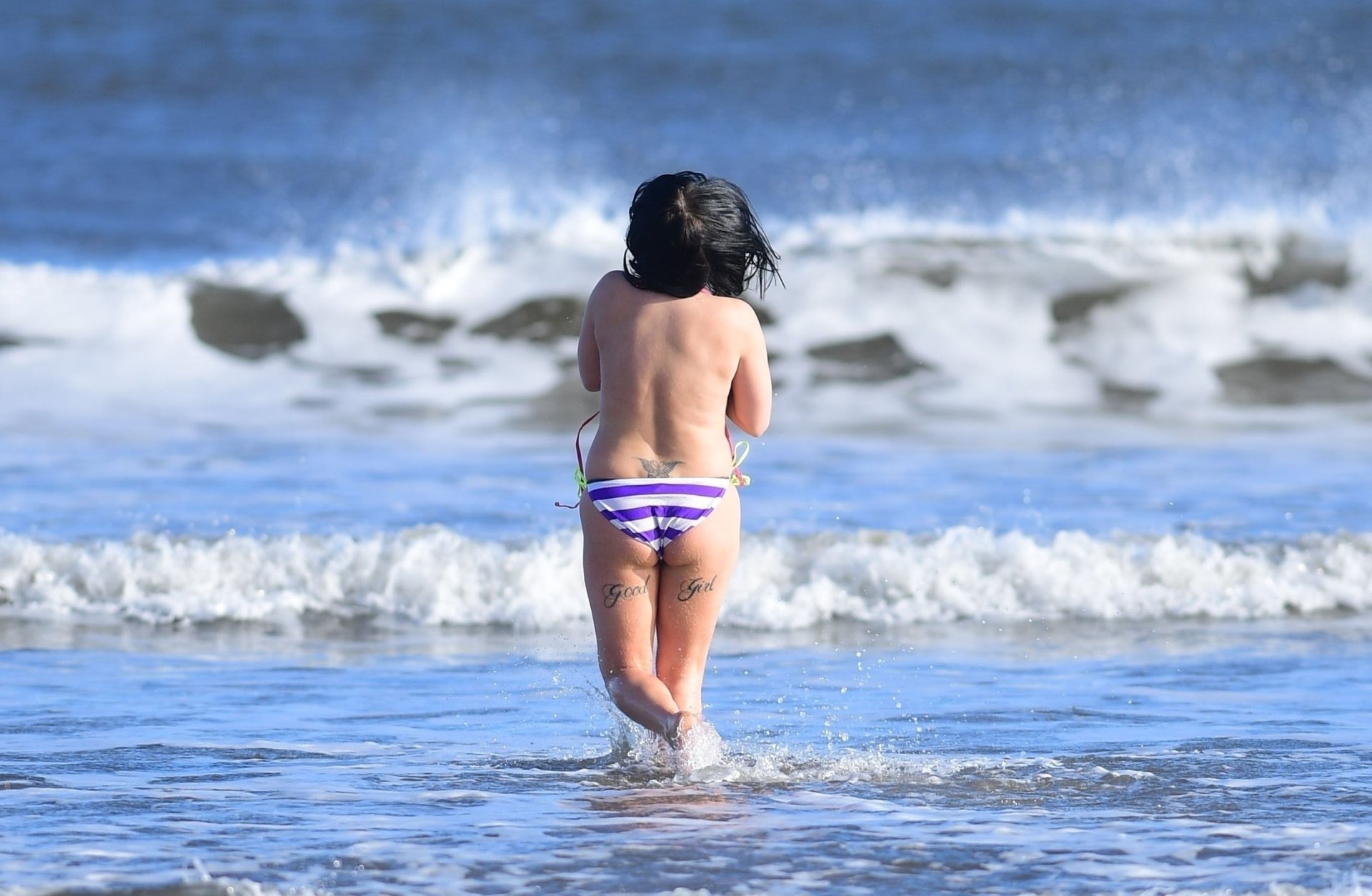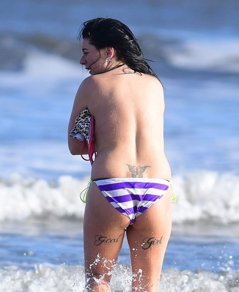 A estrela do Big Brother Simone Reed, 28, não deixou muita coisa para a imaginação ao revelar sua tatuagem ‘Good Girl’ enquanto perdia o top do biquíni após ser engolida por uma onda no mar durante as férias em Benidorm, Espanha, 16/02/2018.