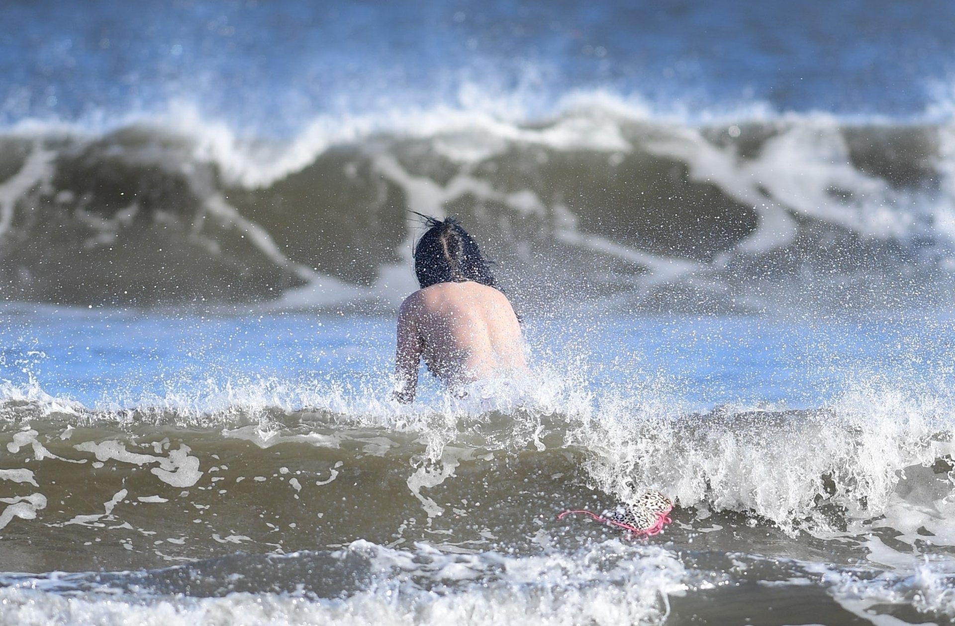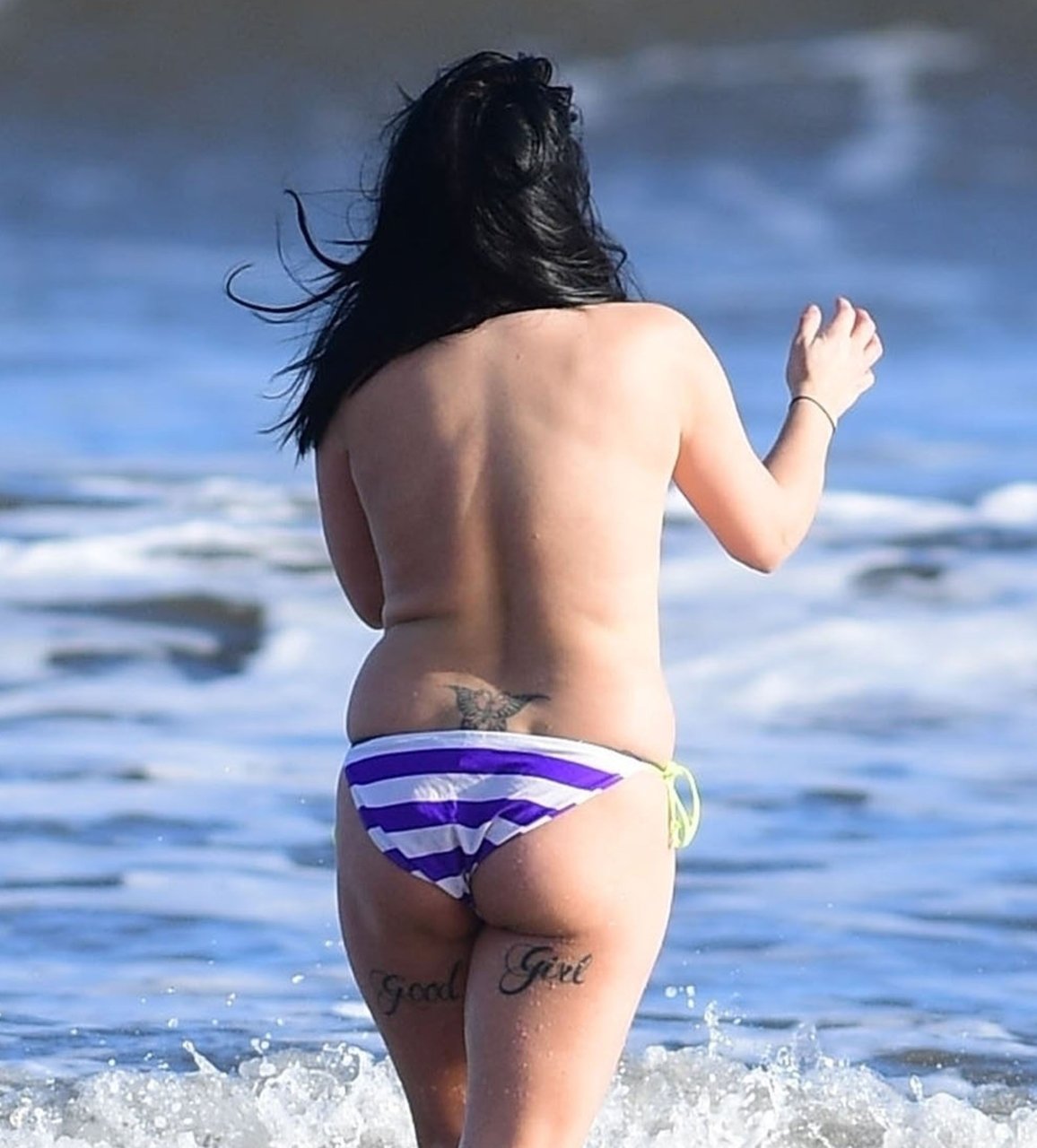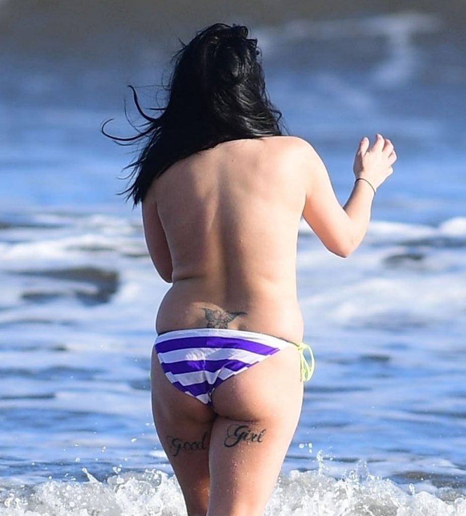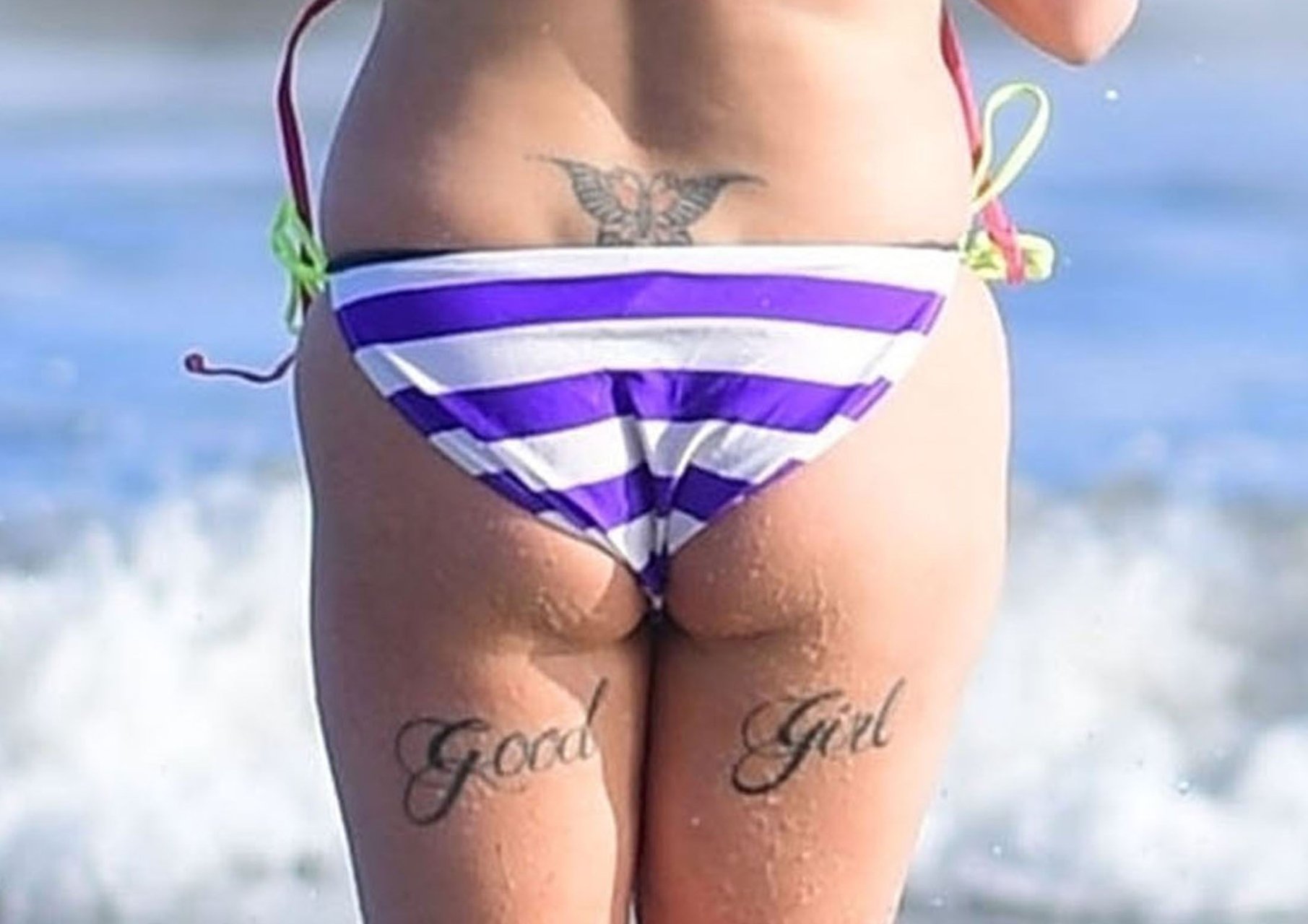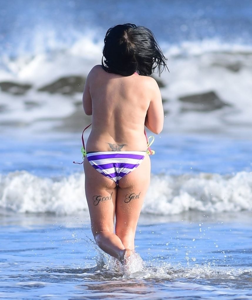 A estrela do Big Brother Simone Reed, 28, não deixou muita coisa para a imaginação ao revelar sua tatuagem ‘Good Girl’ enquanto perdia o top do biquíni após ser engolida por uma onda no mar durante as férias em Benidorm, Espanha, 16/02/2018.