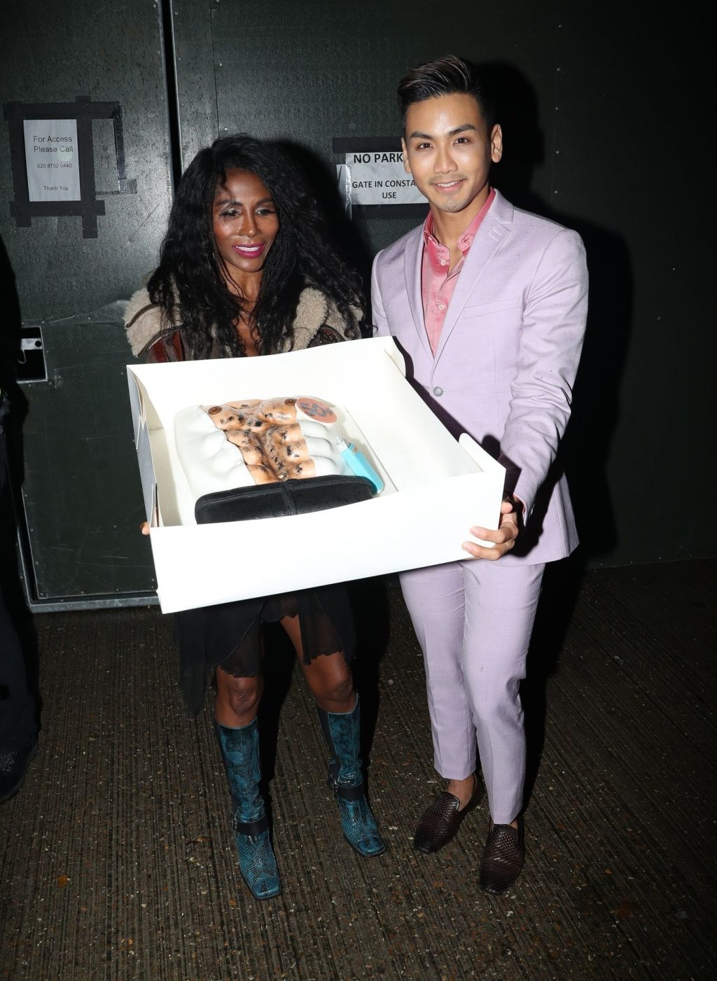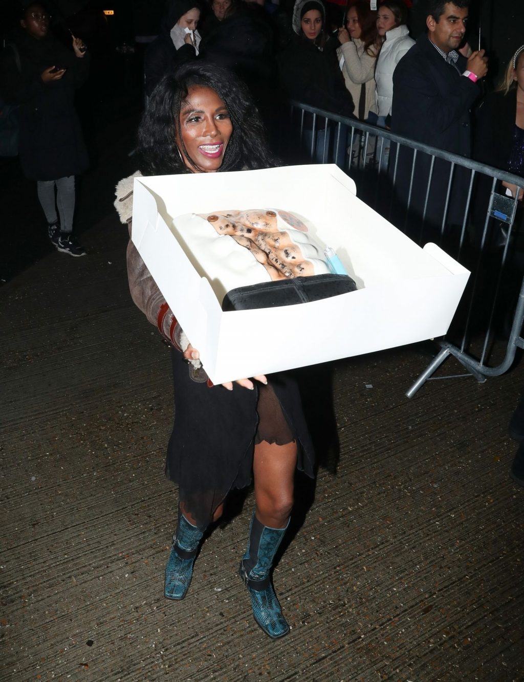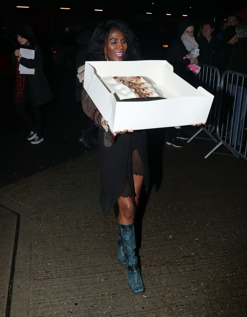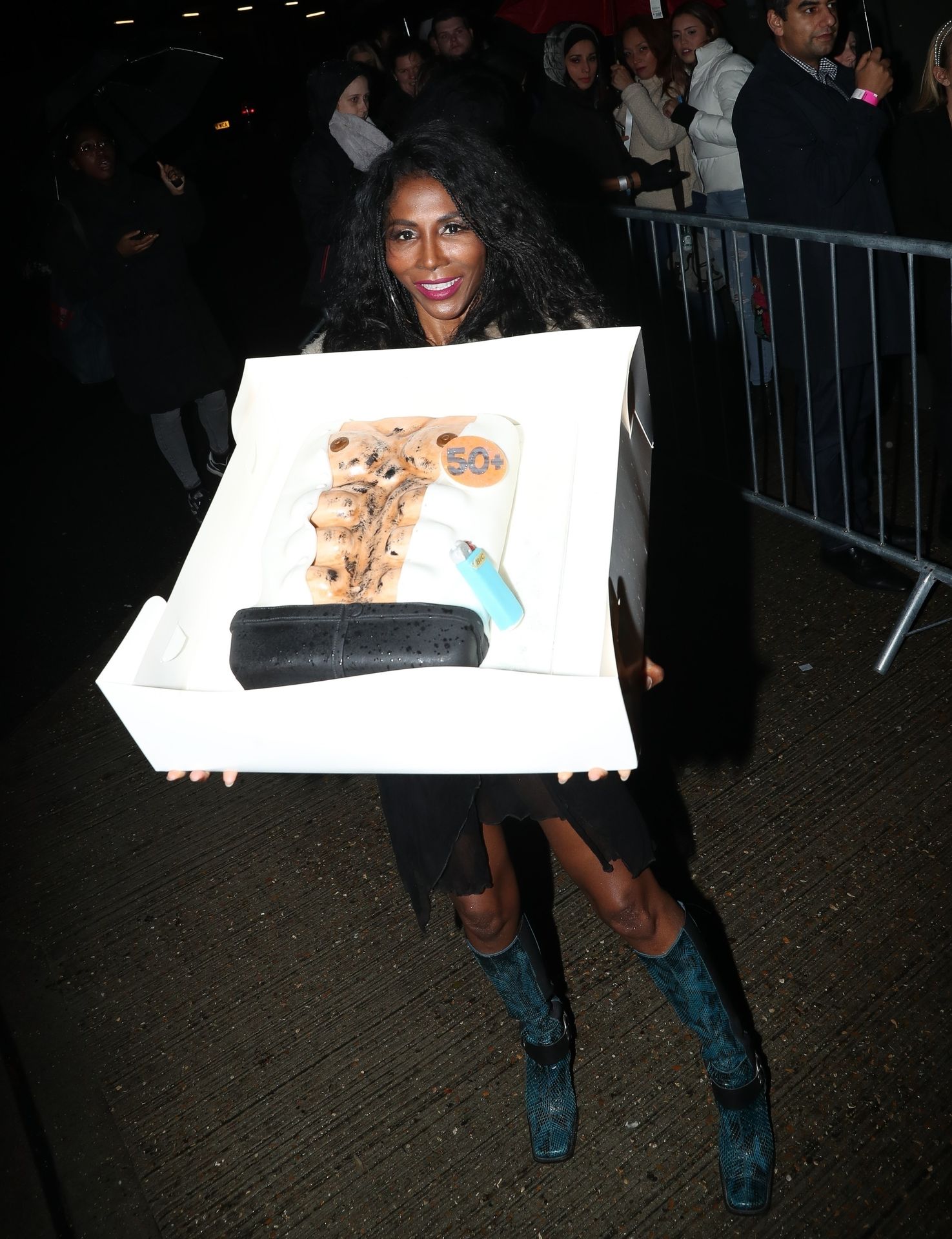 A cantora Sinitta usa um vestido preto curto sem sutiã enquanto entrega o Bolo de Aniversário de Simon Cowell nos estúdios do X Factor em Londres, 11/02/2019.