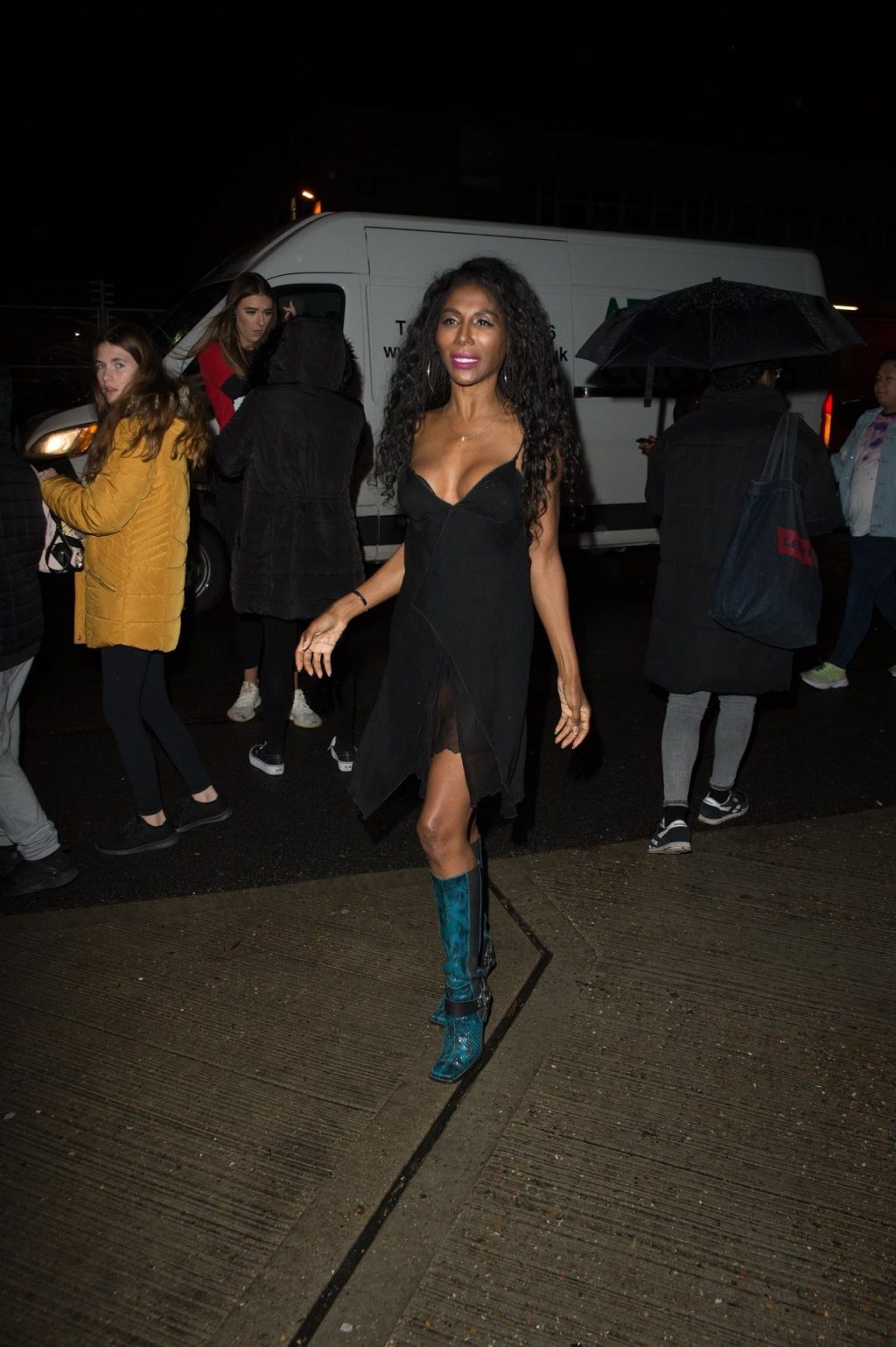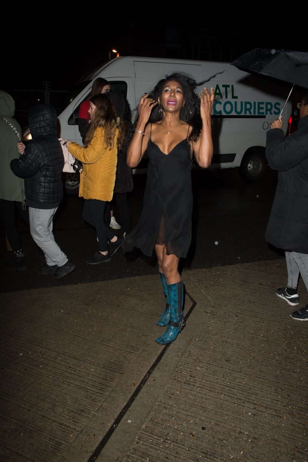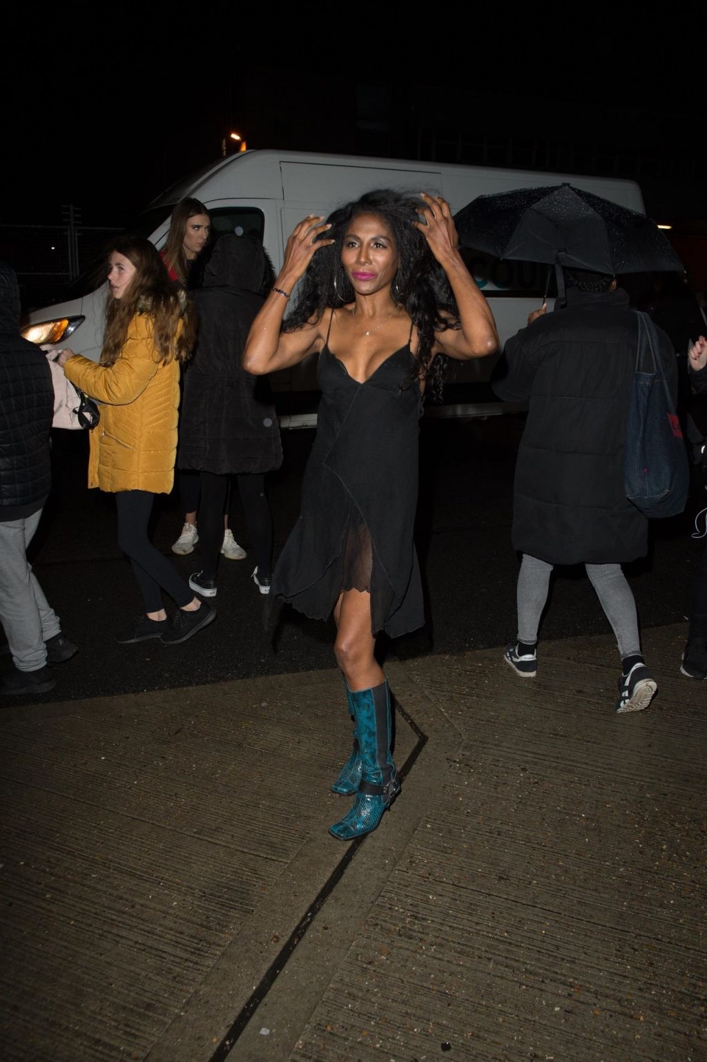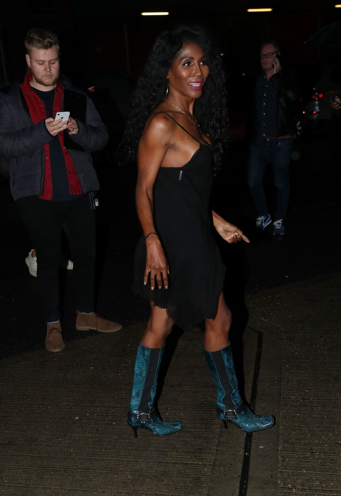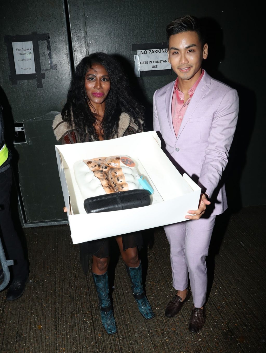 A cantora Sinitta usa um vestido preto curto sem sutiã enquanto entrega o Bolo de Aniversário de Simon Cowell nos estúdios do X Factor em Londres, 11/02/2019.