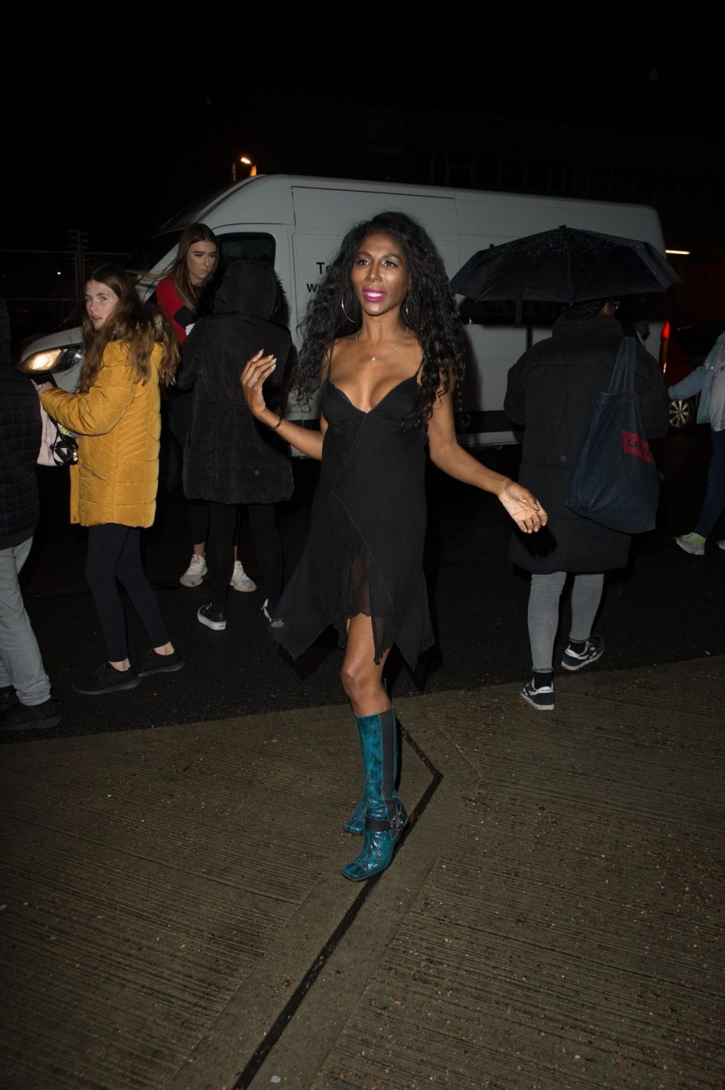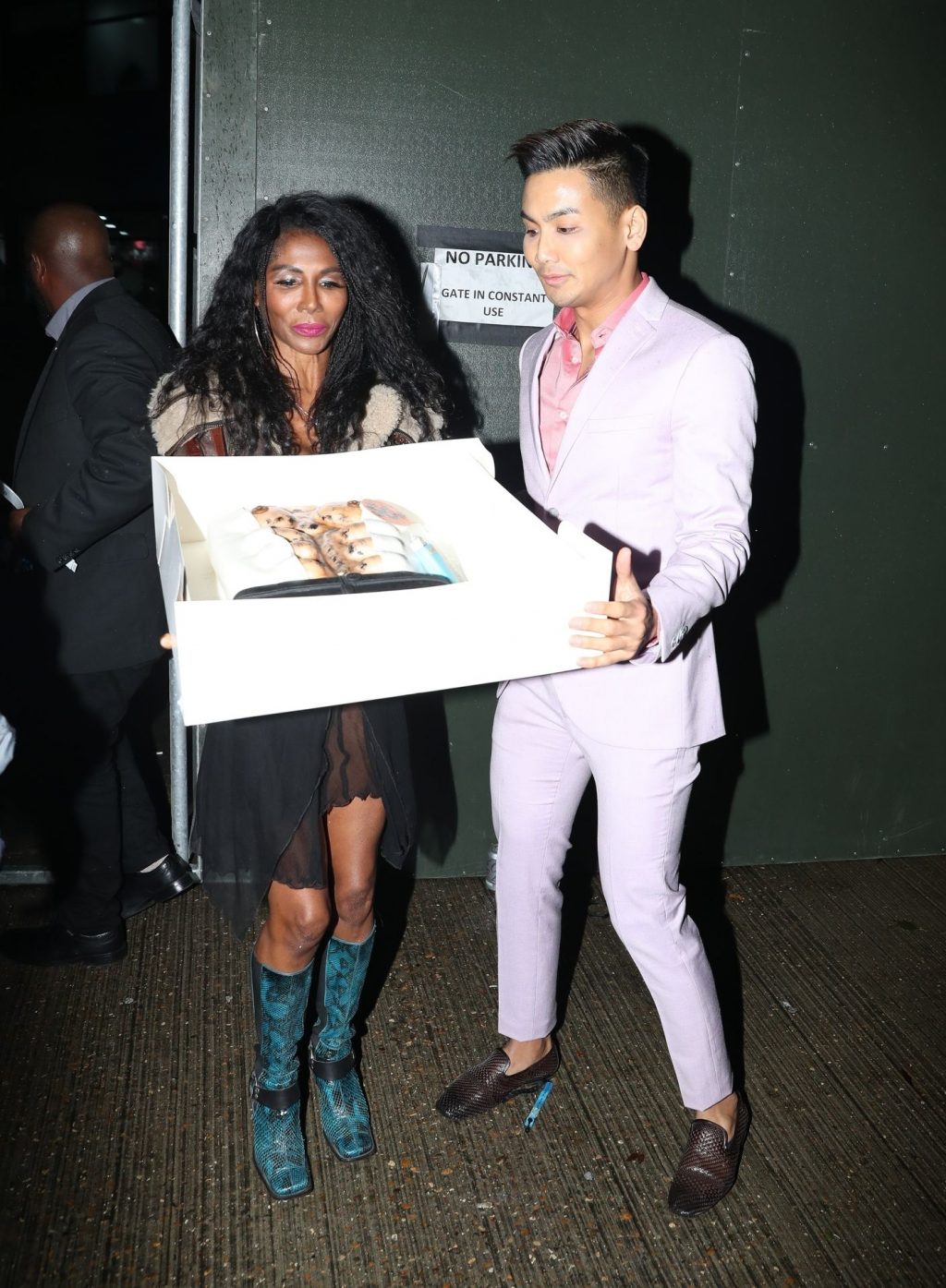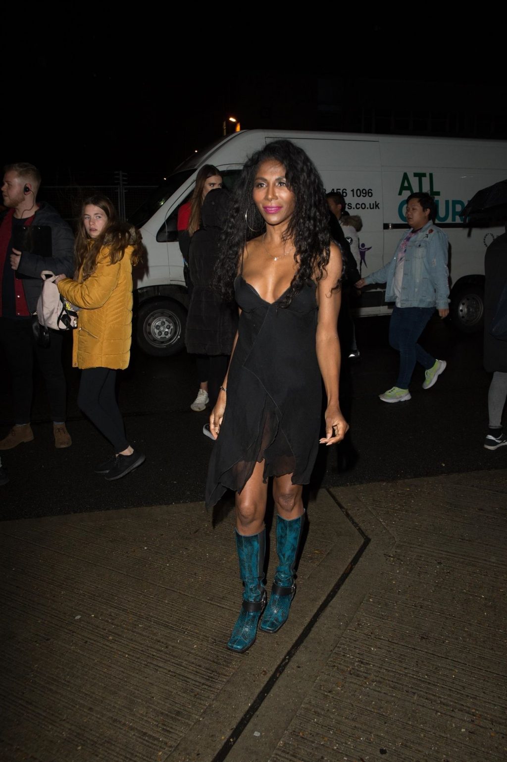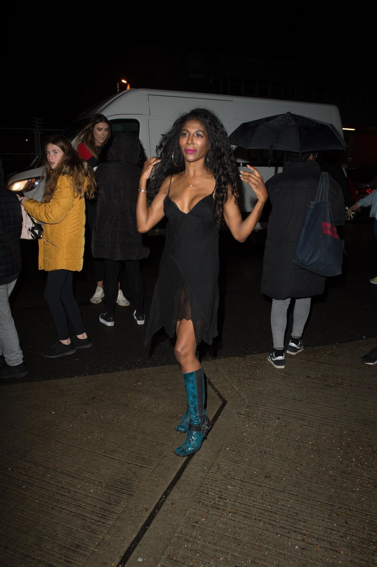 A cantora Sinitta usa um vestido preto curto sem sutiã enquanto entrega o Bolo de Aniversário de Simon Cowell nos estúdios do X Factor em Londres, 11/02/2019.