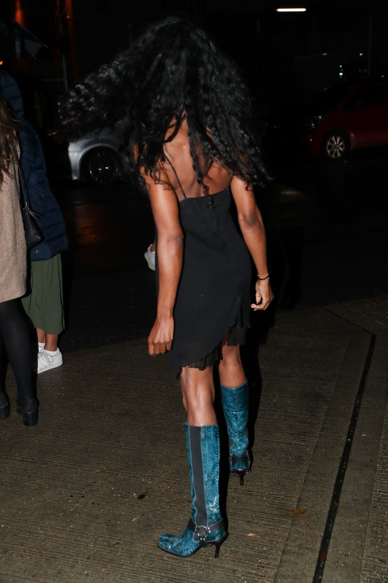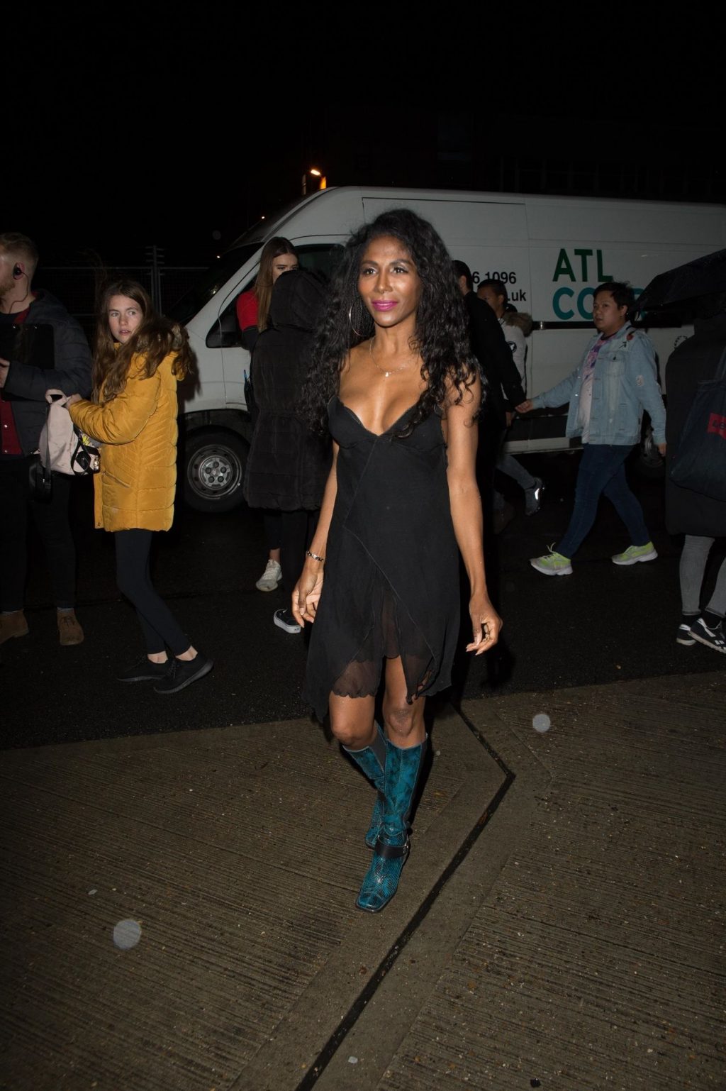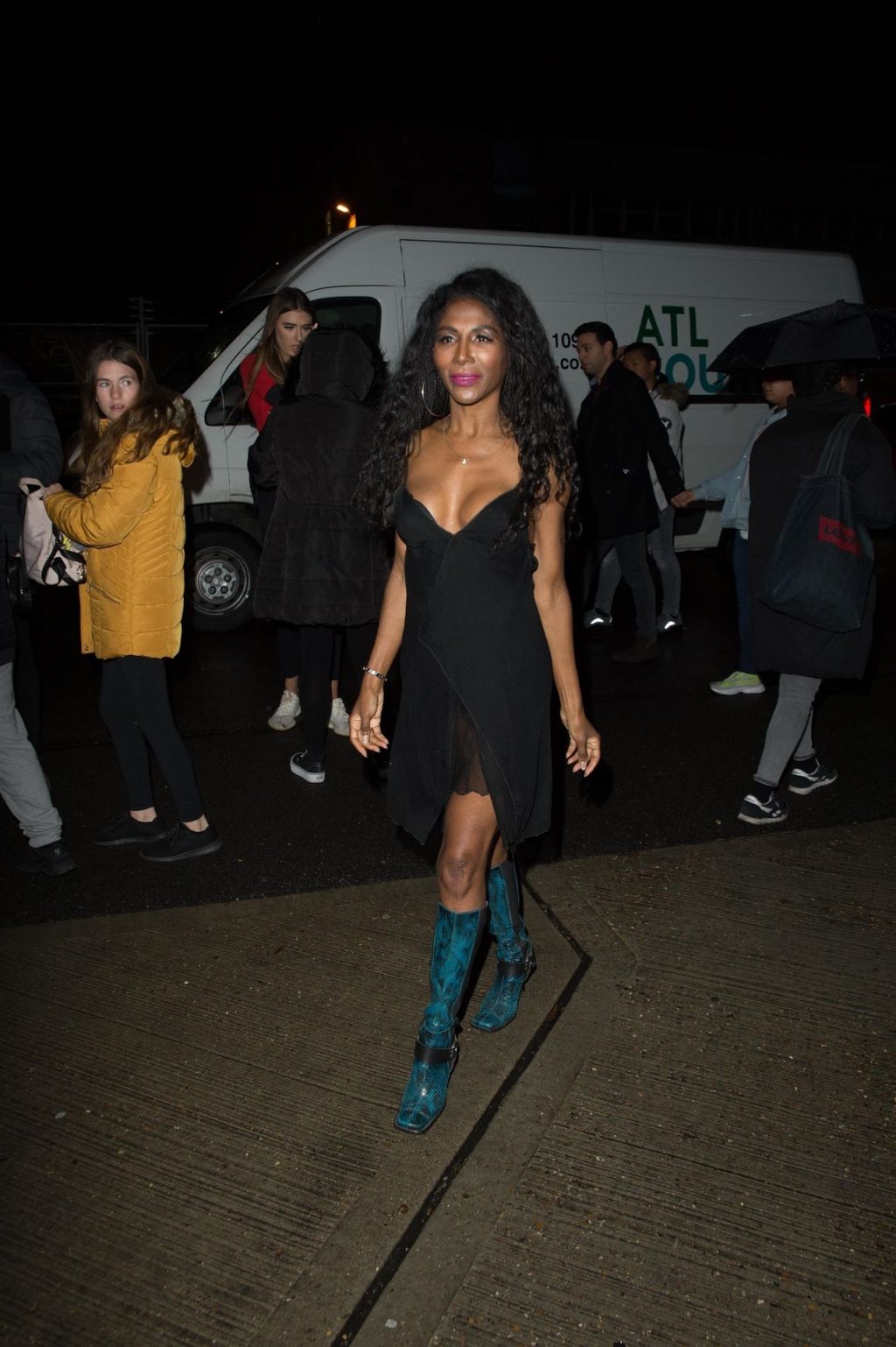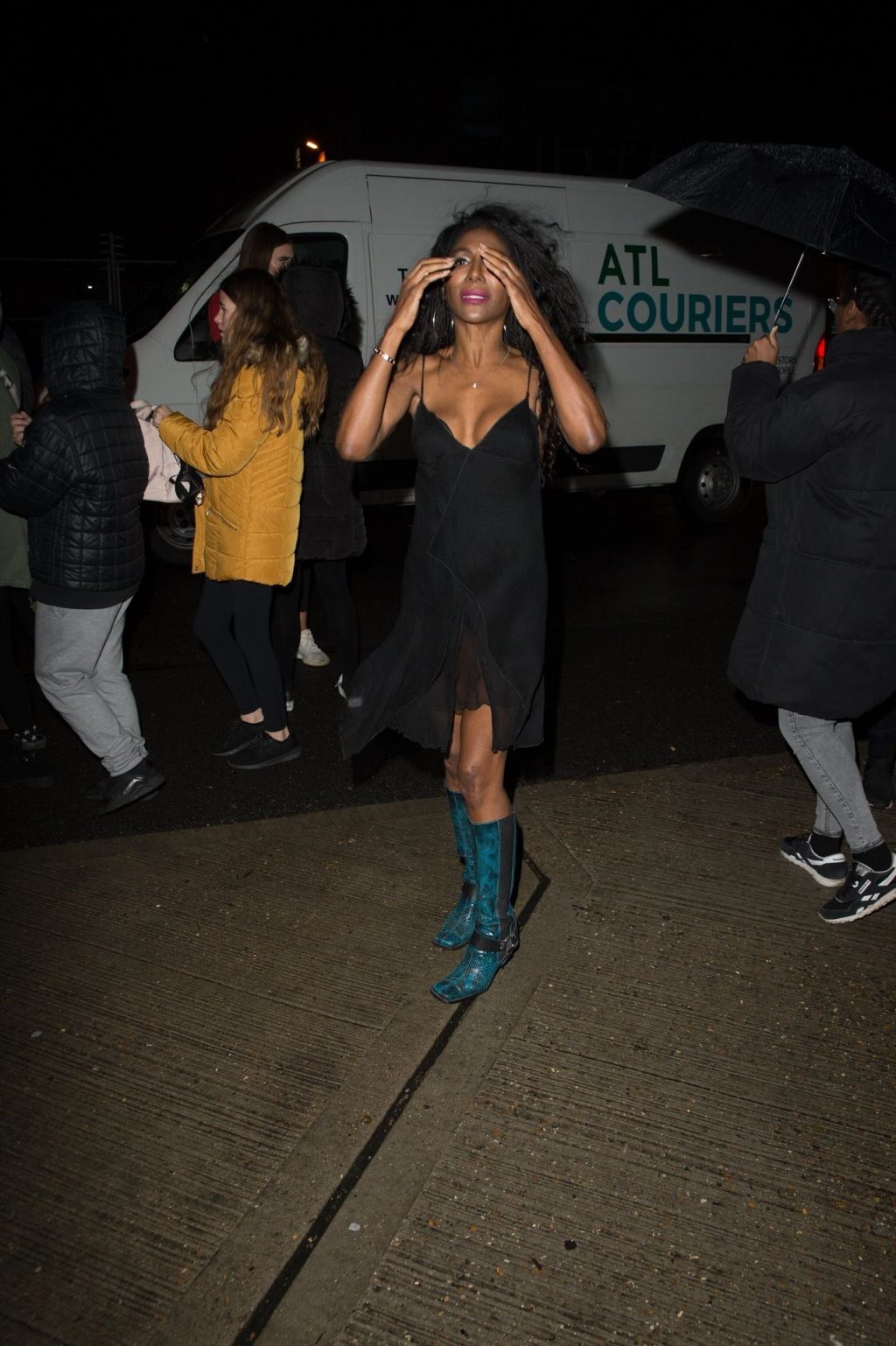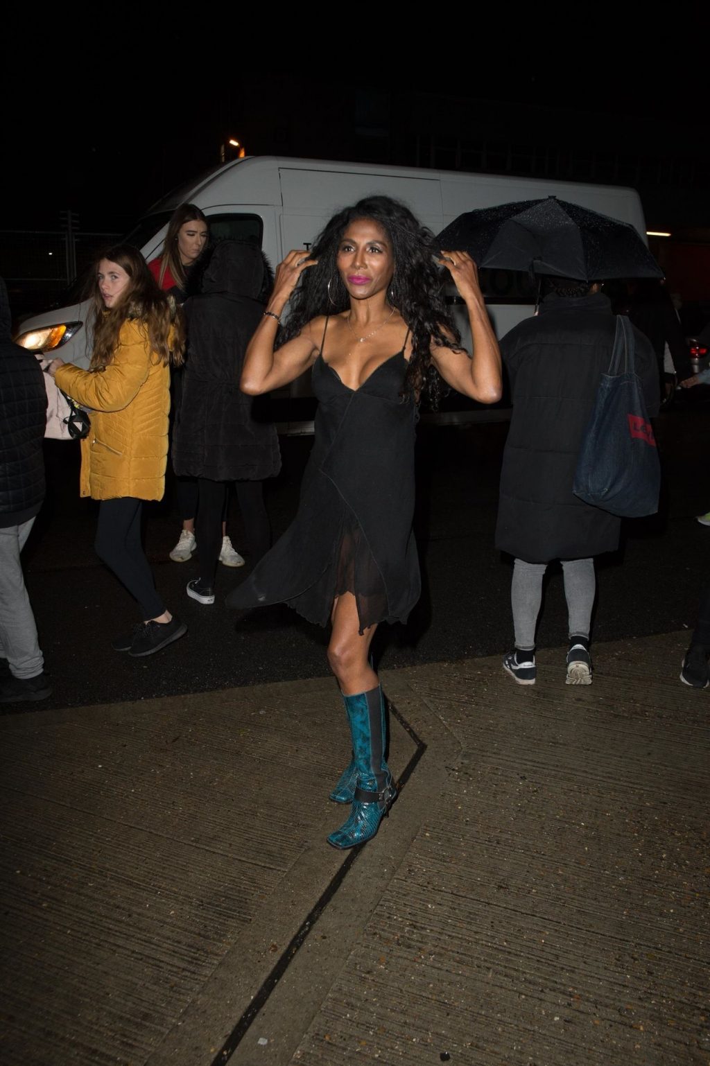 A cantora Sinitta usa um vestido preto curto sem sutiã enquanto entrega o Bolo de Aniversário de Simon Cowell nos estúdios do X Factor em Londres, 11/02/2019.