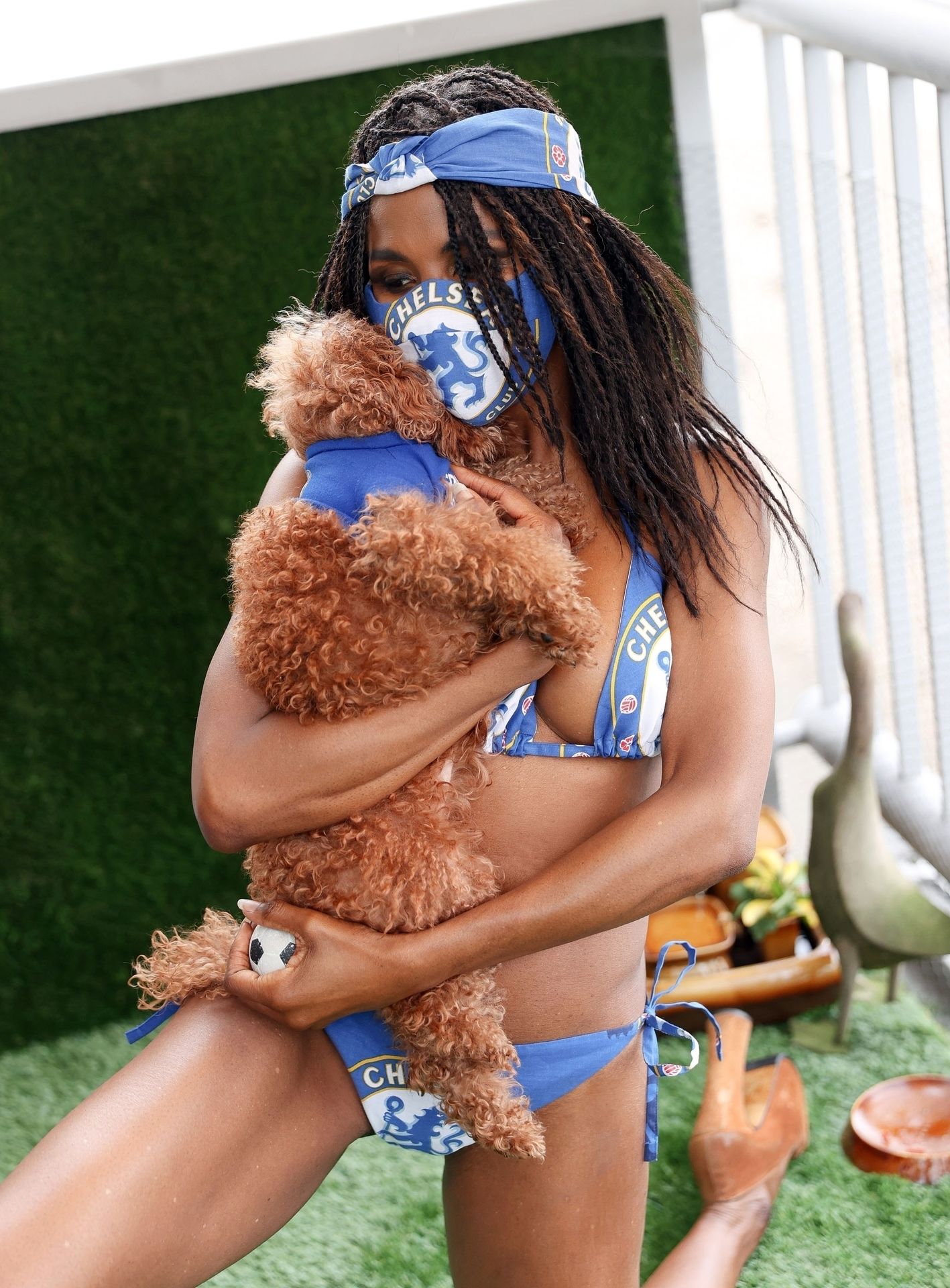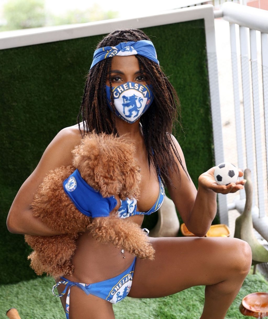 Cantora britânica nascida nos Estados Unidos, Sinitta (51), é fotografada usando um trikini temático do Chelsea FC enquanto se despe para celebrar o início da temporada de futebol com seu cachorro de estimação em Londres, 16/06/2020.