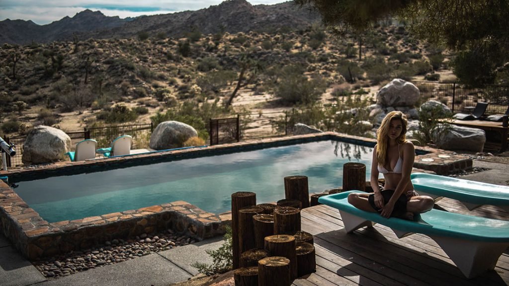 Jovem modelo Skye Blue aproveita um dia ensolarado à beira da piscina em Joshua Tree com o fotógrafo Allen Henson (2018). Ela refrescou seu corpo quente sob o chuveiro.