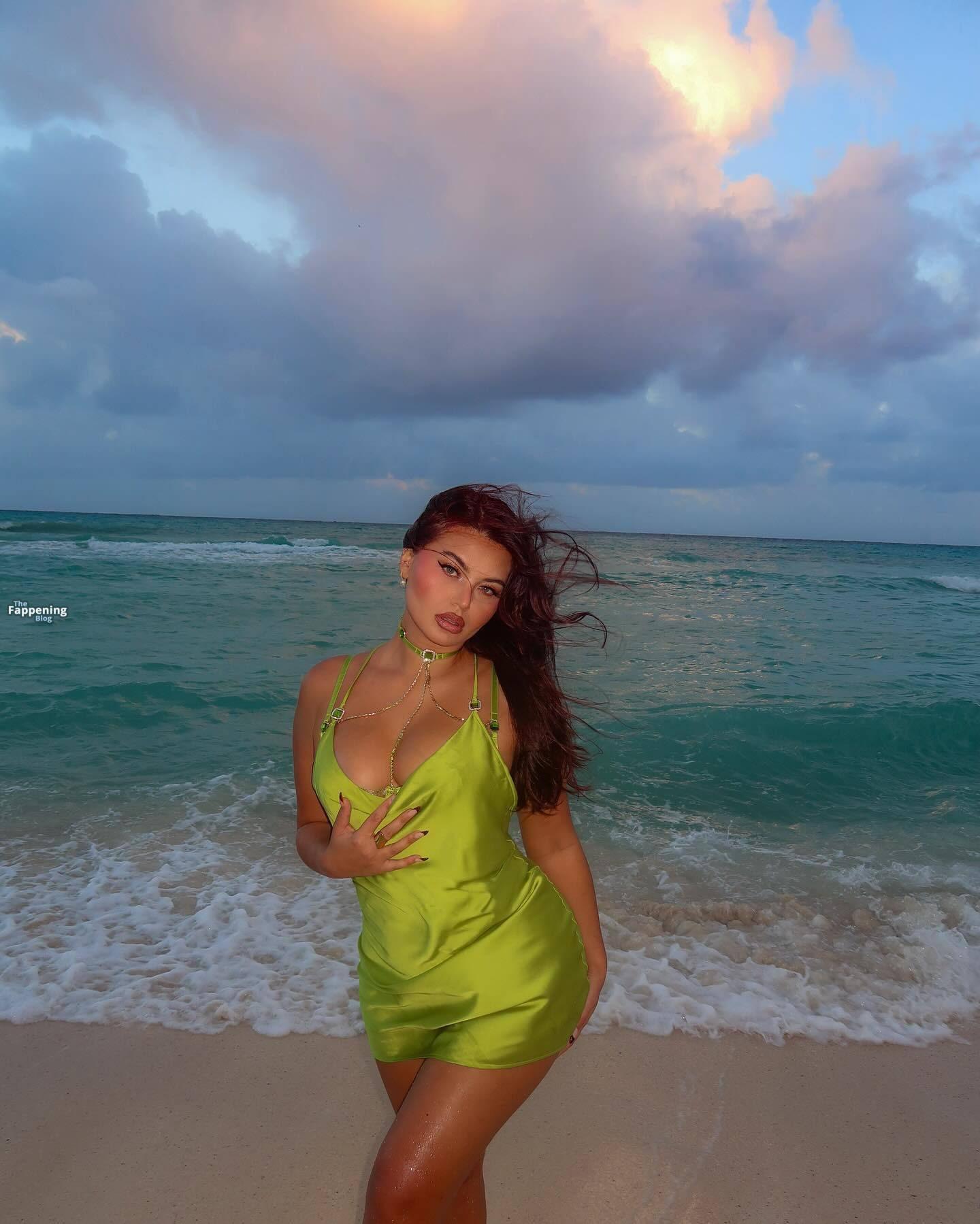 A modelo Sofia Jamora foi fotografada usando um biquíni verde minúsculo, exibindo seus seios e bumbum impecáveis.