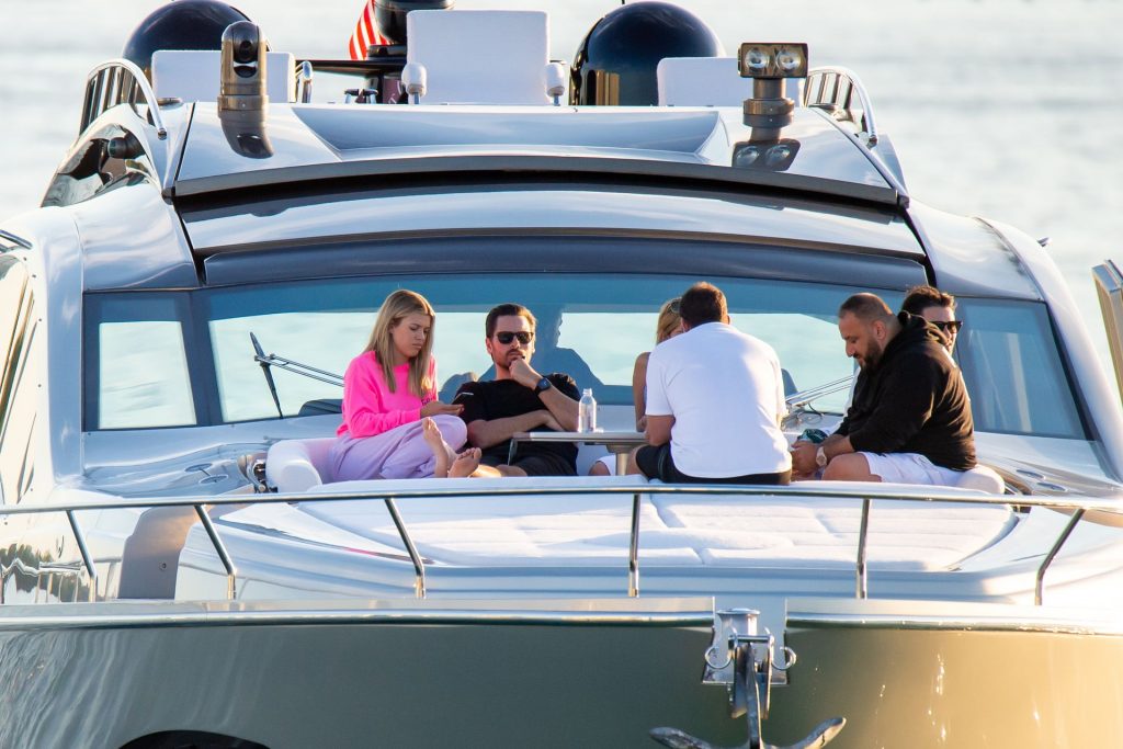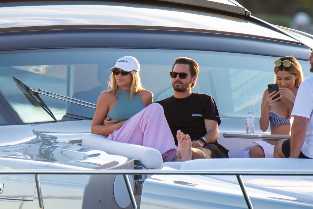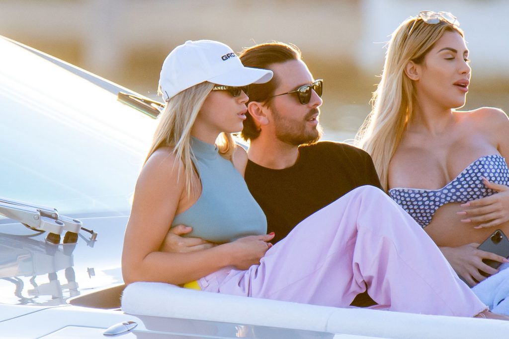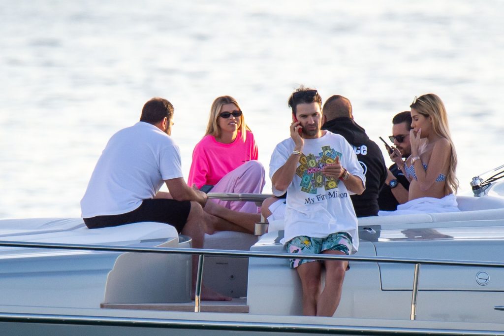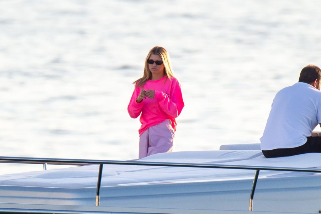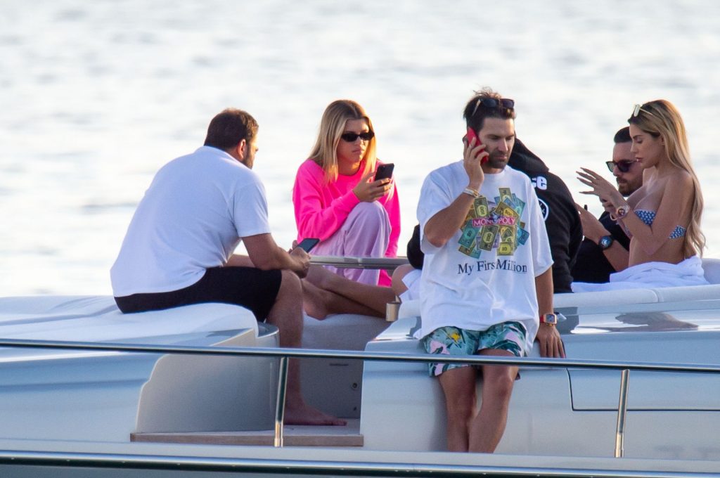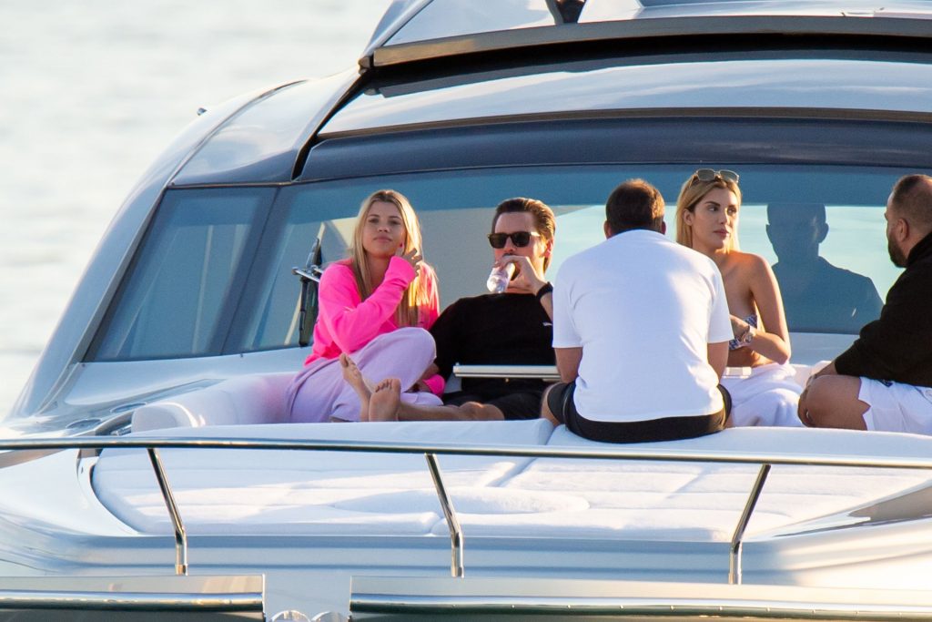 Sofia Richie e Scott Disick se abraçam em um navio de cruzeiro de luxo em Miami, onde Sofia Richie usa dois looks diferentes. Sofia Richie foi vista pela primeira vez usando uma camisa rosa brilhante de manga longa com “cuidado com os tubarões” escrito nas costas, que faz parte da coleção de mercadorias Groot de Dave Grutman. A loira depois trocou para uma blusa cinza sem mangas e colocou seu boné branco de beisebol. O casal estava no iate de luxo com amigos, incluindo Dave Grutman, a quem o barco pertence.