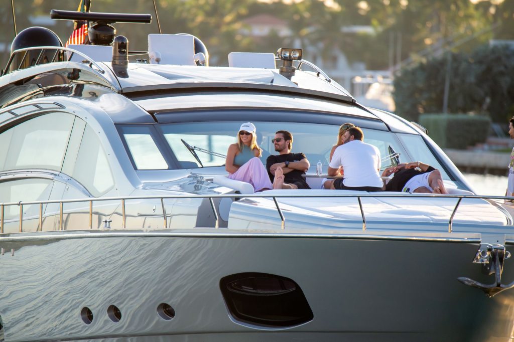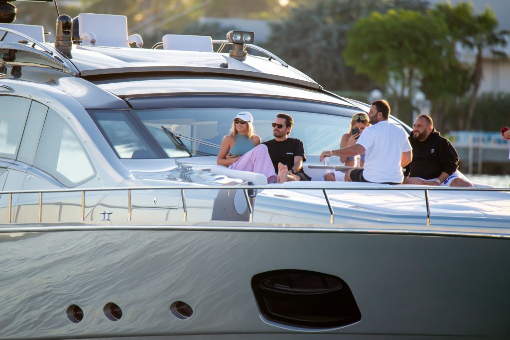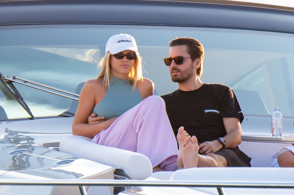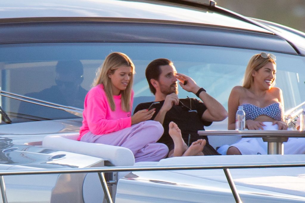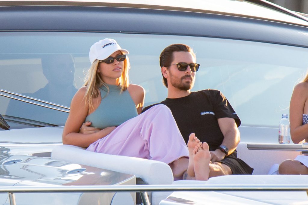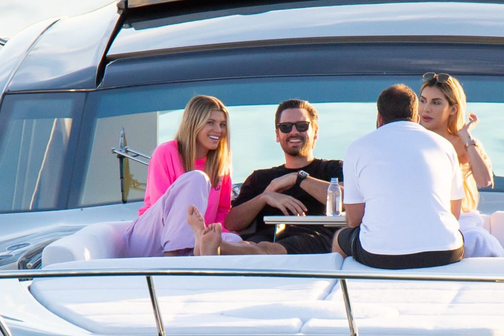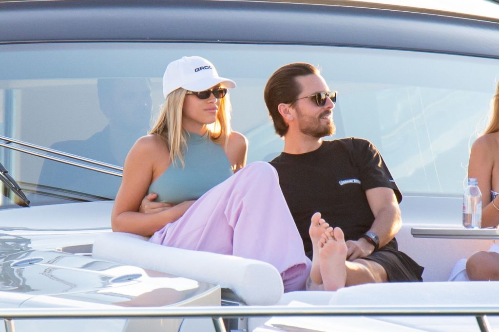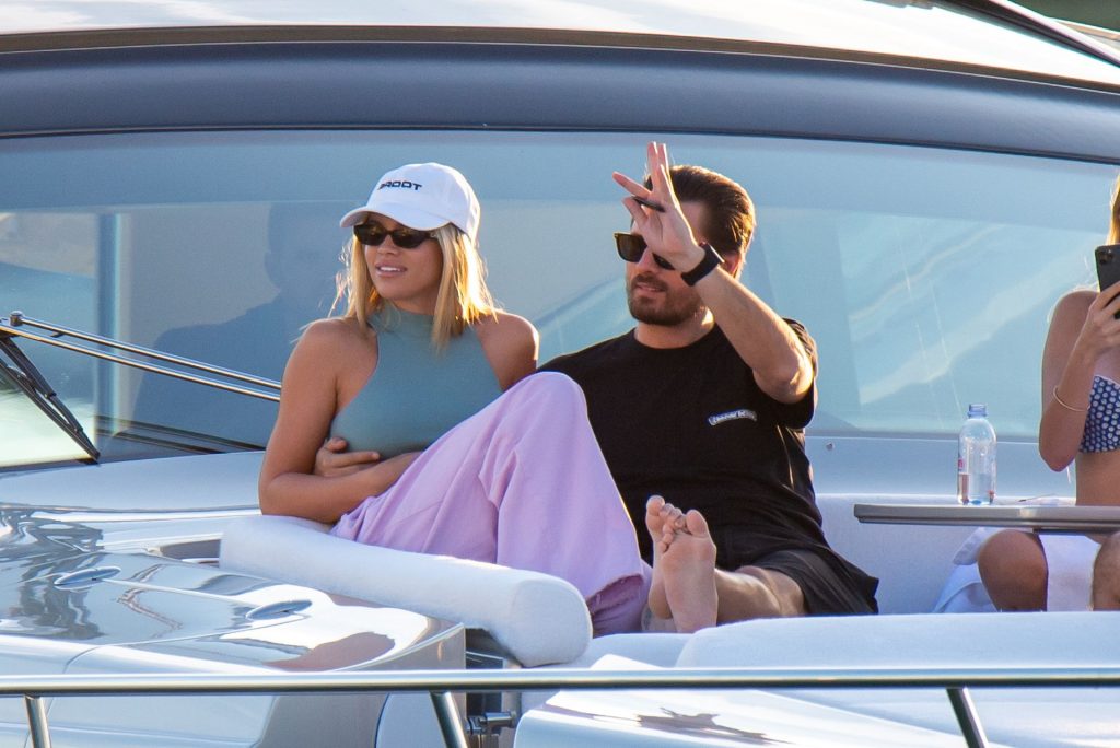 Sofia Richie e Scott Disick se abraçam em um navio de cruzeiro de luxo em Miami, onde Sofia Richie usa dois looks diferentes. Sofia Richie foi vista pela primeira vez usando uma camisa rosa brilhante de manga longa com “cuidado com os tubarões” escrito nas costas, que faz parte da coleção de mercadorias Groot de Dave Grutman. A loira depois trocou para uma blusa cinza sem mangas e colocou seu boné branco de beisebol. O casal estava no iate de luxo com amigos, incluindo Dave Grutman, a quem o barco pertence.