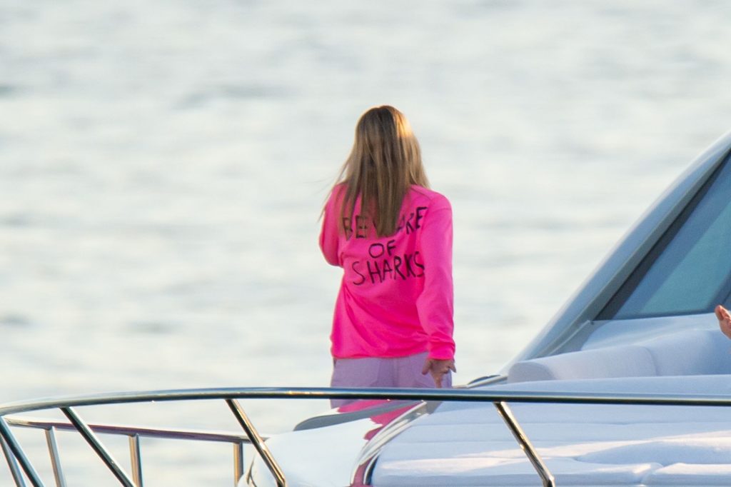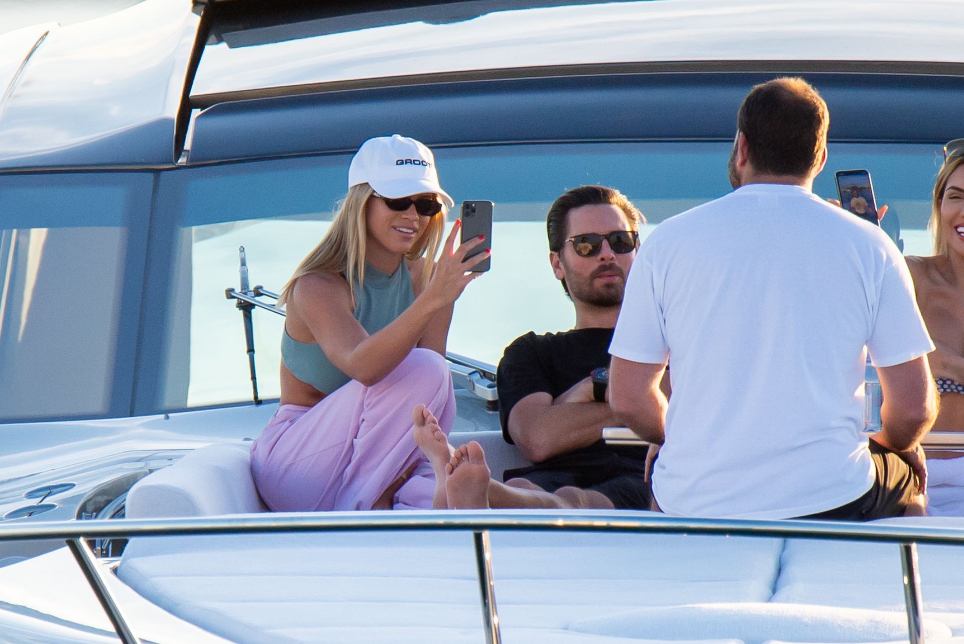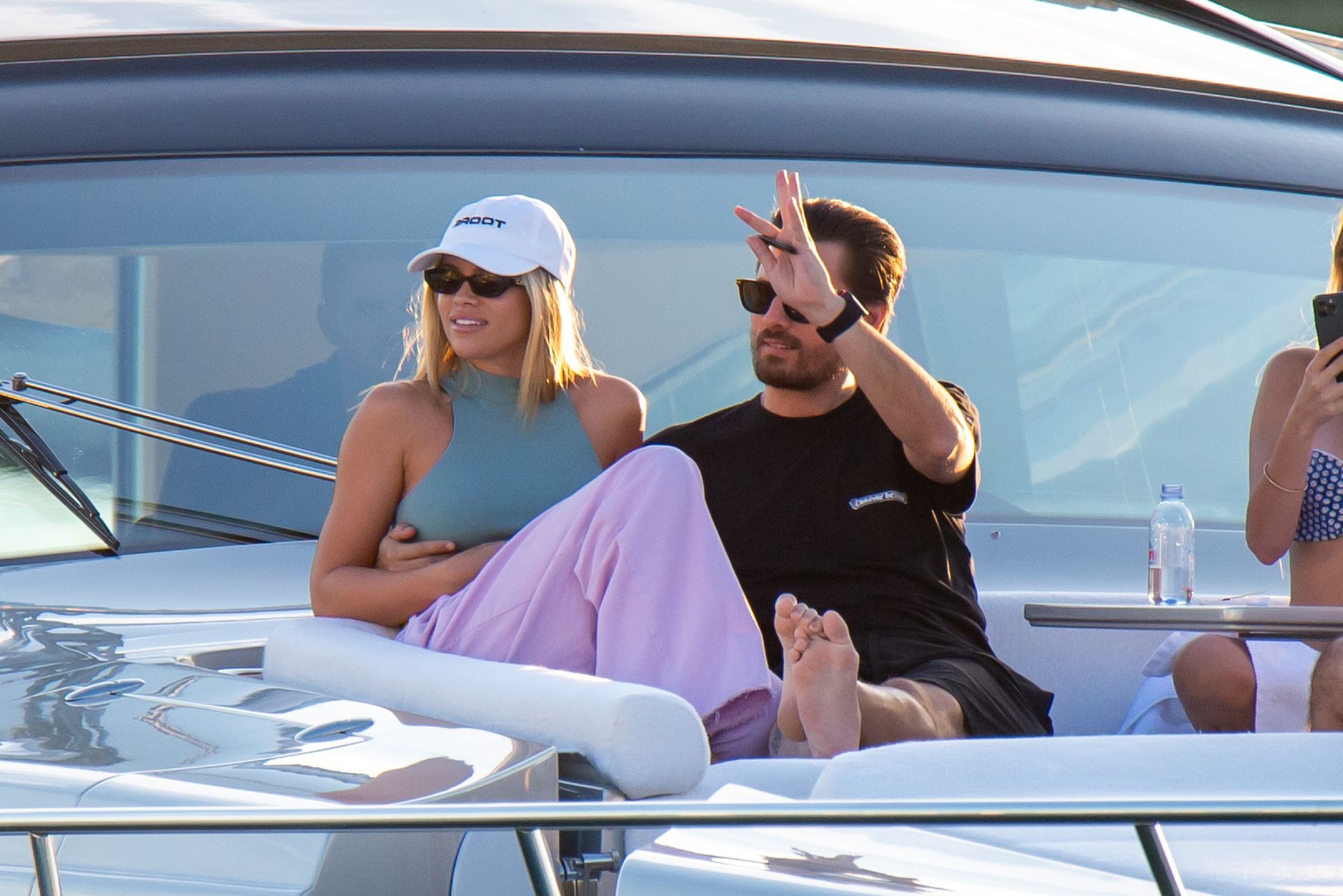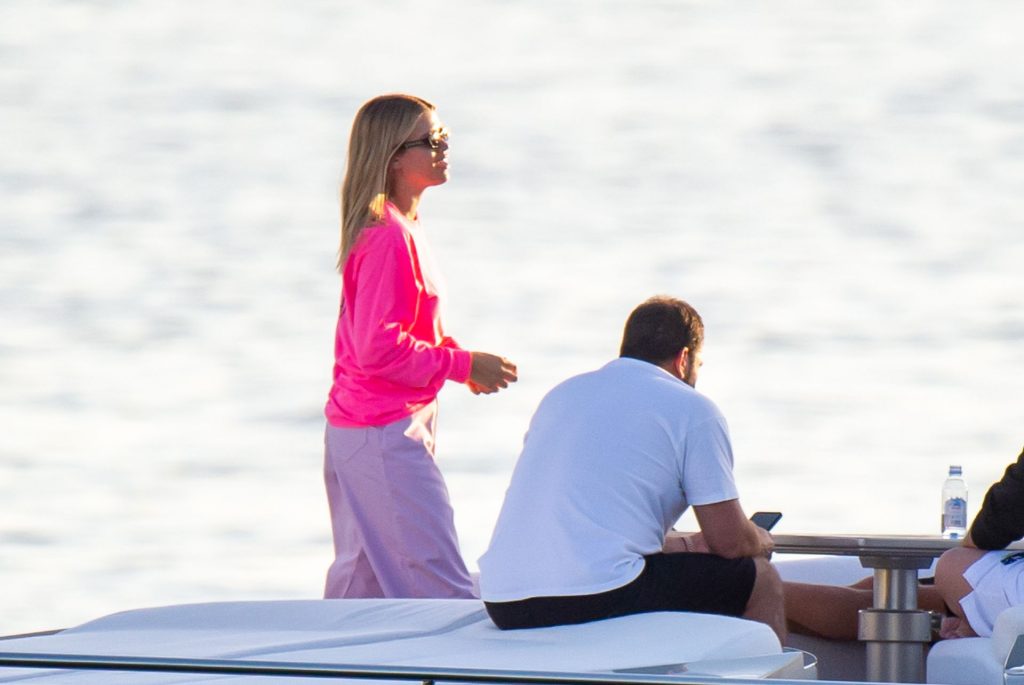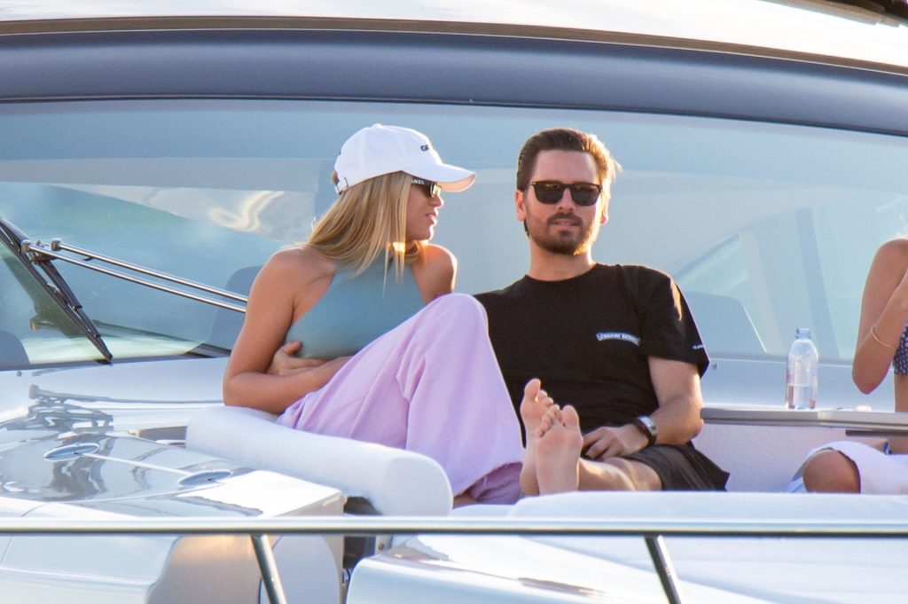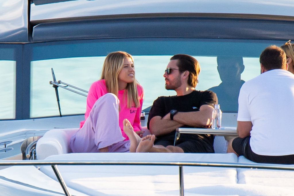 Sofia Richie e Scott Disick se abraçam em um navio de cruzeiro de luxo em Miami, onde Sofia Richie usa dois looks diferentes. Sofia Richie foi vista pela primeira vez usando uma camisa rosa brilhante de manga longa com “cuidado com os tubarões” escrito nas costas, que faz parte da coleção de mercadorias Groot de Dave Grutman. A loira depois trocou para uma blusa cinza sem mangas e colocou seu boné branco de beisebol. O casal estava no iate de luxo com amigos, incluindo Dave Grutman, a quem o barco pertence.