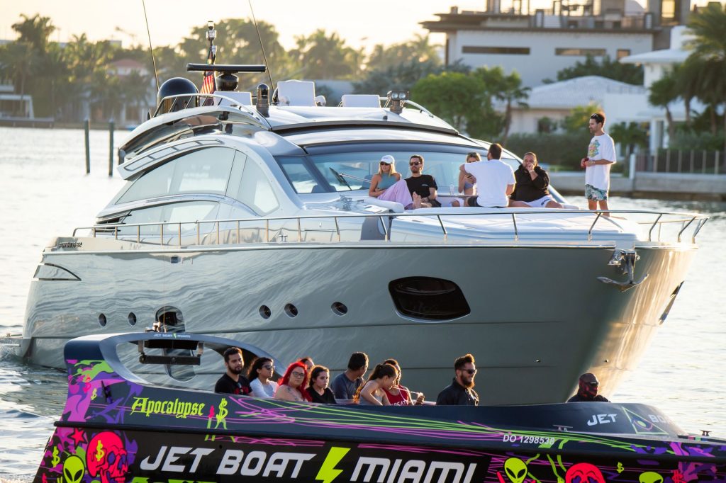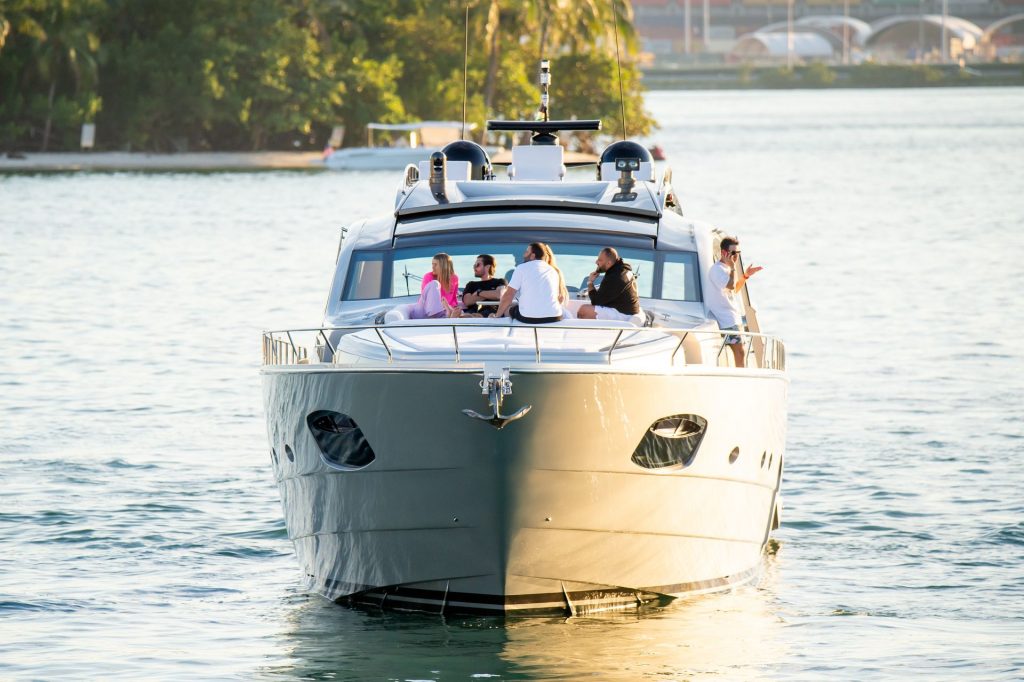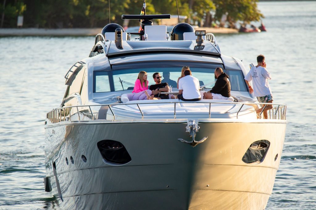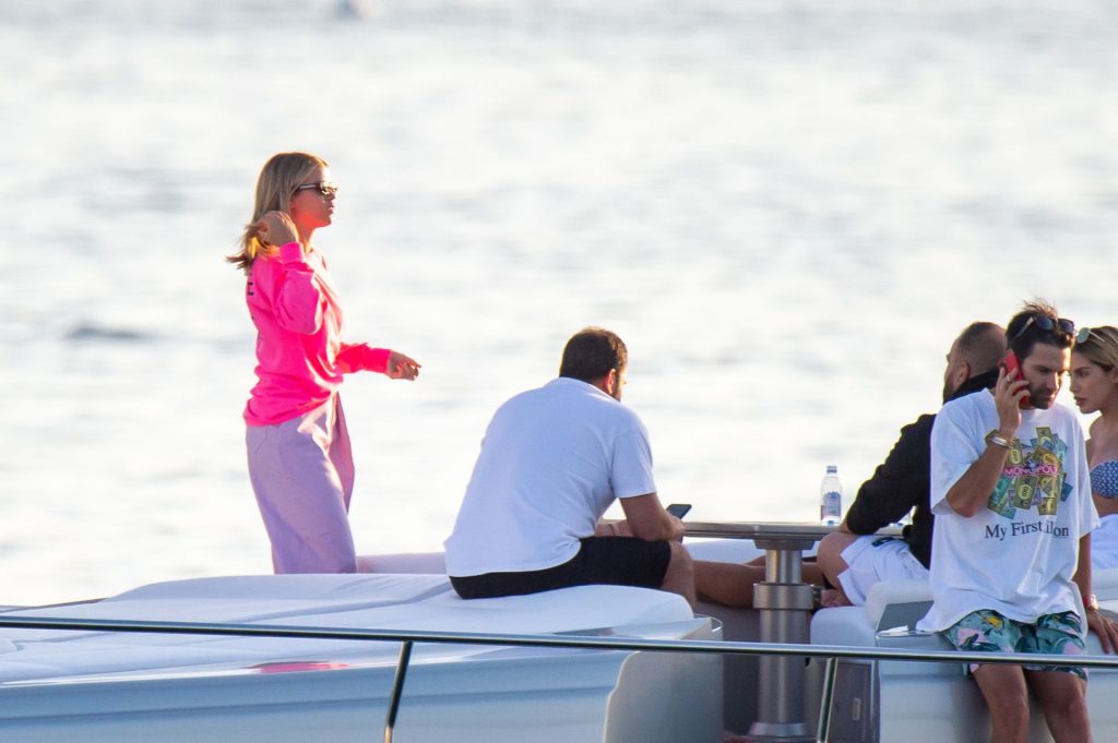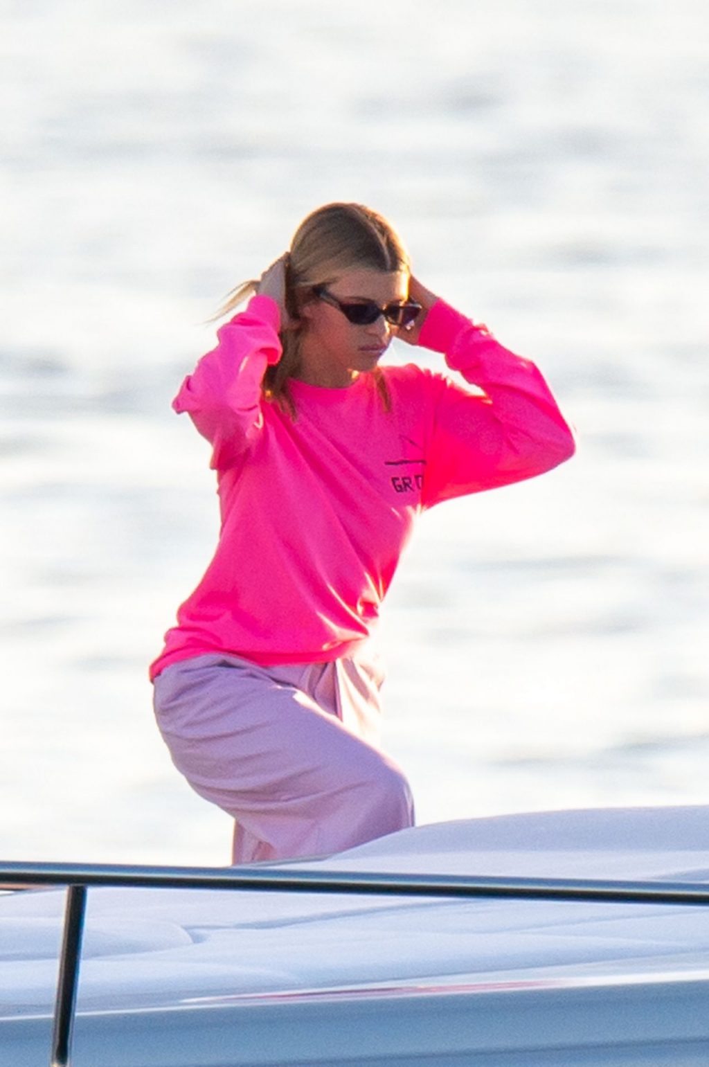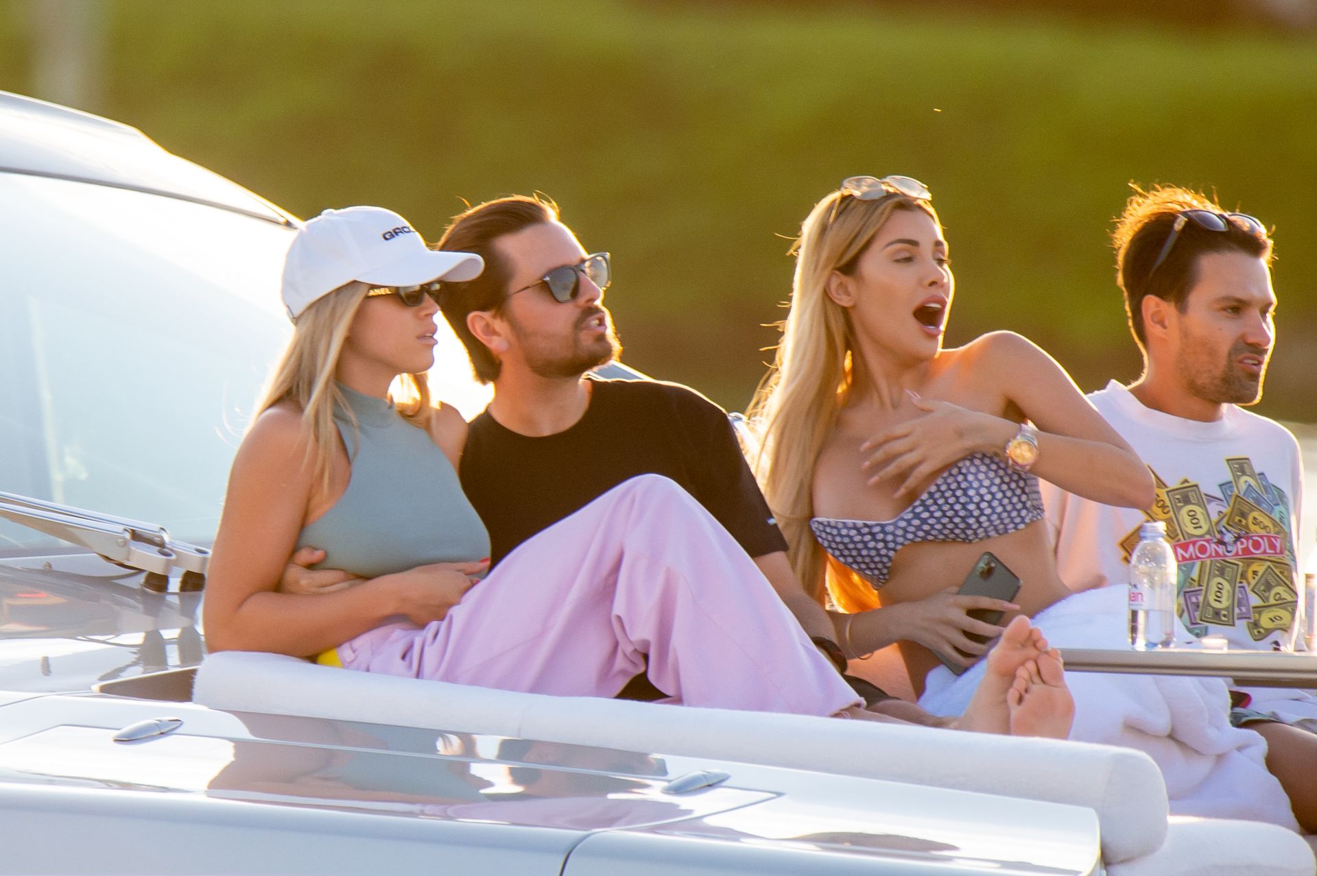 Sofia Richie e Scott Disick se abraçam em um navio de cruzeiro de luxo em Miami, onde Sofia Richie usa dois looks diferentes. Sofia Richie foi vista pela primeira vez usando uma camisa rosa brilhante de manga longa com “cuidado com os tubarões” escrito nas costas, que faz parte da coleção de mercadorias Groot de Dave Grutman. A loira depois trocou para uma blusa cinza sem mangas e colocou seu boné branco de beisebol. O casal estava no iate de luxo com amigos, incluindo Dave Grutman, a quem o barco pertence.