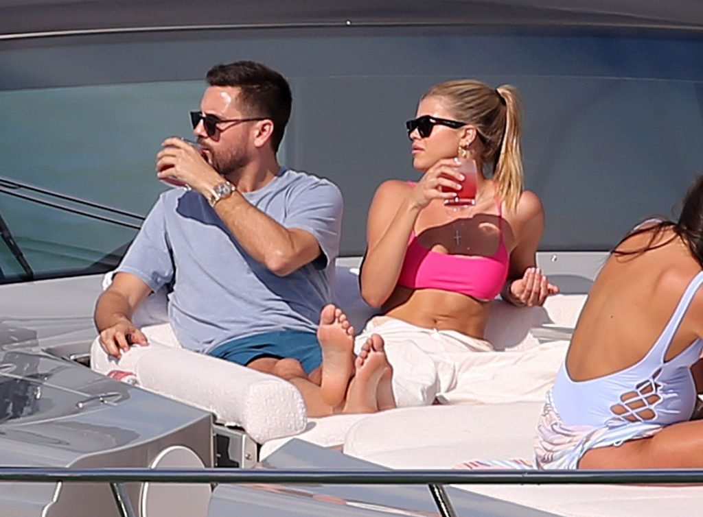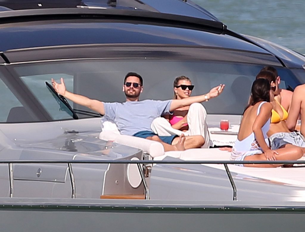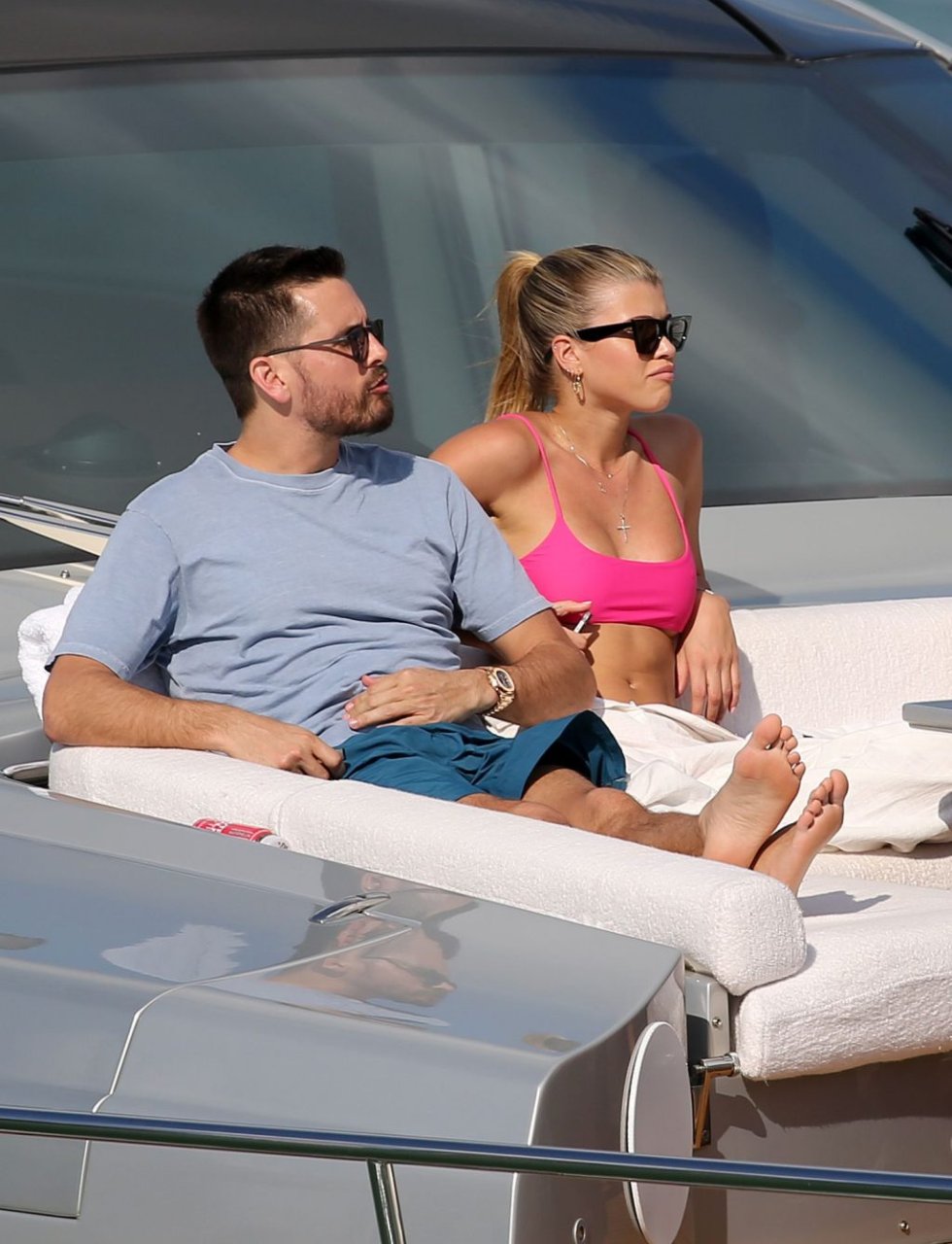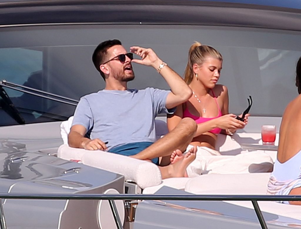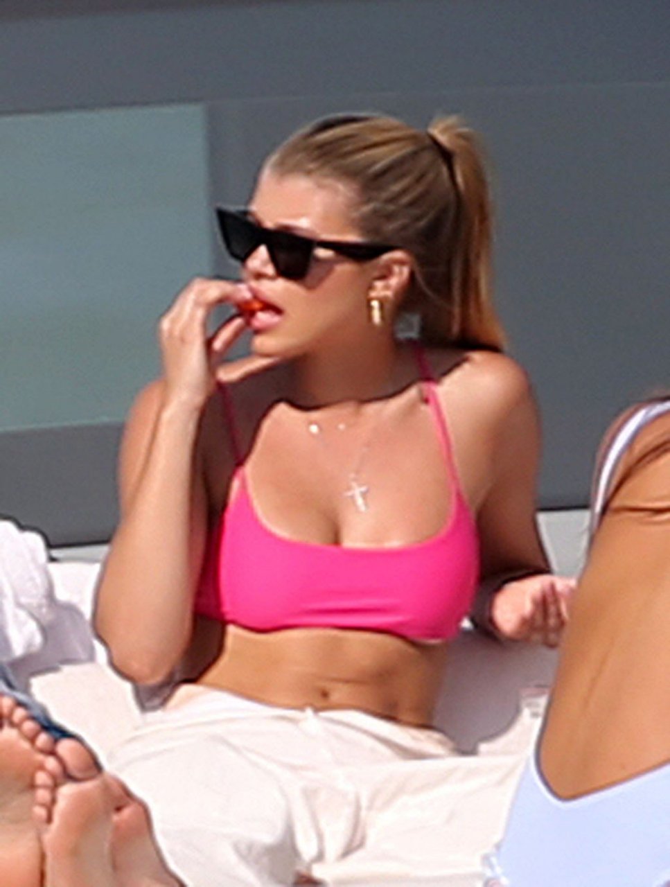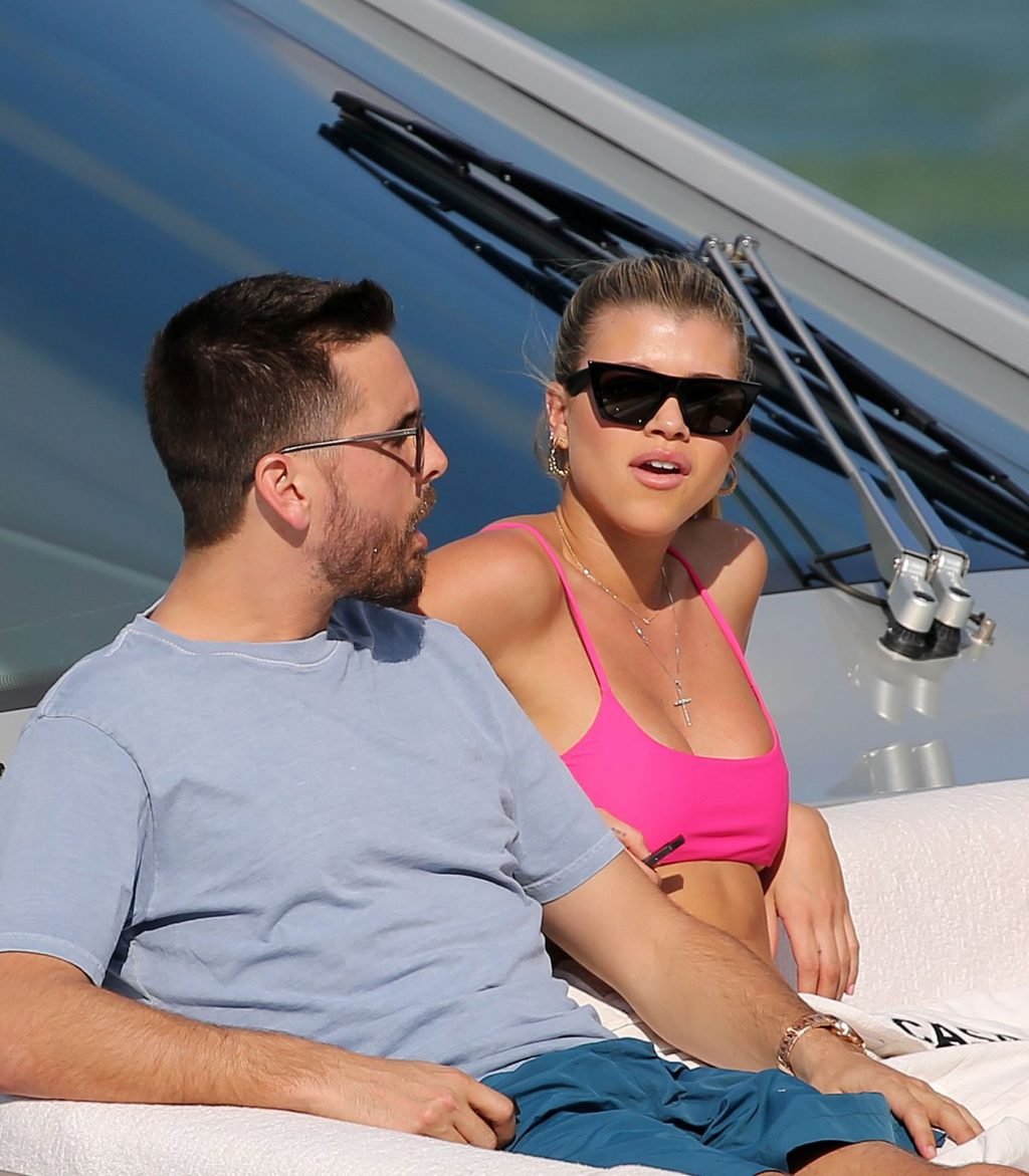 Model Sofia Richie usa um top de biquíni rosa quente enquanto relaxa em um iate com o namorado Scott Disick em Miami, 17/02/2019.