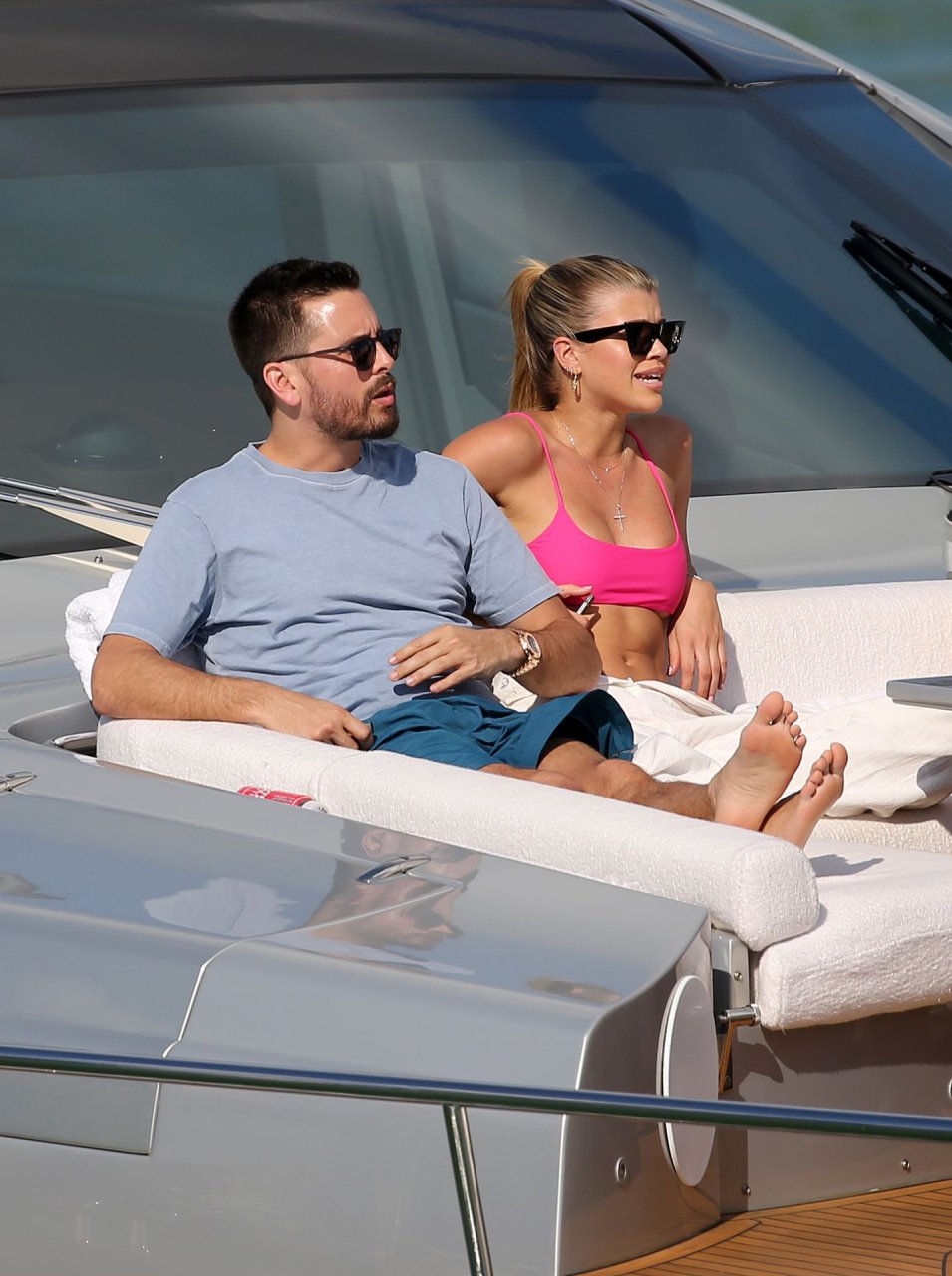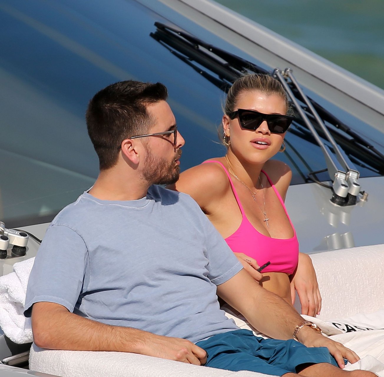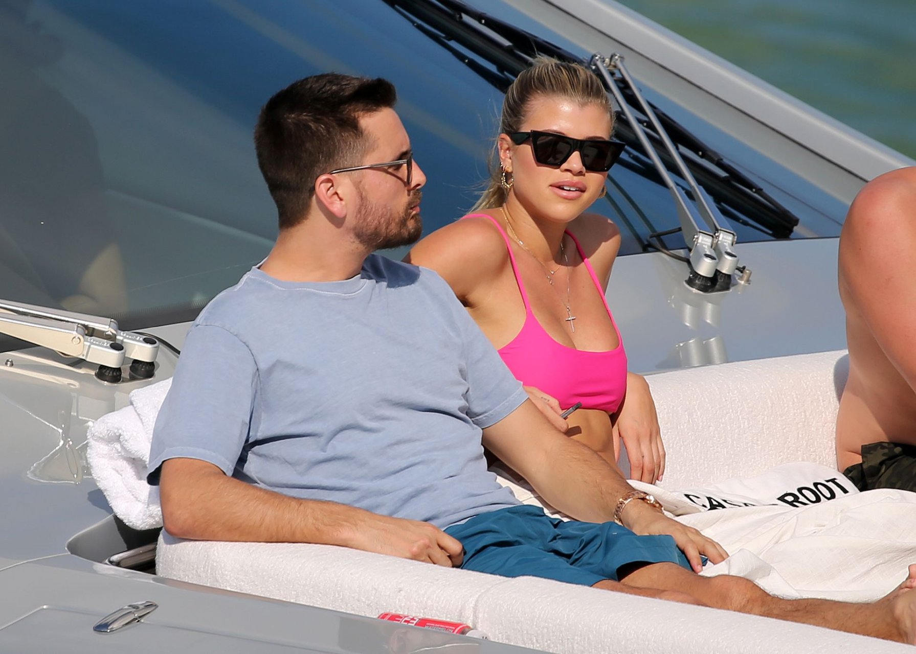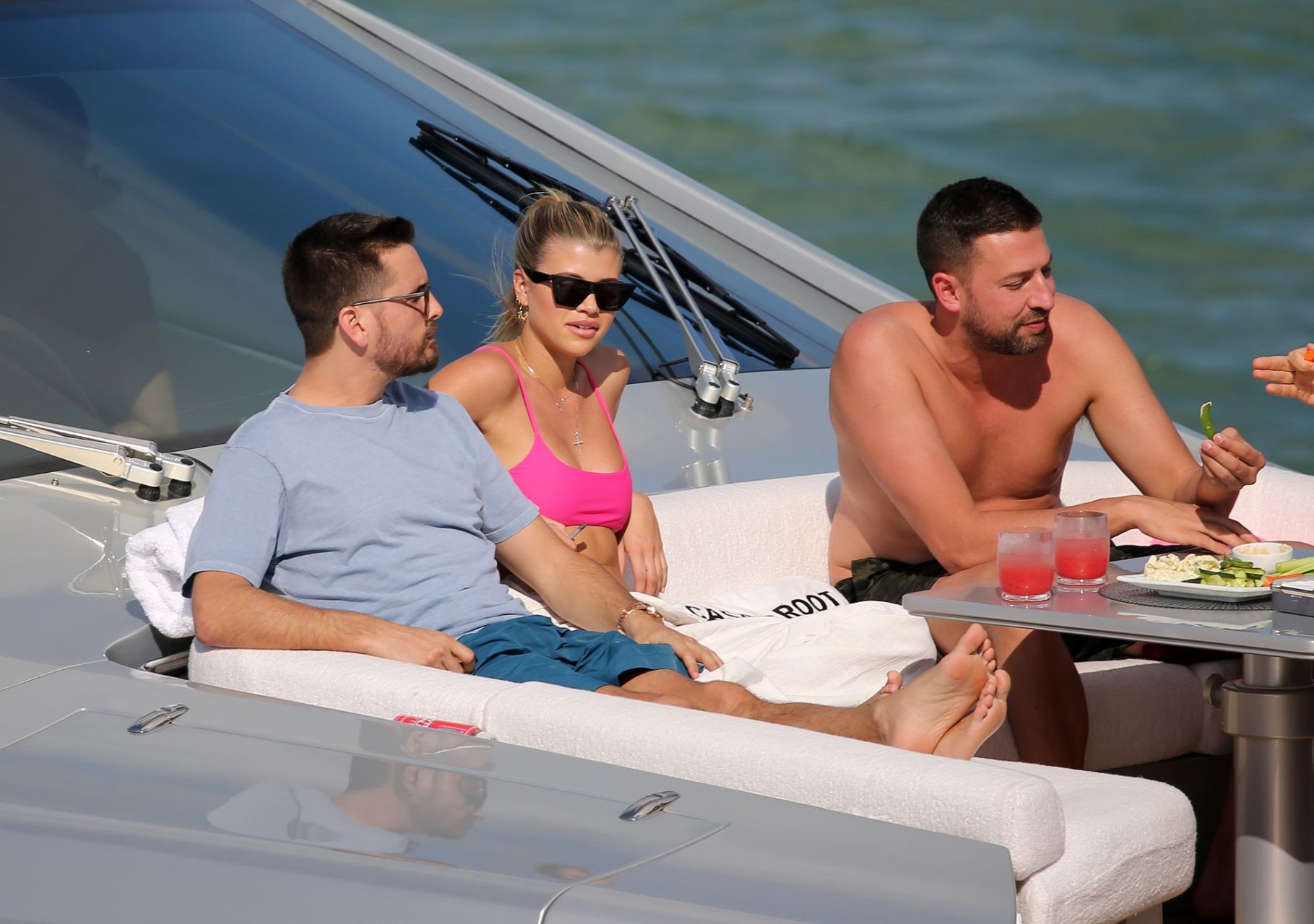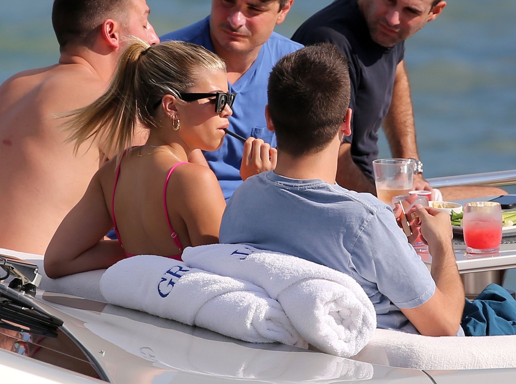 Model Sofia Richie usa um top de biquíni rosa quente enquanto relaxa em um iate com o namorado Scott Disick em Miami, 17/02/2019.