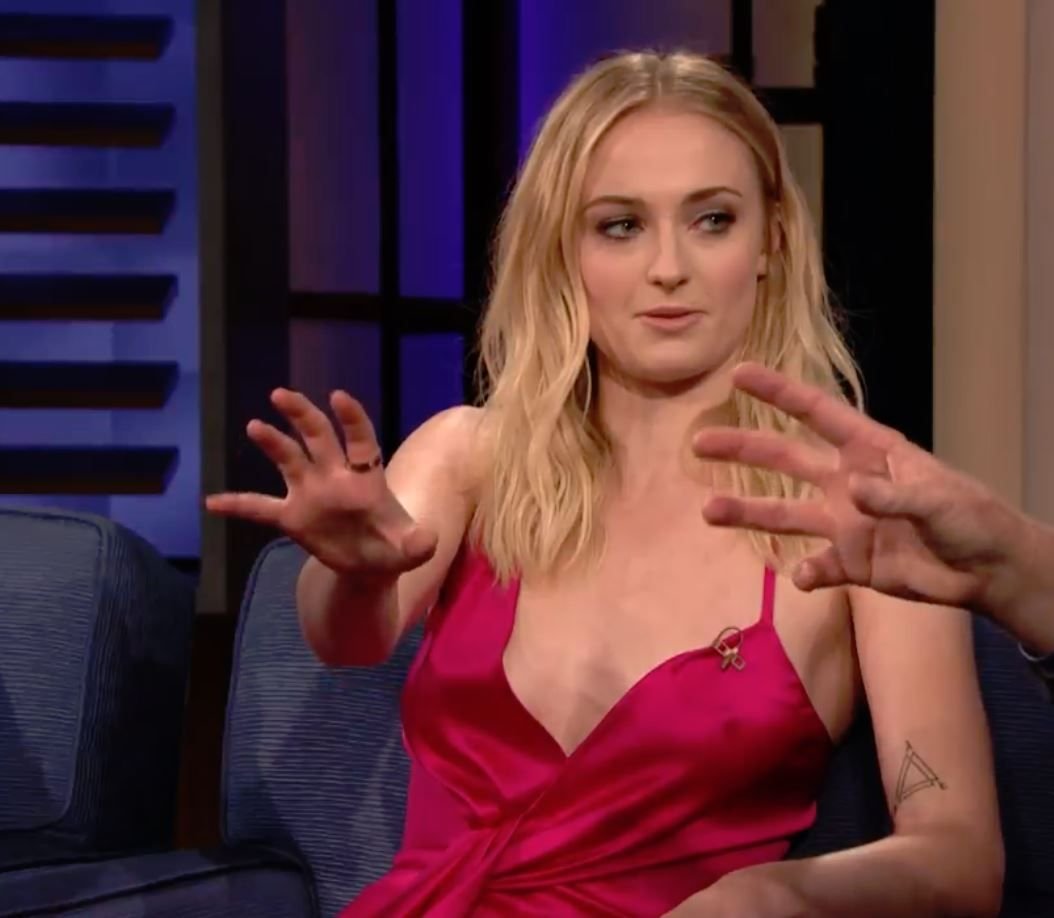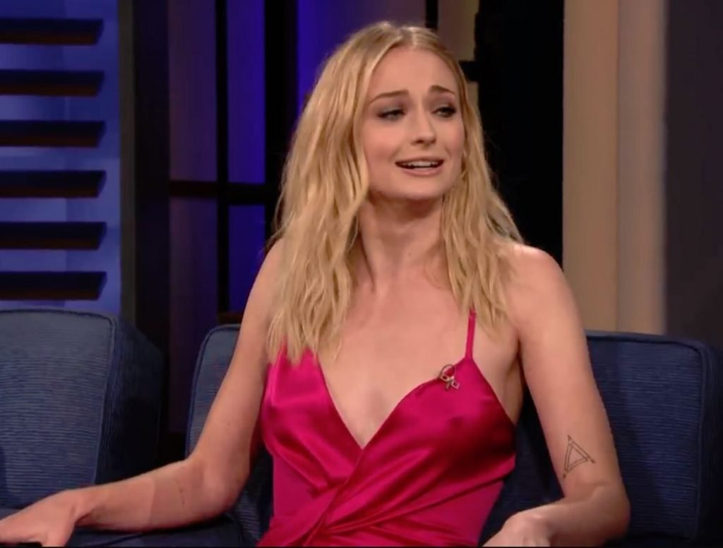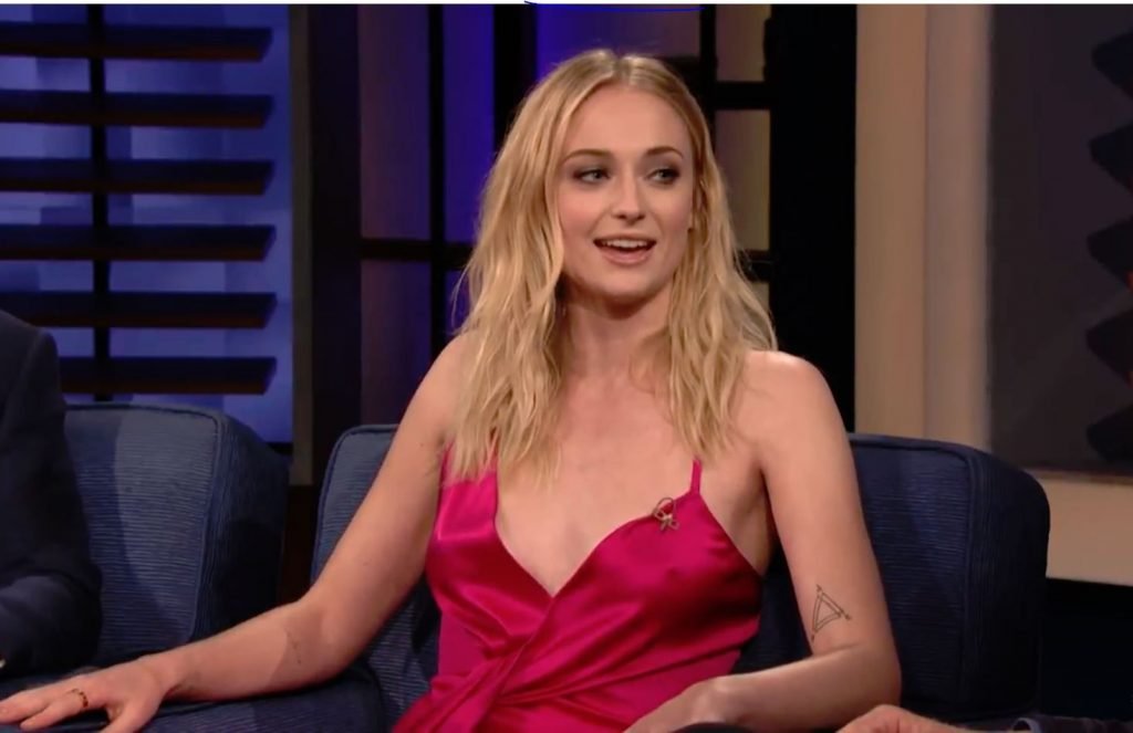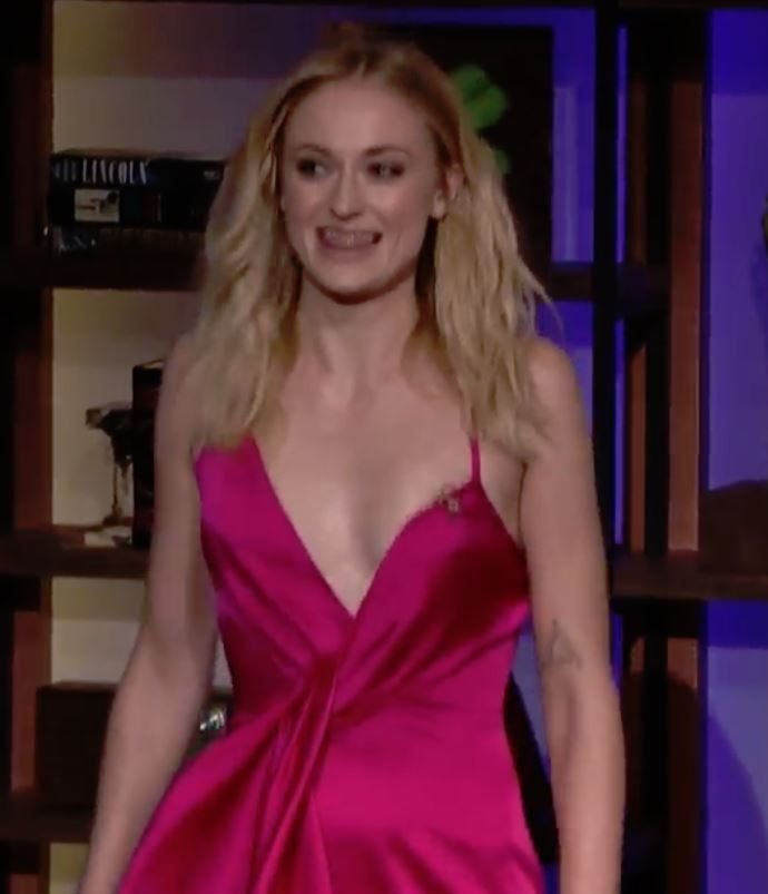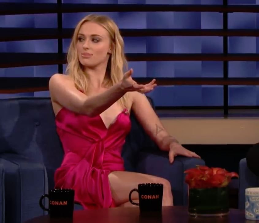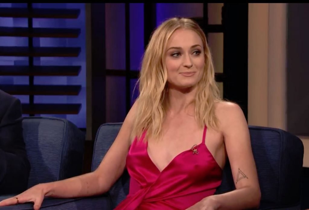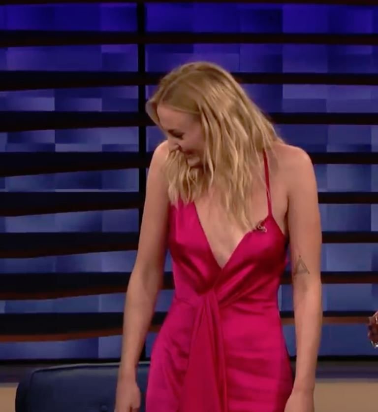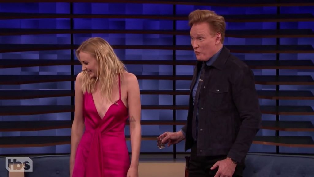A atriz Sophie Turner mostrou seus mamilos duros, vestindo um vestido vermelho no programa Conan, 05/06/2019. Ela contou a Conan O’Brien sobre um copo do Starbucks no episódio 4 da 8ª temporada de “Game of Thrones“.