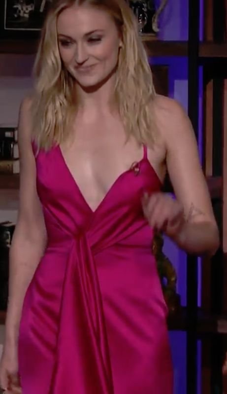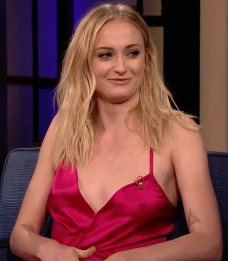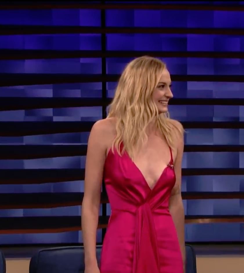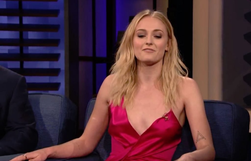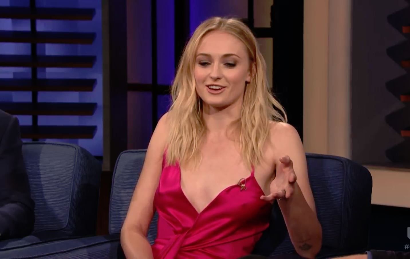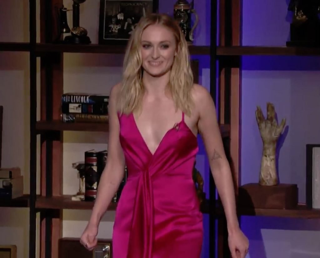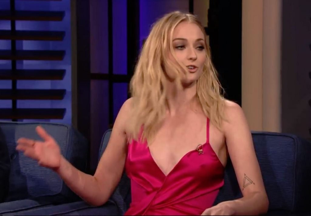 A atriz Sophie Turner mostrou seus mamilos duros, vestindo um vestido vermelho no programa Conan, 05/06/2019. Ela contou a Conan O’Brien sobre um copo do Starbucks no episódio 4 da 8ª temporada de “Game of Thrones“.