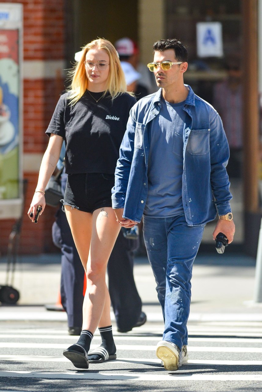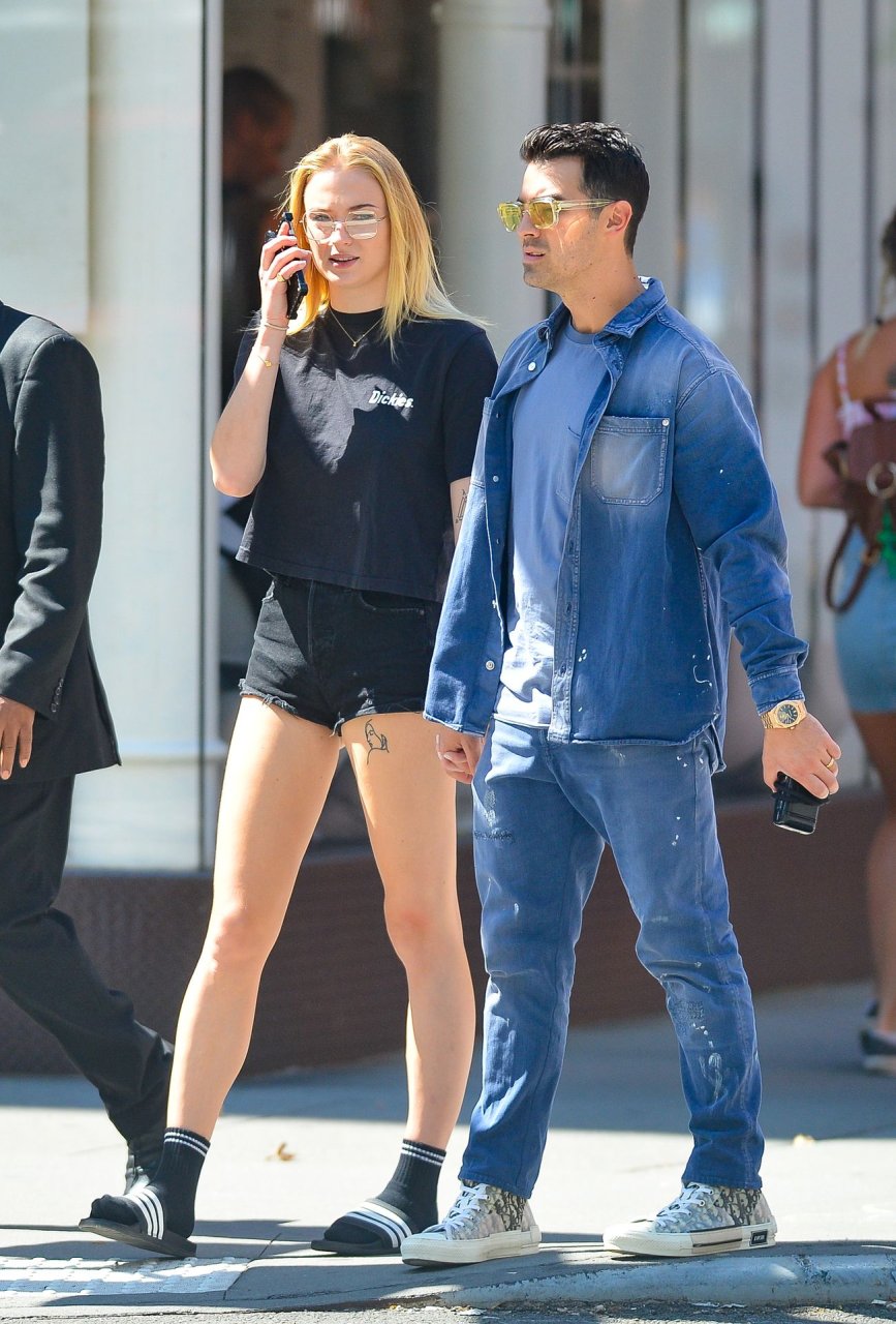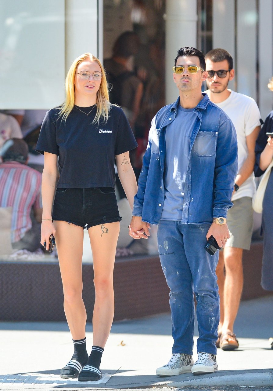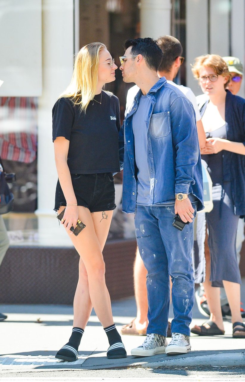 Sophie Turner e Joe Jonas compartilham um beijo na cidade de Nova York, 29/08/2019. A atriz de 23 anos, ex-“Game of Thrones”, usava uma camiseta cropped da Dickies, shorts jeans pretos, meias e sandálias. Jonas optou por um visual double denim combinado com tênis de cano alto.