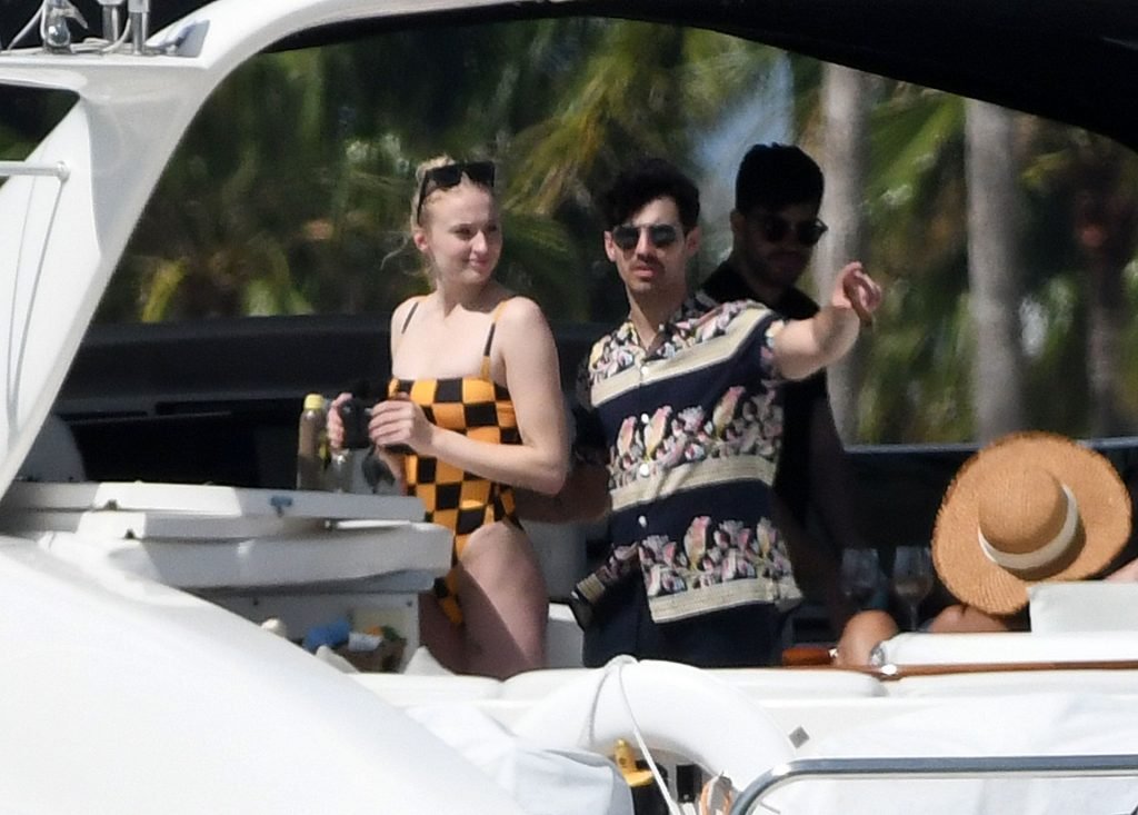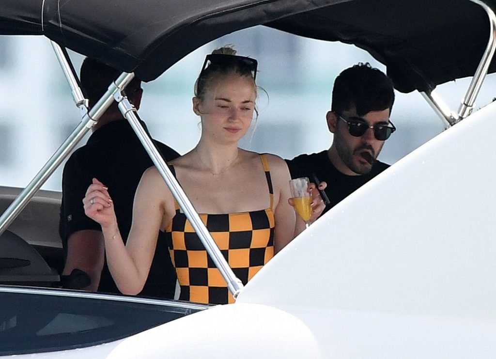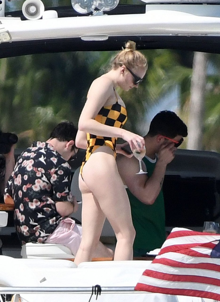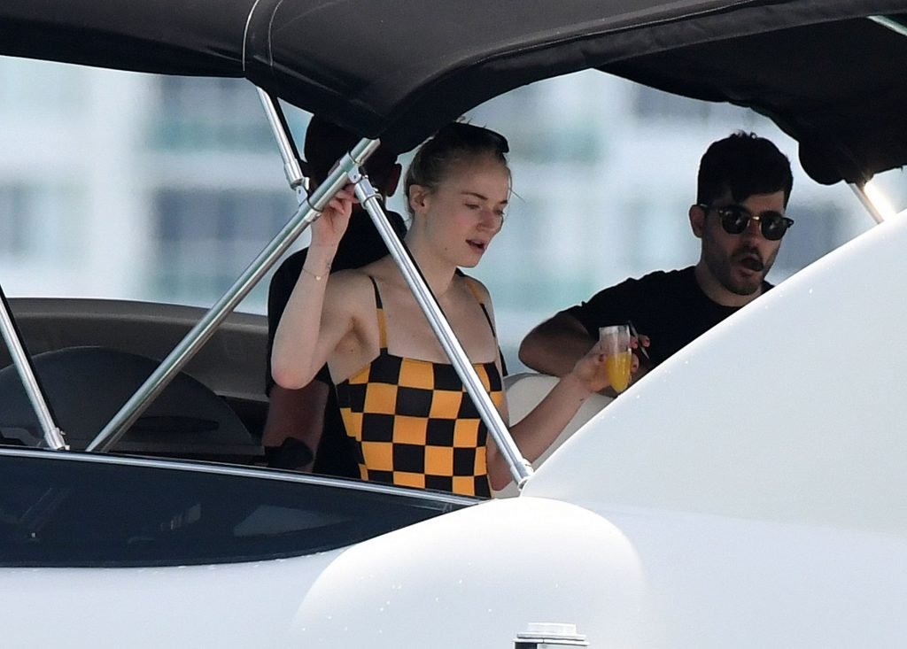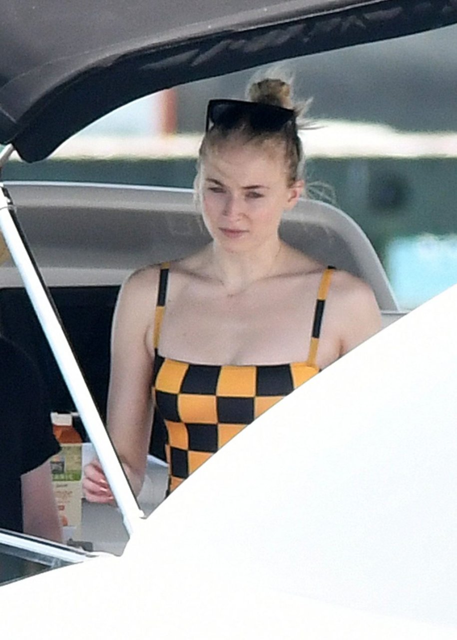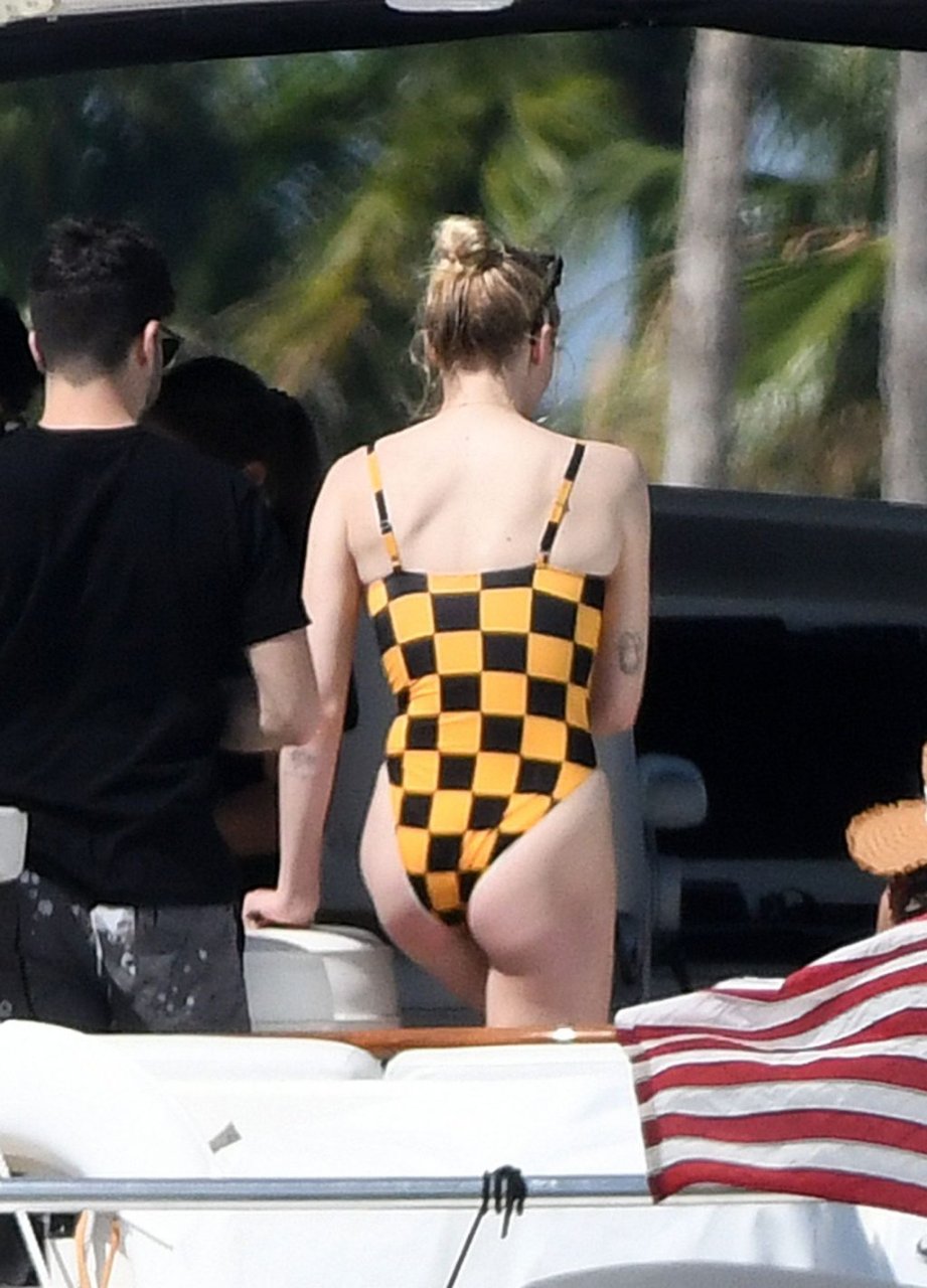 A estrela de “Game of Thrones” Sophie Turner usa um maiô xadrez enquanto curte com The Jonas Brothers e Priyanka Chopra em Miami, 25/03/2019.