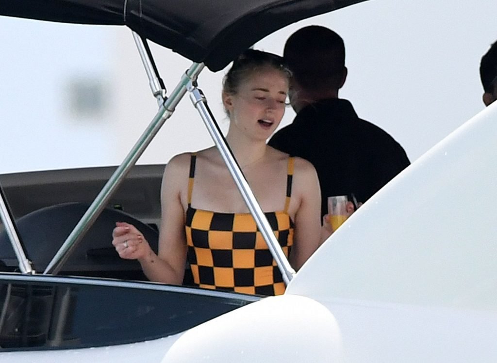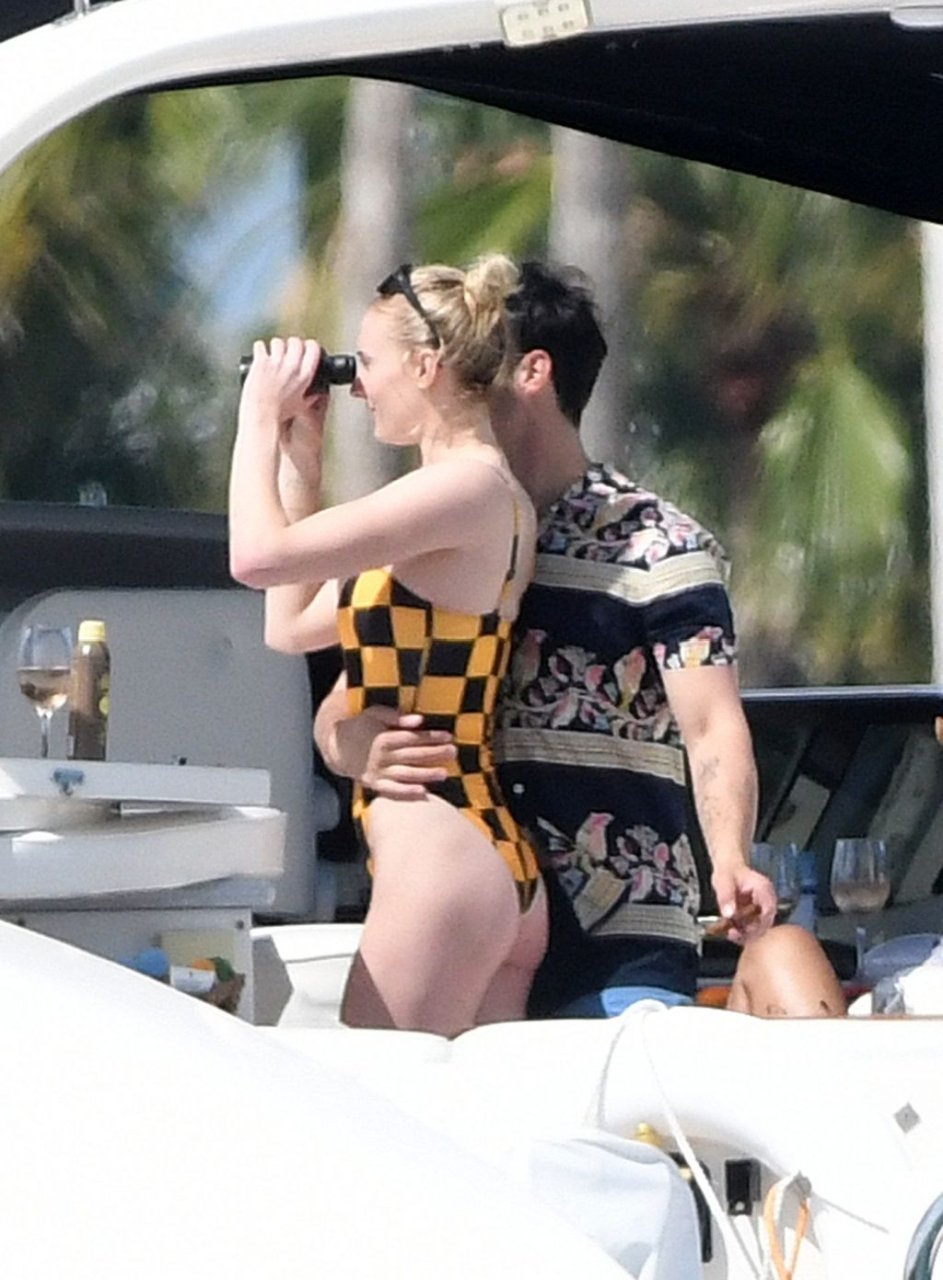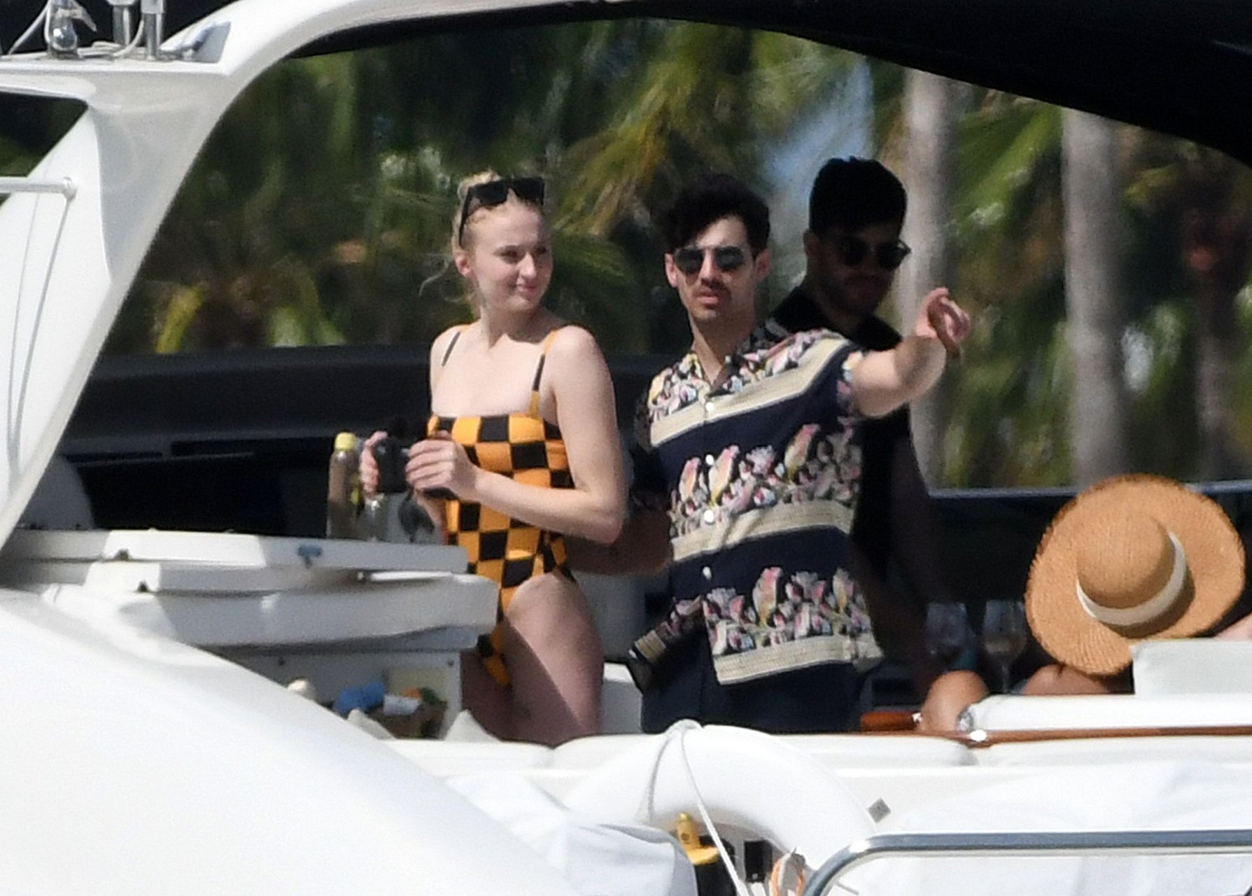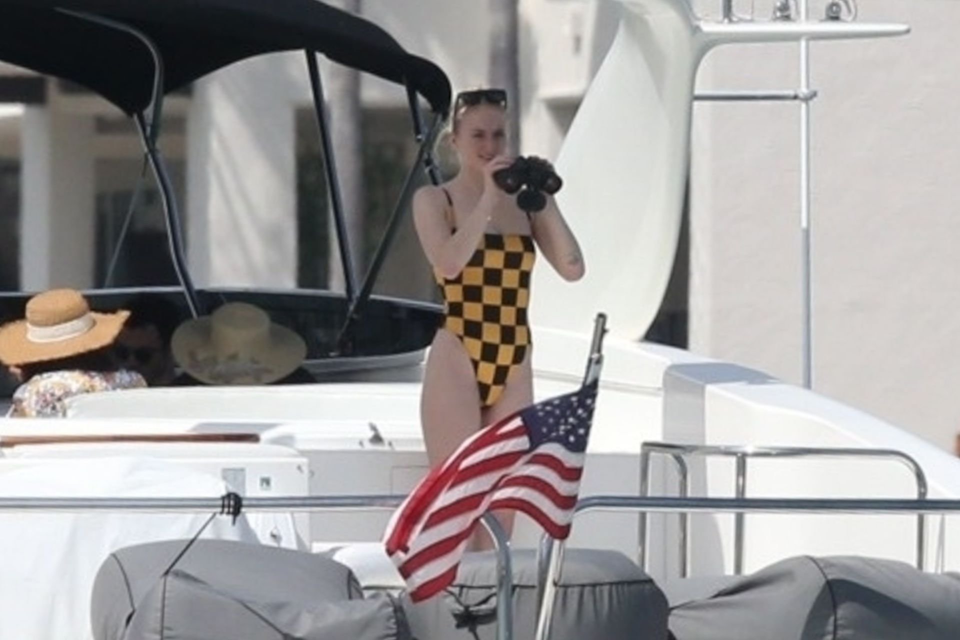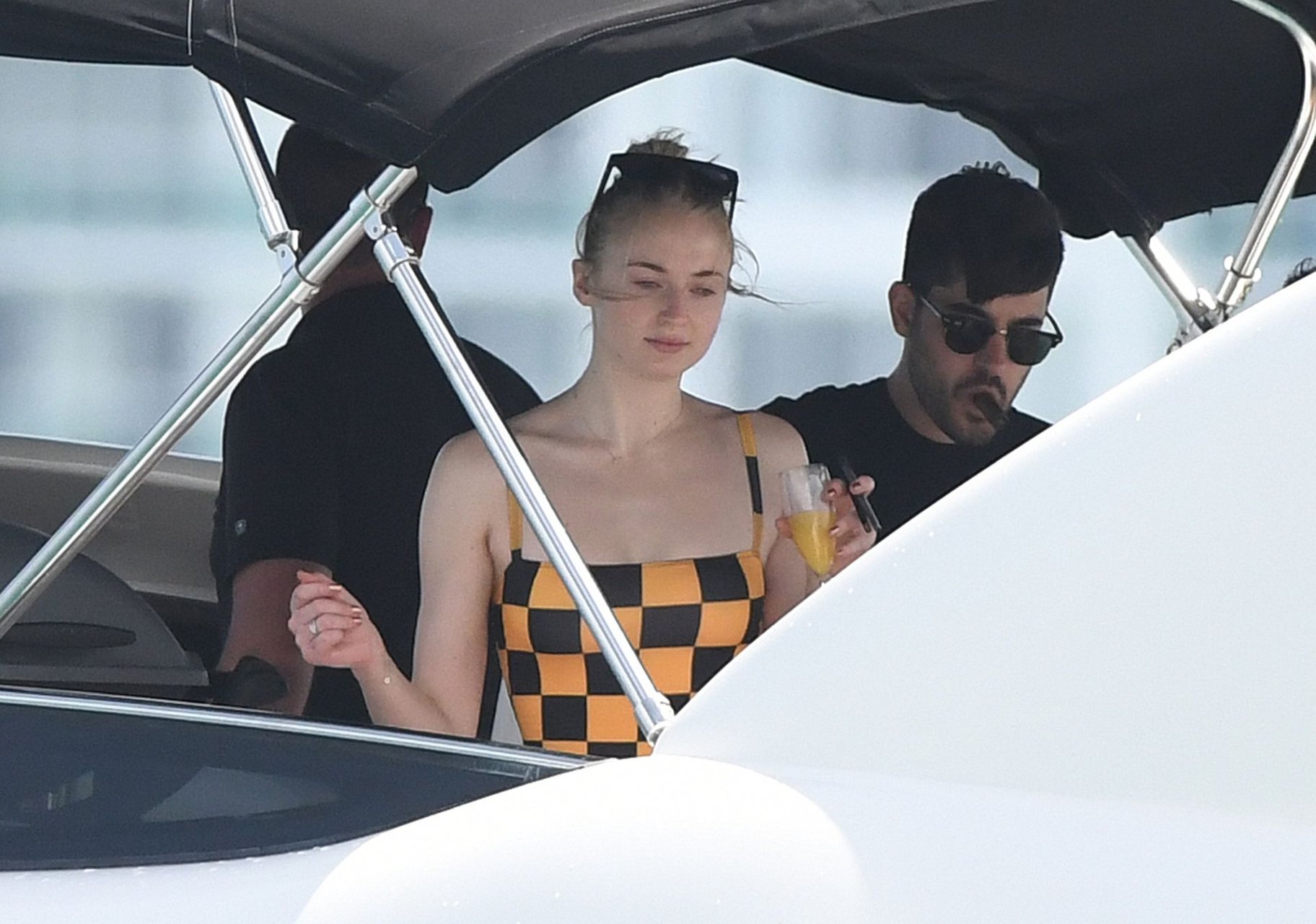 A estrela de “Game of Thrones” Sophie Turner usa um maiô xadrez enquanto curte com The Jonas Brothers e Priyanka Chopra em Miami, 25/03/2019.