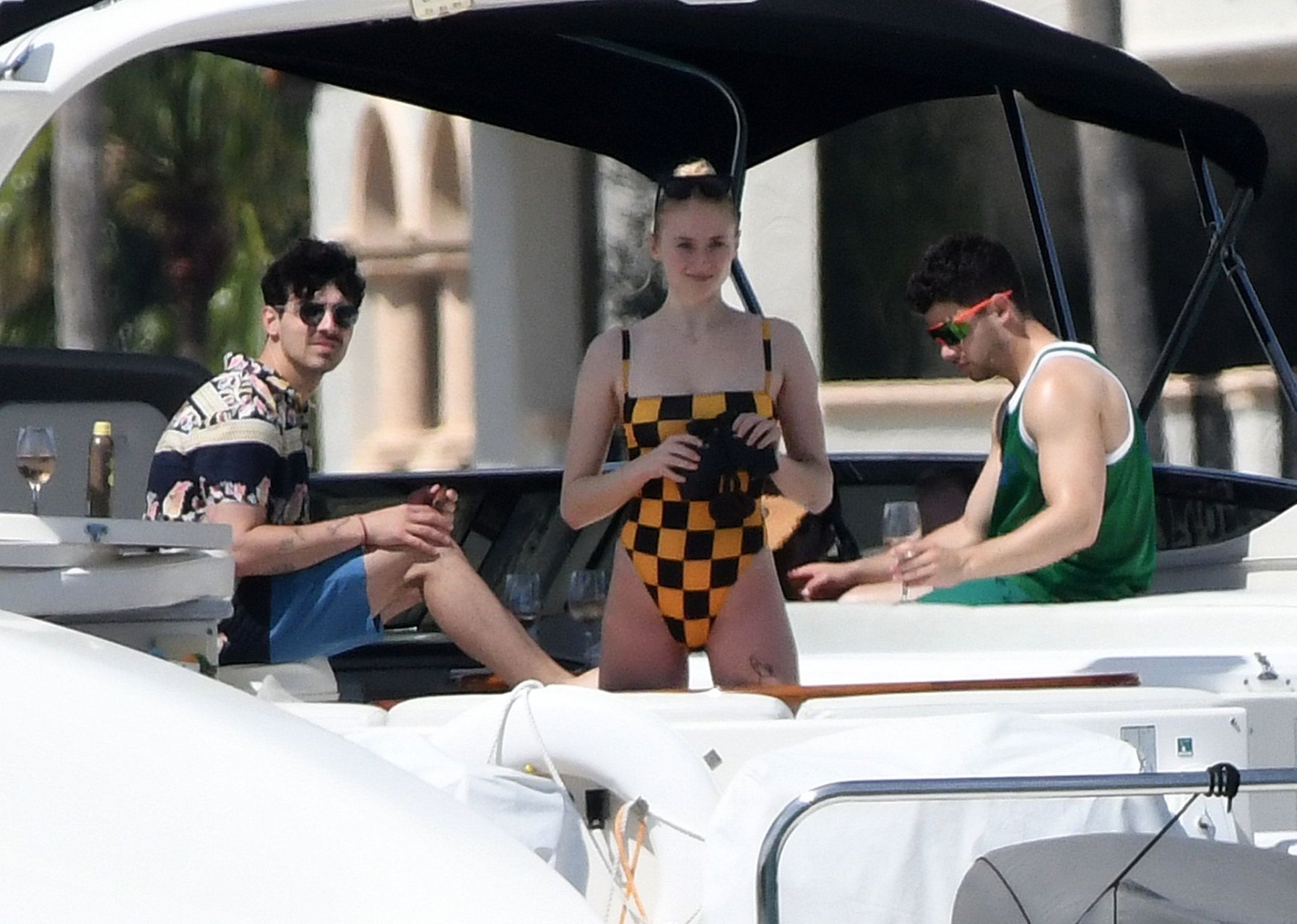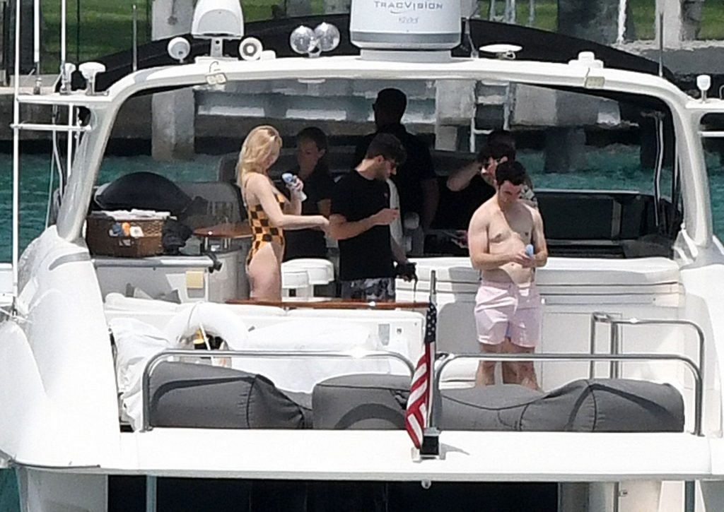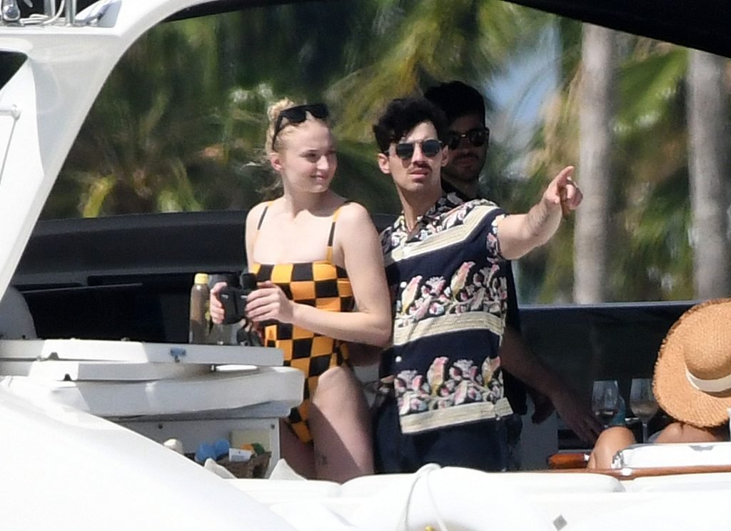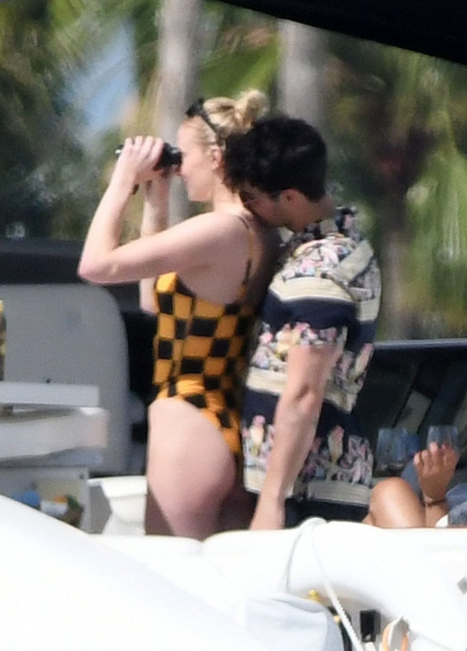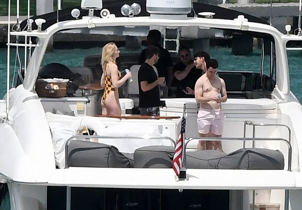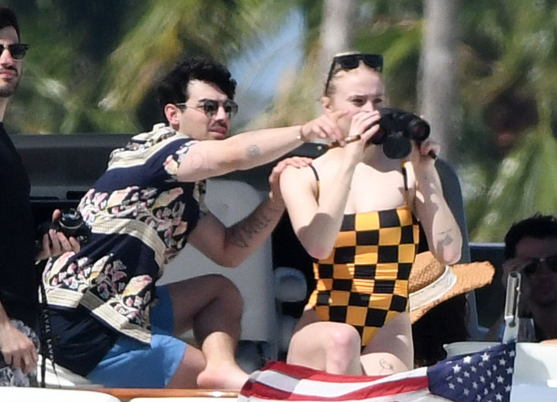 A estrela de “Game of Thrones” Sophie Turner usa um maiô xadrez enquanto curte com The Jonas Brothers e Priyanka Chopra em Miami, 25/03/2019.