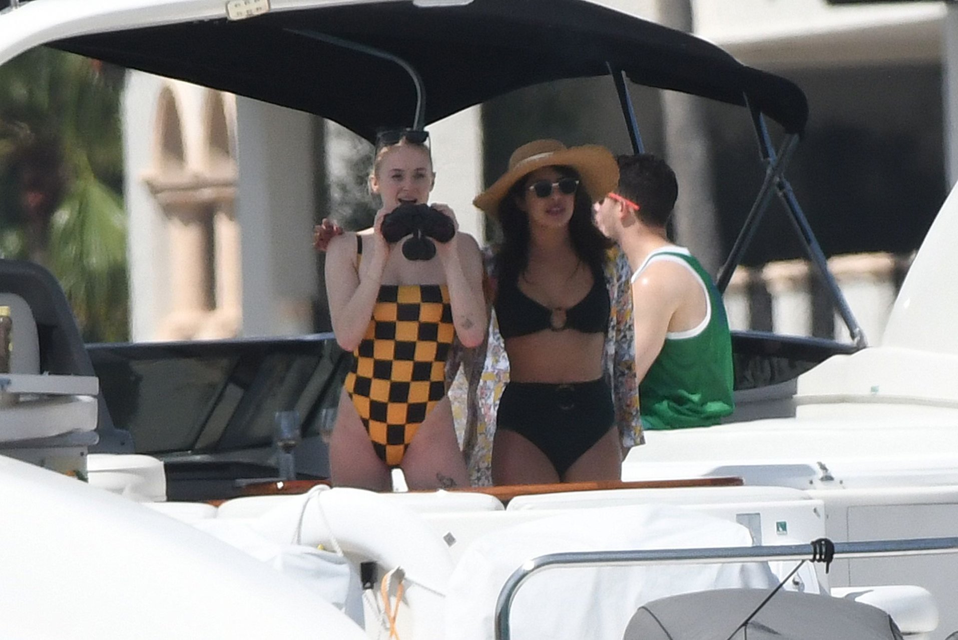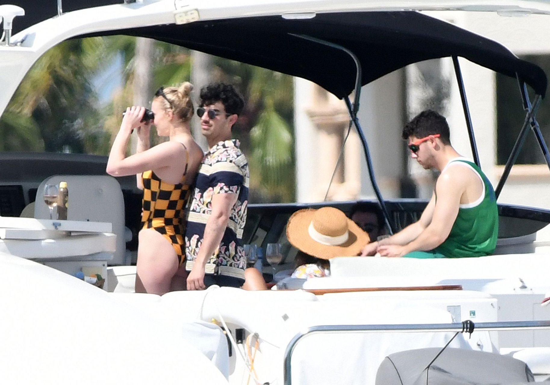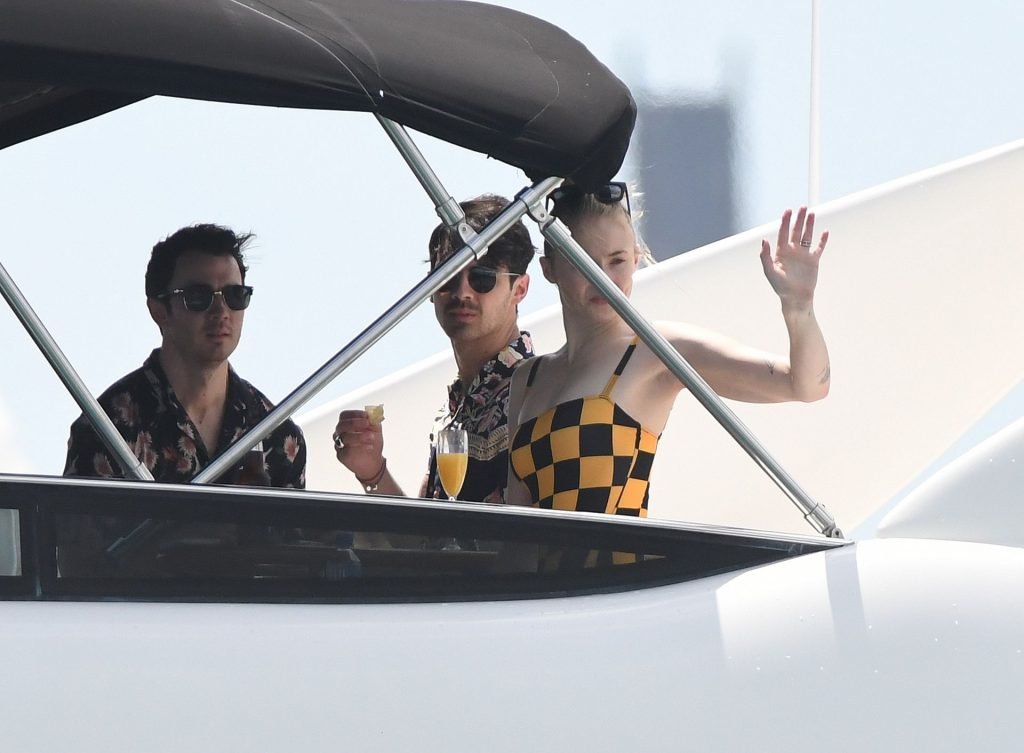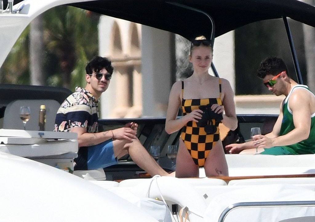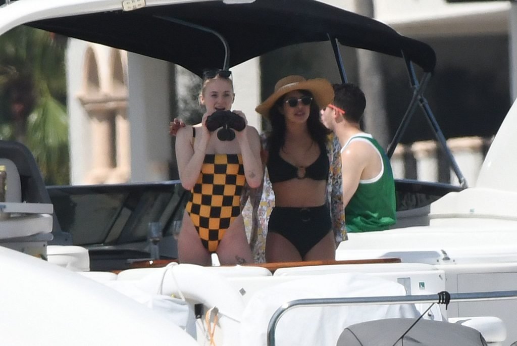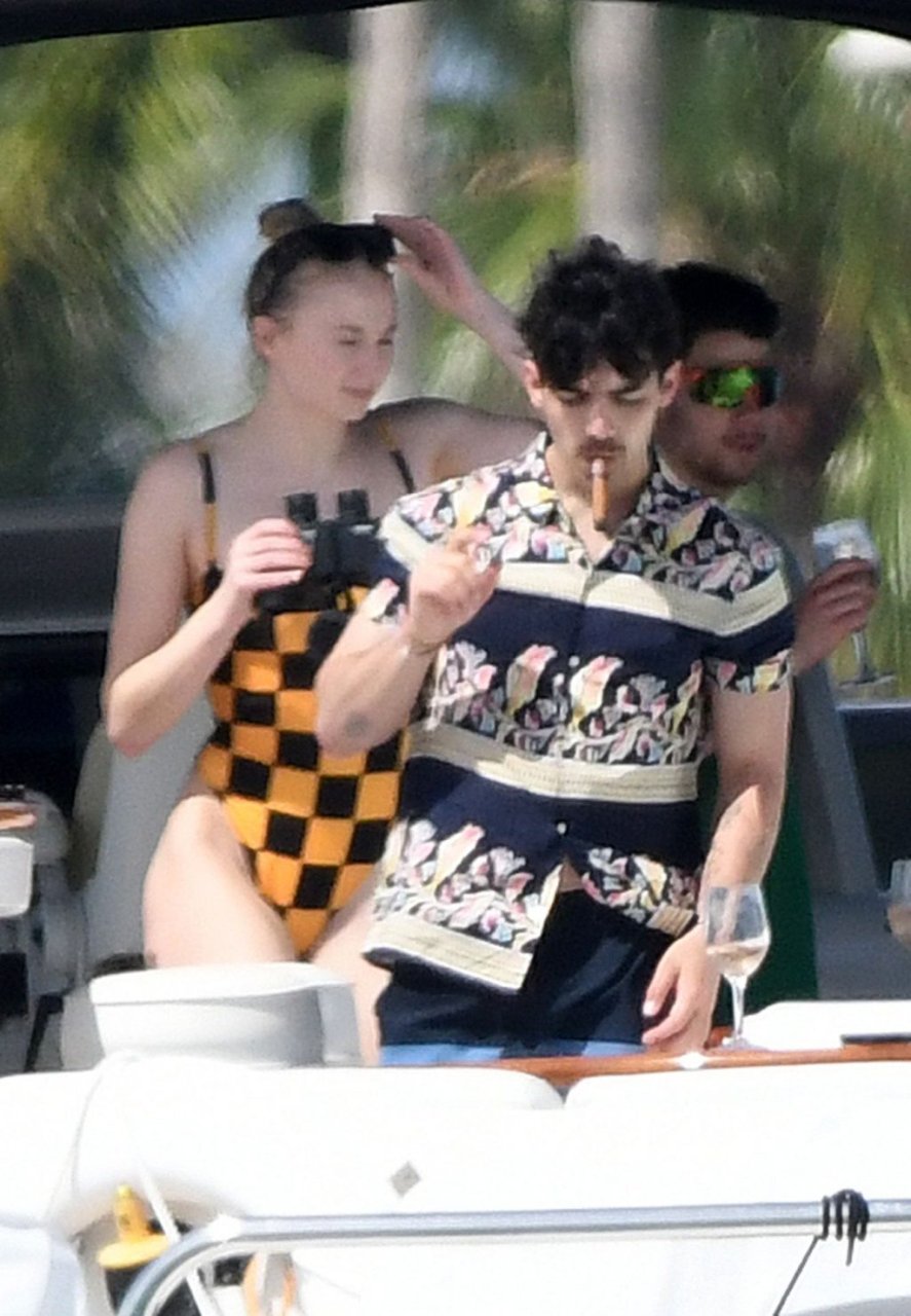 A estrela de “Game of Thrones” Sophie Turner usa um maiô xadrez enquanto curte com The Jonas Brothers e Priyanka Chopra em Miami, 25/03/2019.